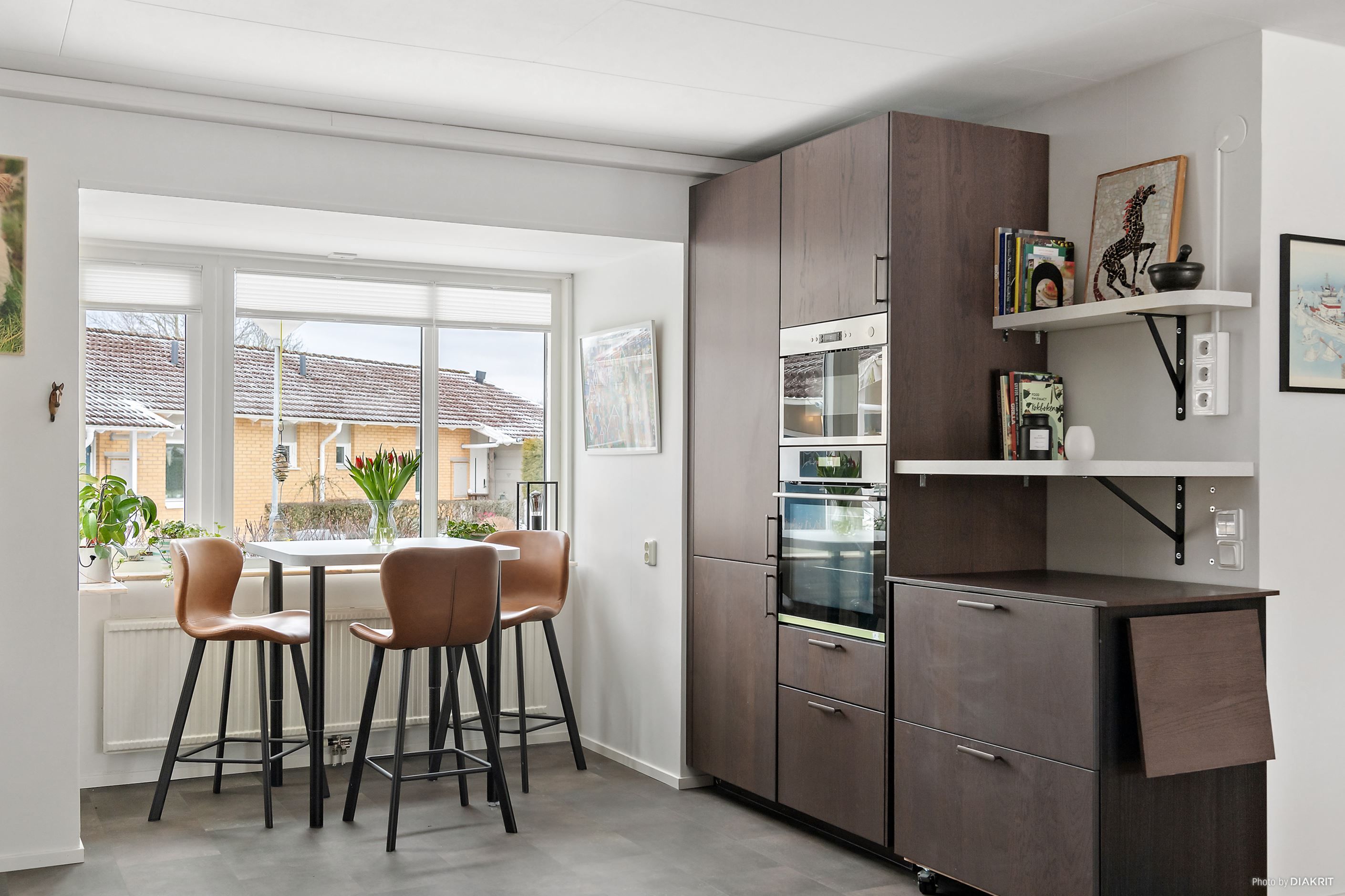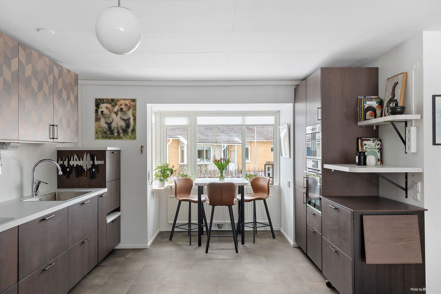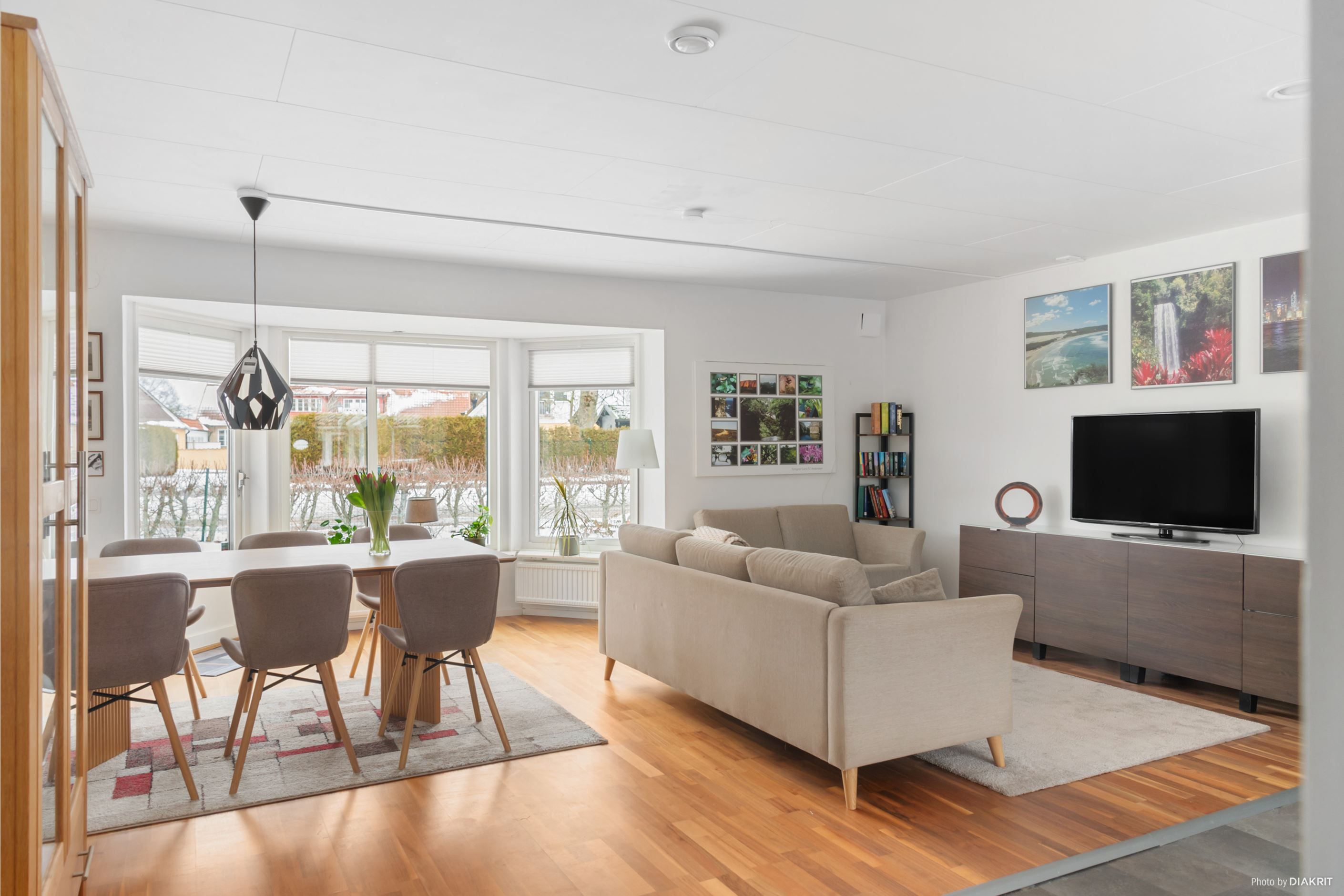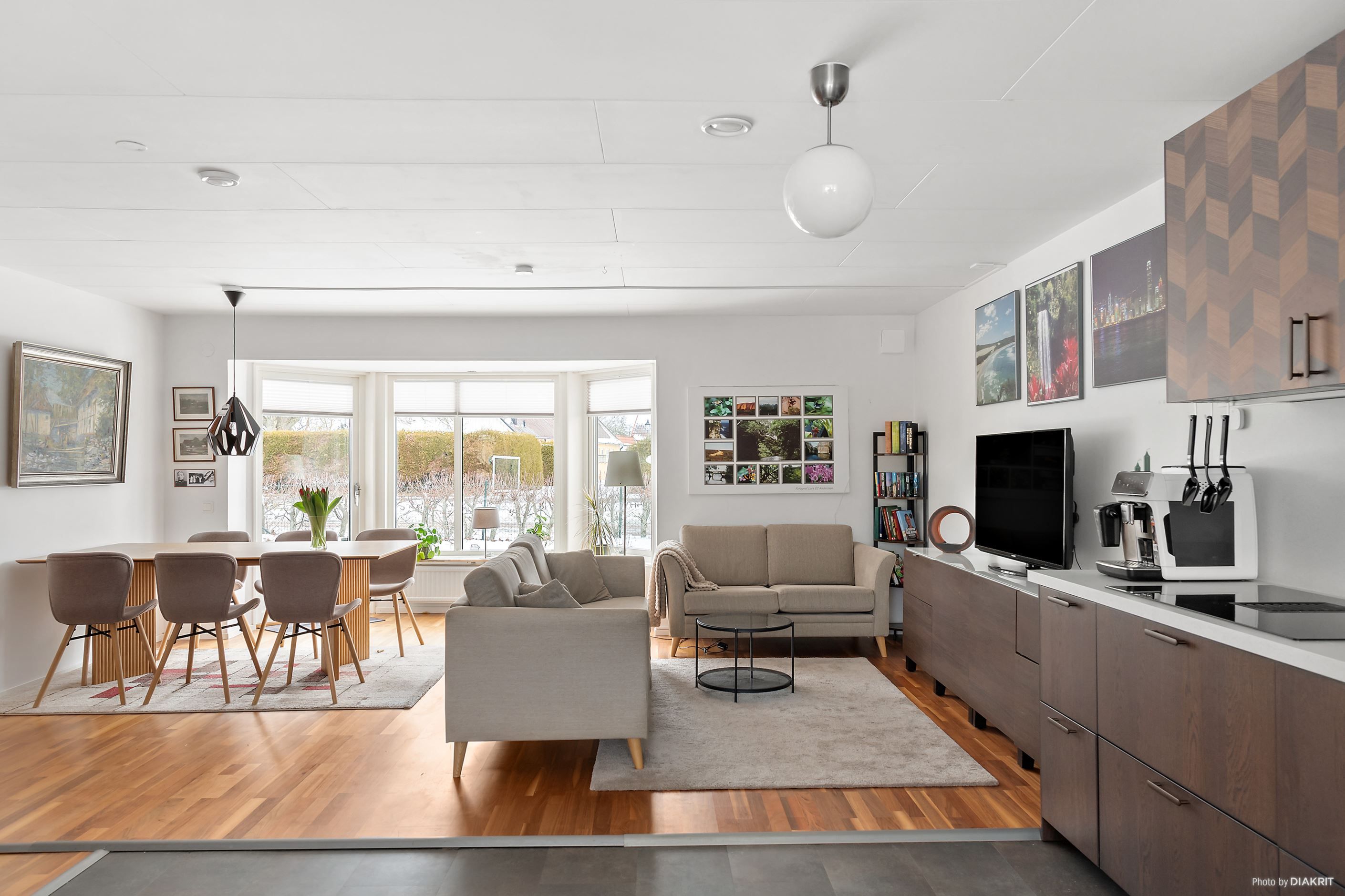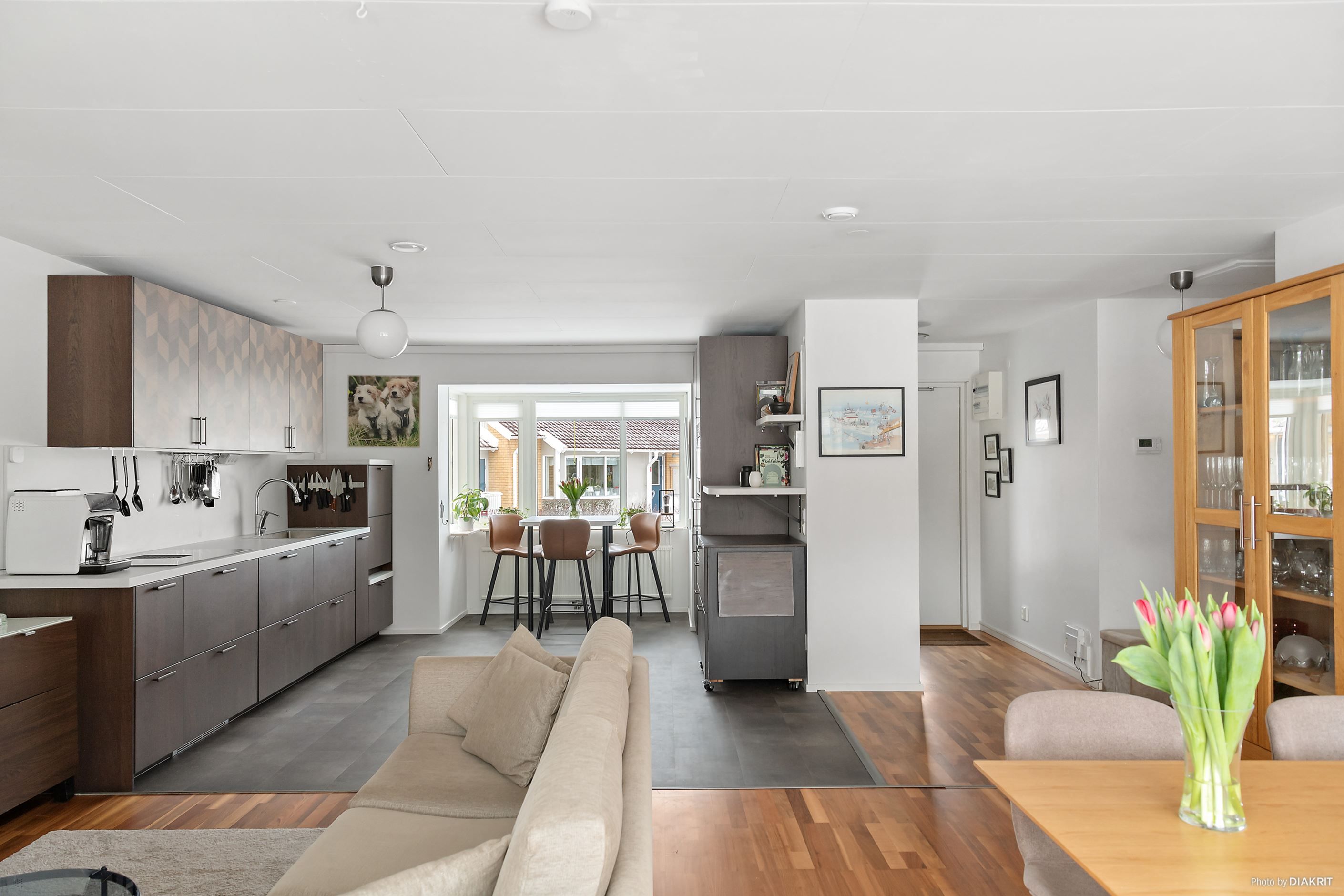 Kök och vardagsrum ligger i öppen och social planlösning och utgör hemmets naturliga samlingspunkt. Det stilrena köket, nyrenoverat 2025, samspelar fint med vardagsrummets generösa ljusinsläpp och skapar en miljö som bjuder in till både vardag och fest. Här finns gott om plats för såväl soffhörna som matbord. Den behagliga värmen i huset bidrar till en trivsam boendemiljö året om. Från vardagsrummet når du trädgården där en stenlagd uteplats möter en lättskött gräsmatta – perfekt för avkoppling, lek och långa sommarkvällar.