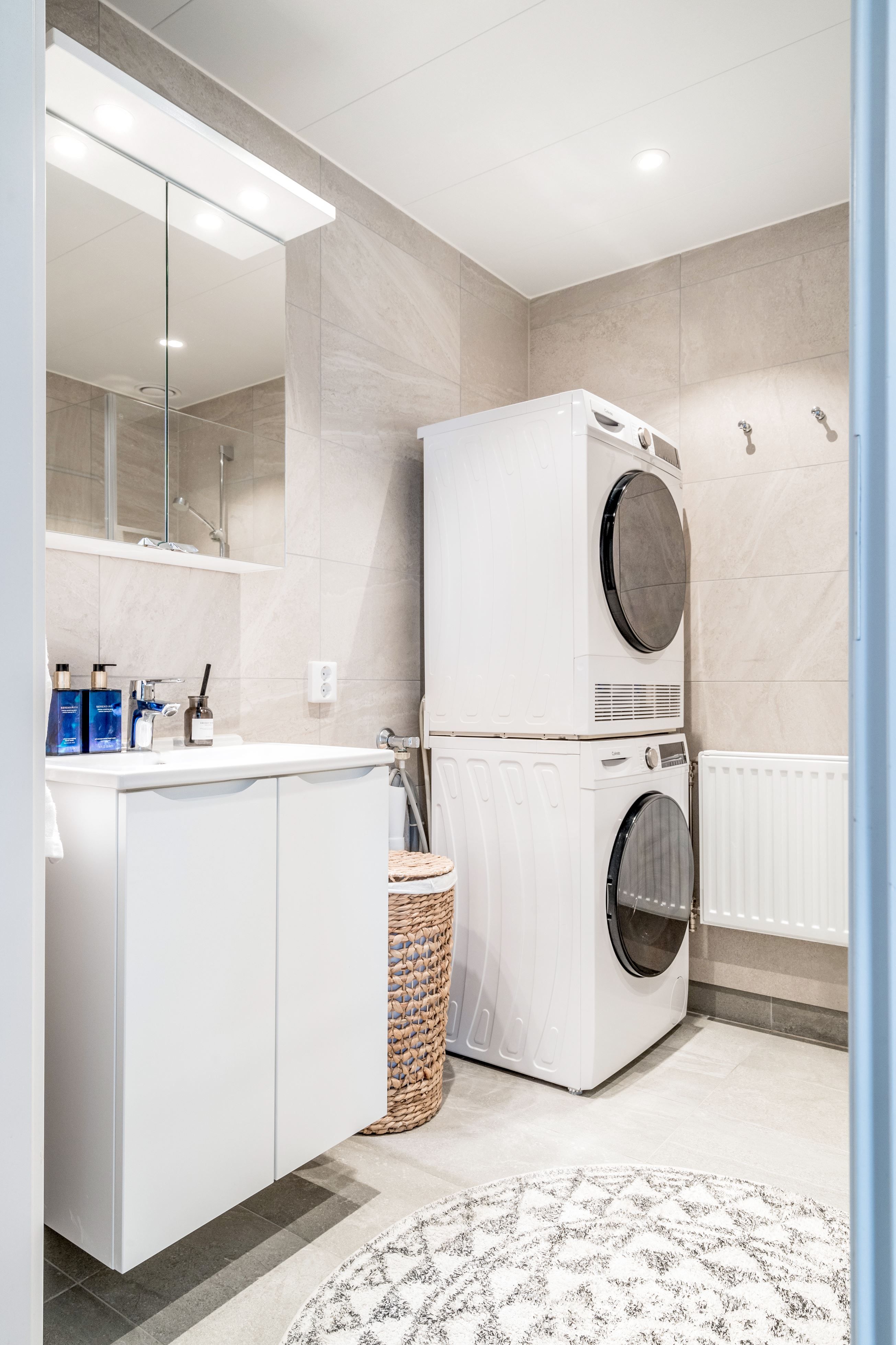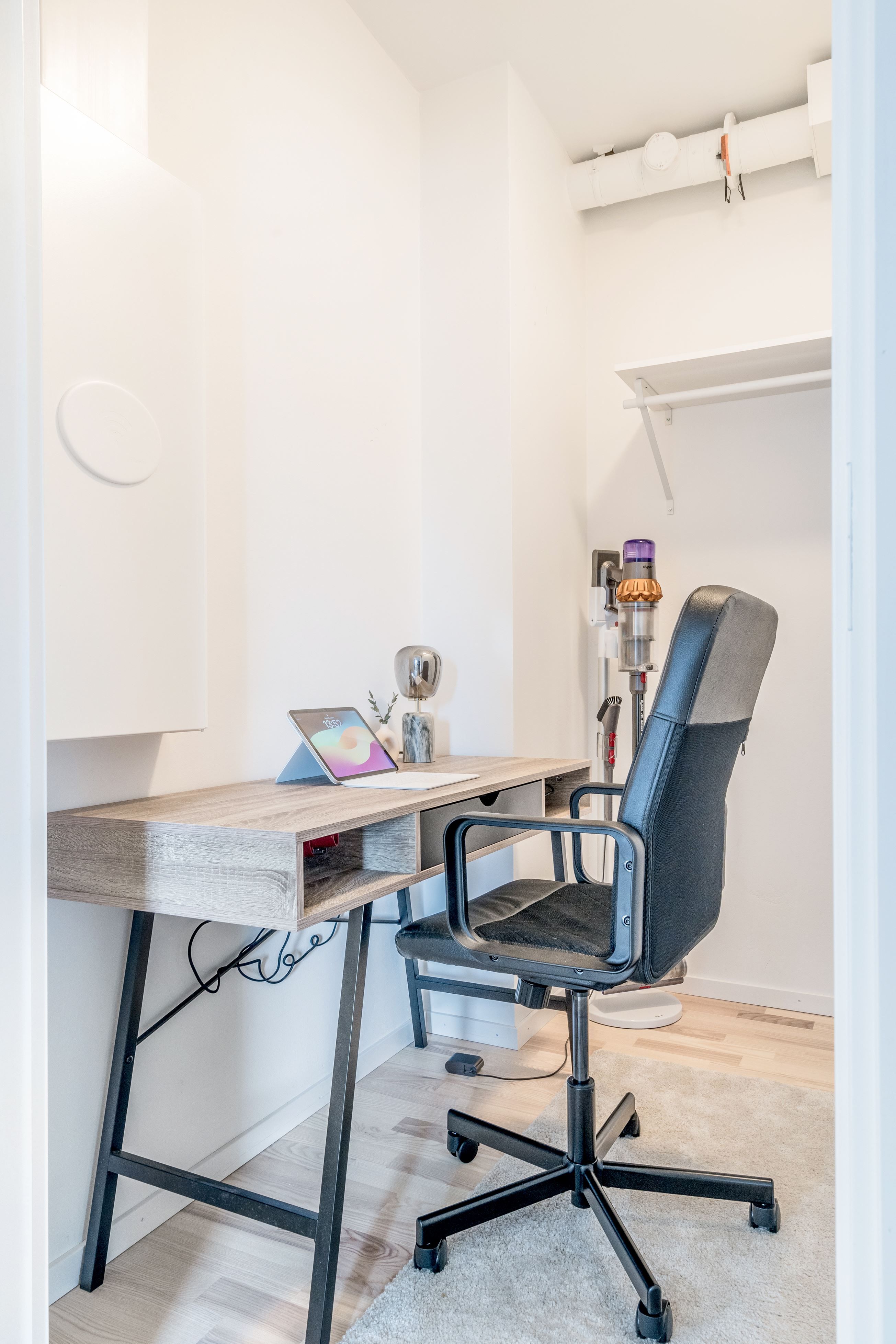Planlösningen är utformad med ett öppet kök och vardagsrum. Det finns två rymliga sovrum med garderober samt ett helkaklat badrum med dusch, torktumlare och tvättmaskin. Lägenheten har även en rymlig klädkammare som även kan nyttjas som kontor, där finns rymliga garderober med skjutdörrar installerade 2024. Lägenheten färdigställdes 2021 och håller fortfarande nyskick med målade väggar och parkettgolv. Samtliga vitvaror har fortfarande garanti.