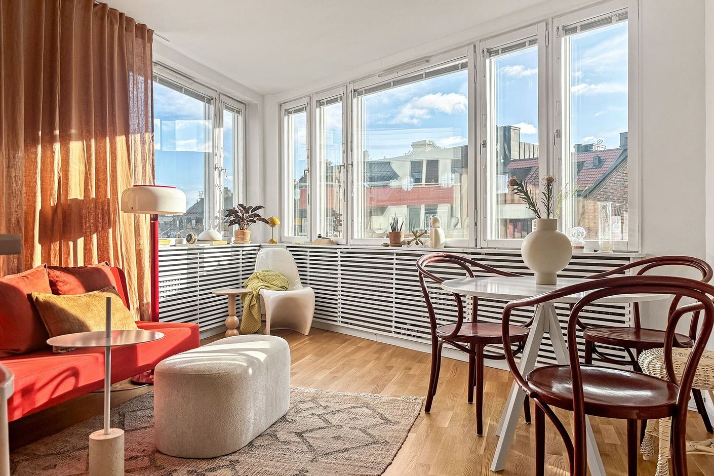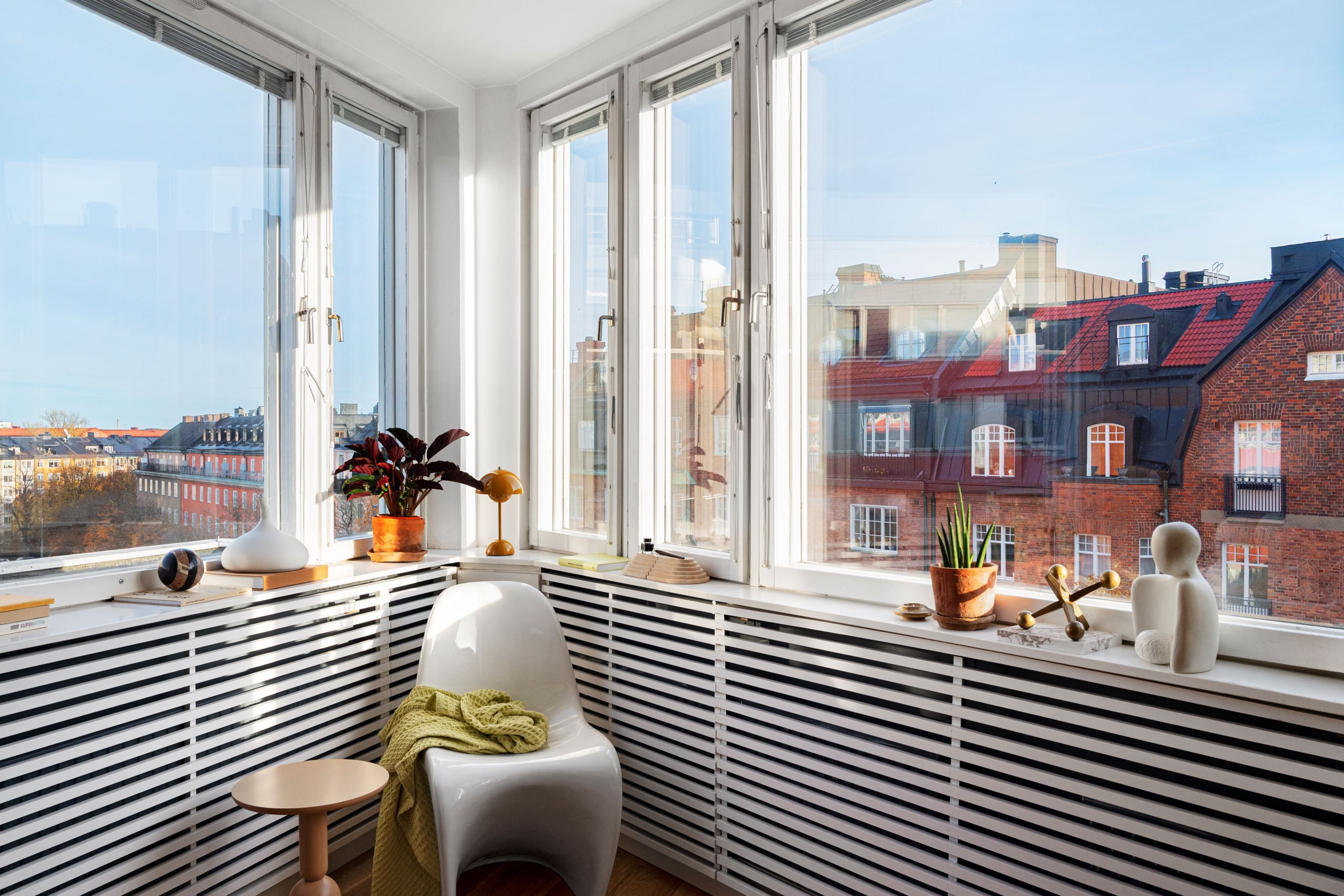 soliga Värtavägen och den vackra fontänen på Karlaplan. Genomtänkt öppen planlösning mellan kök och vardagsrum, vilket ger en social yta där ljuset flödar in och rymden maximeras – perfekt för både vardagsliv och umgänge.