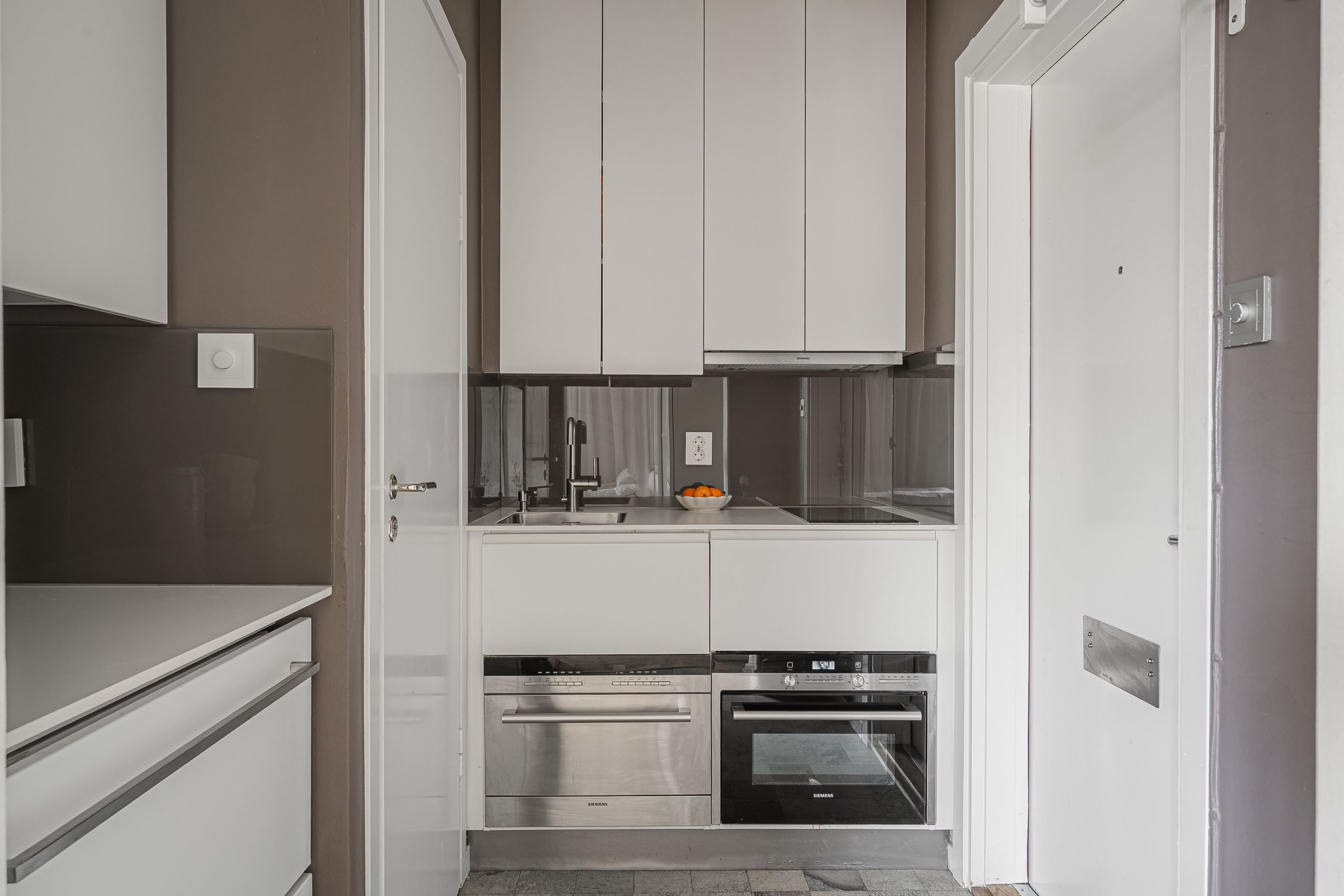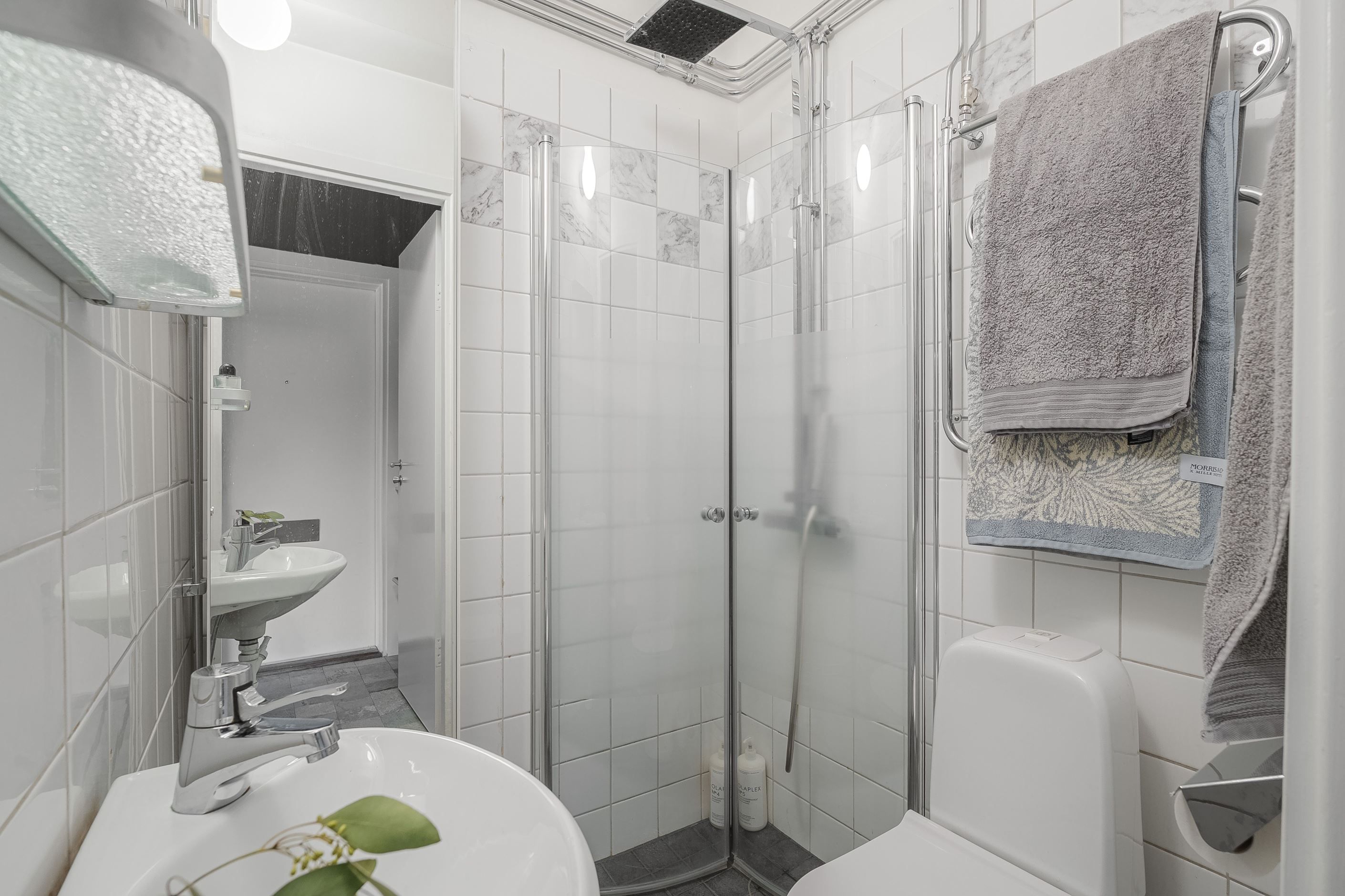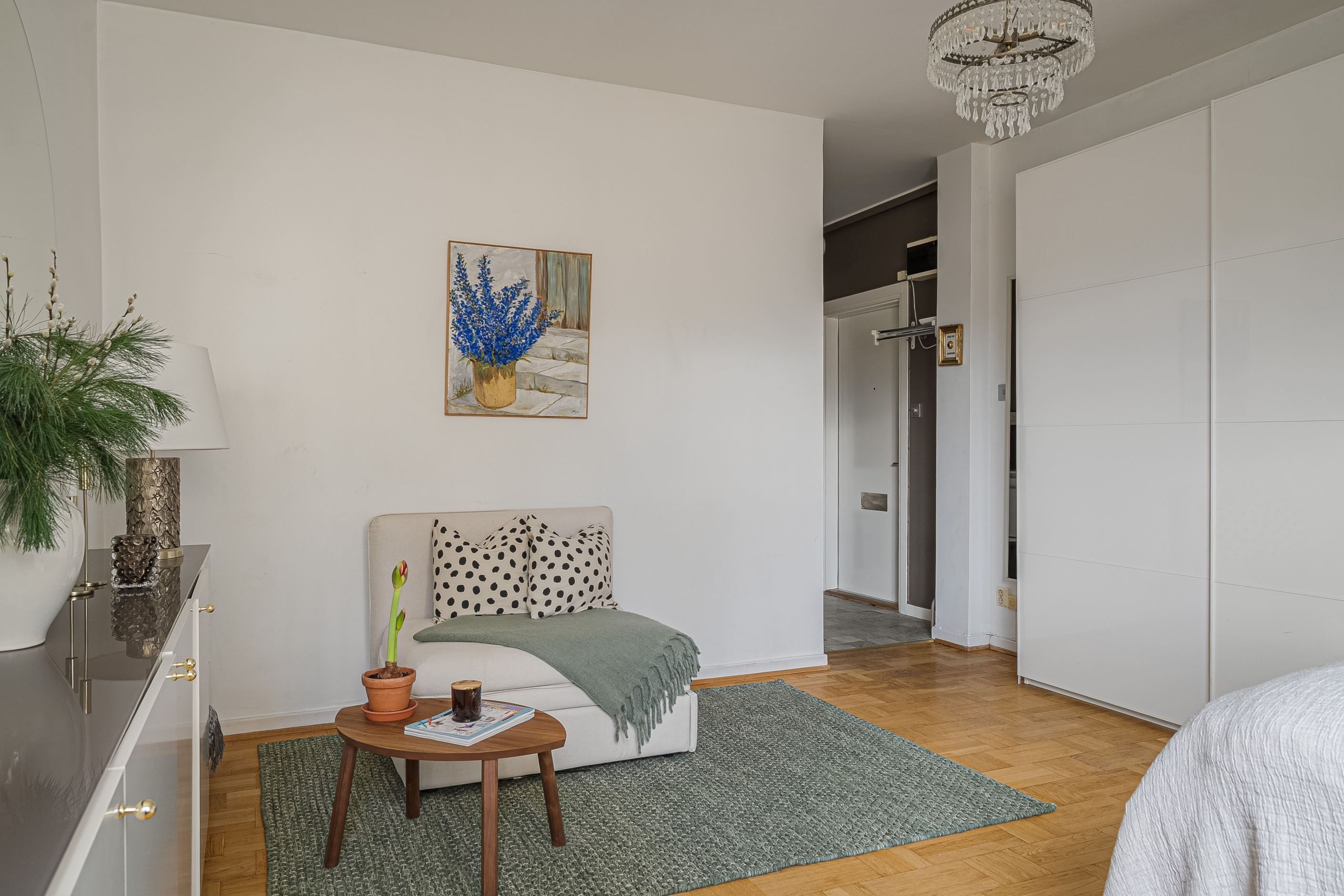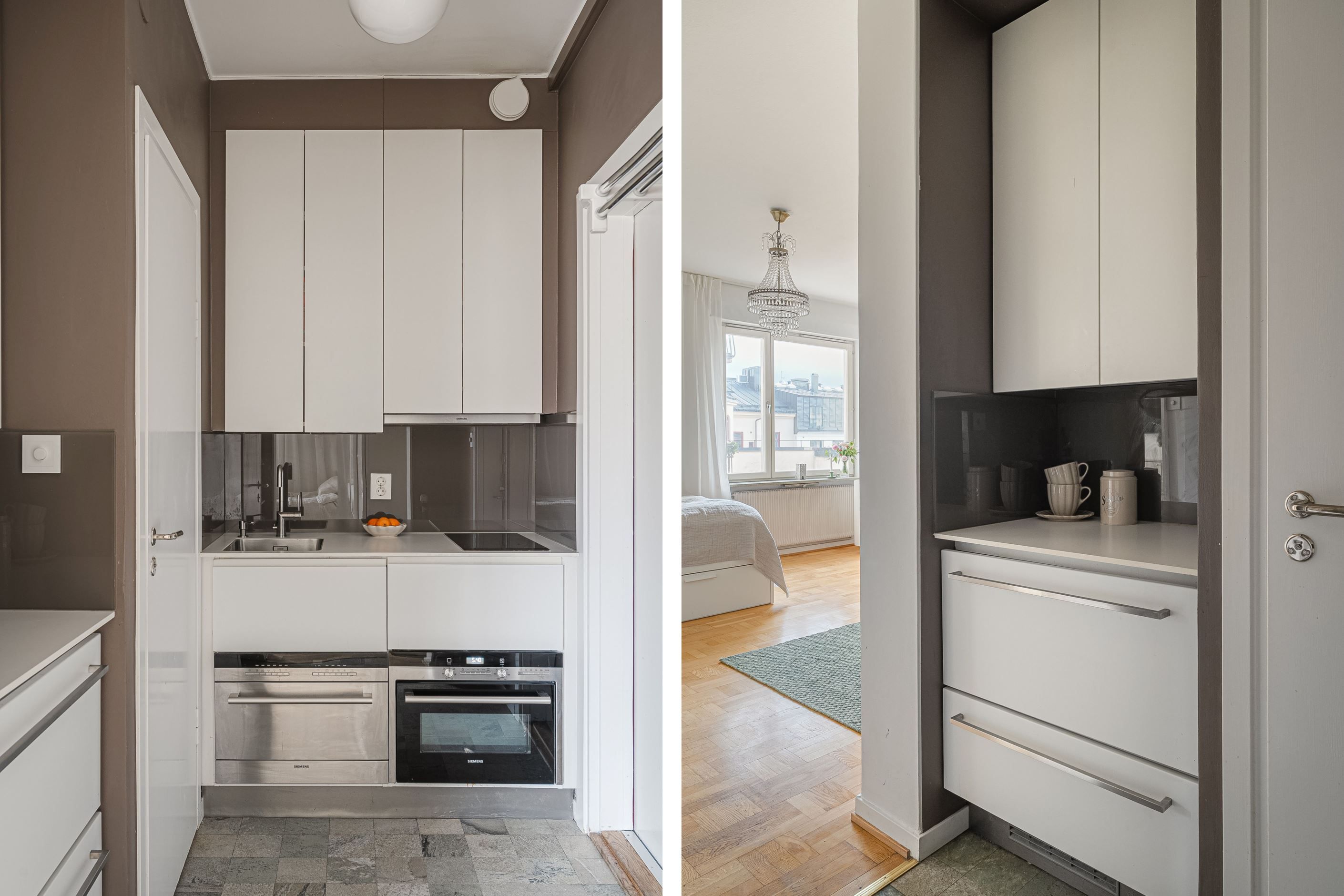 Bostaden har en smart och funktionell planlösning som på ett naturligt sätt rymmer säng, soffgrupp och matplats om så önskas. Köket är fullt utrustat med häll, ugn, diskmaskin, diskho och kyl. Lägenheten är målad i stilrena kulörer och erbjuder gott om förvaring i rymliga garderober, vilket skapar en både praktisk och hemtrevlig bostad.