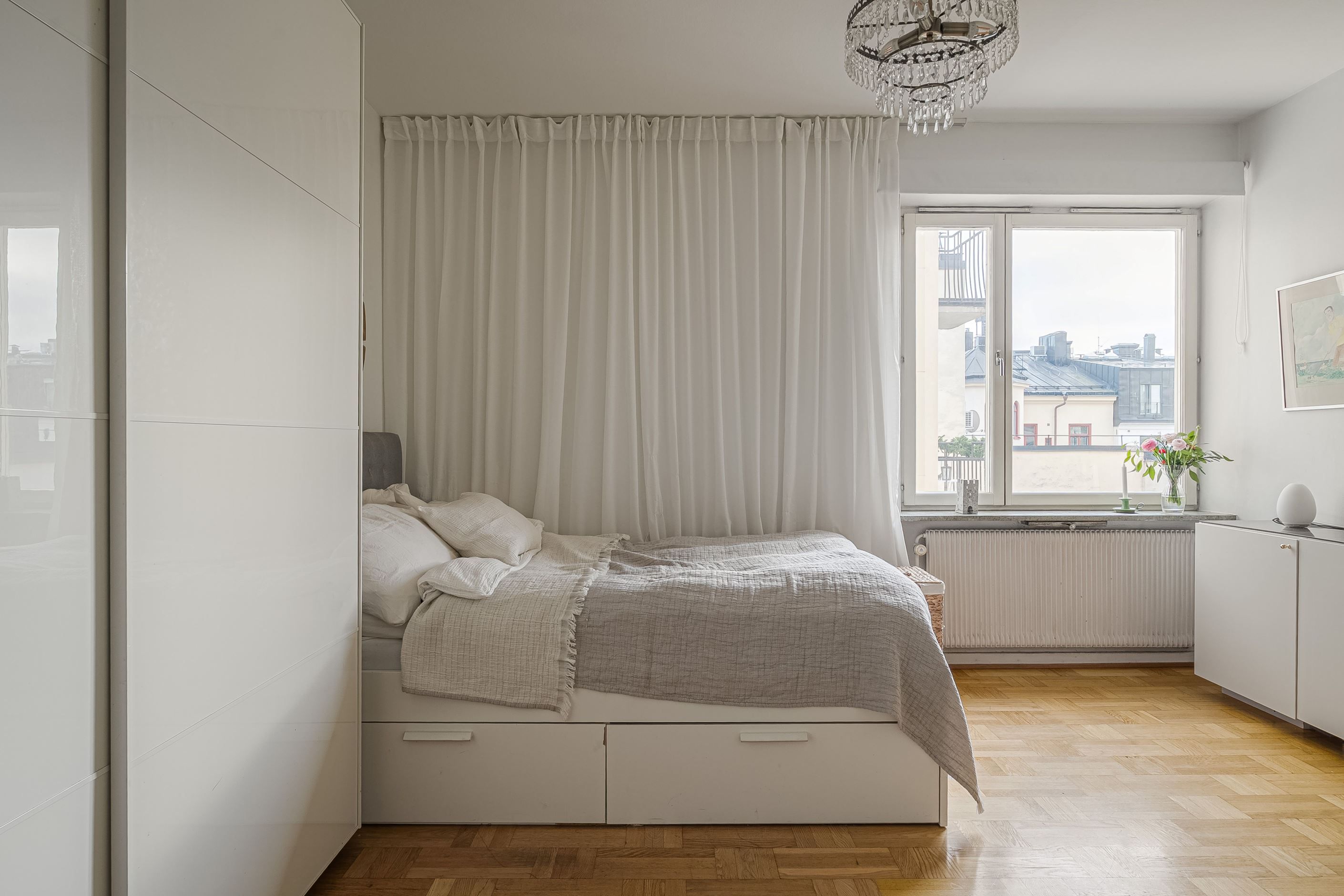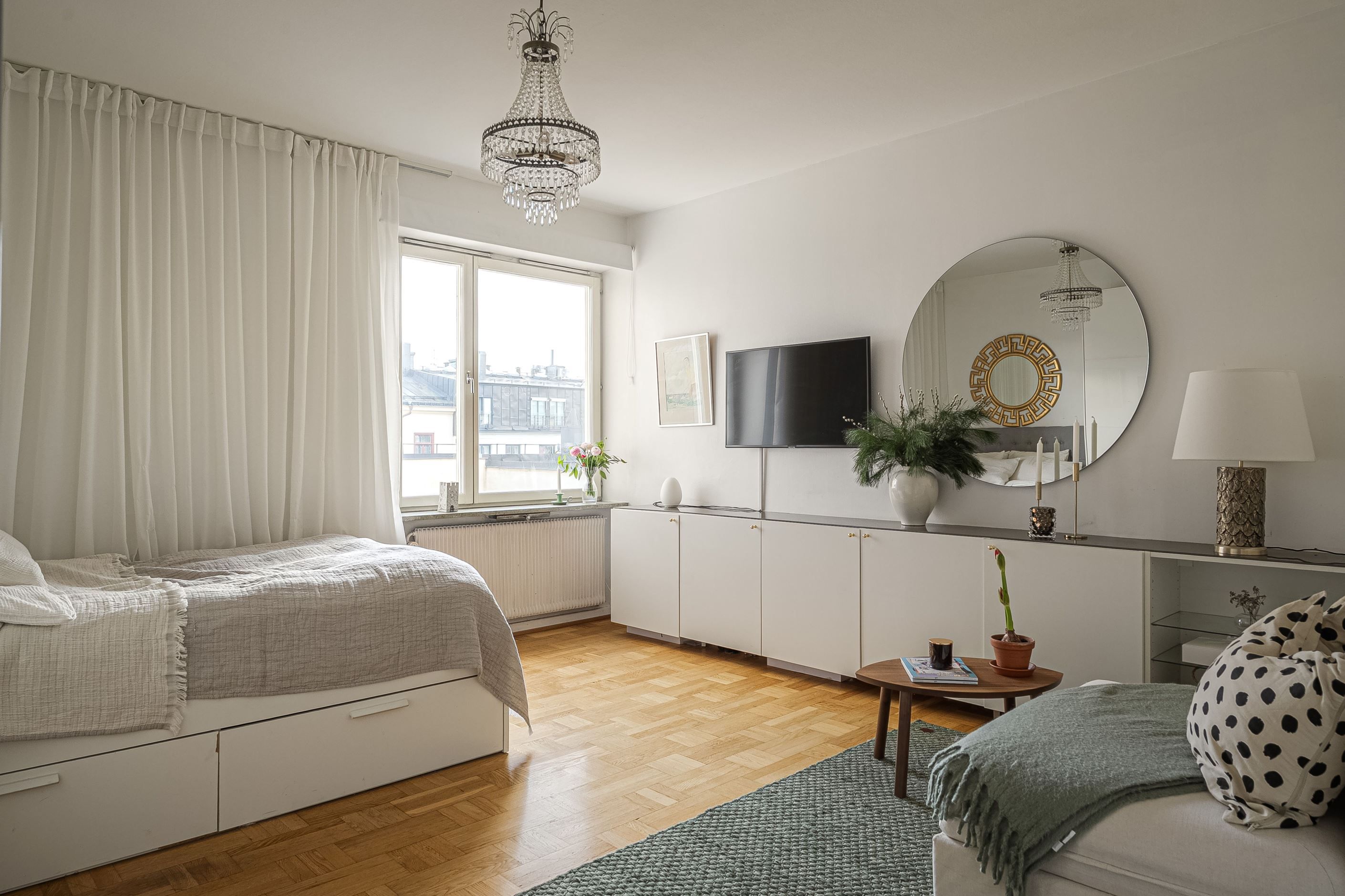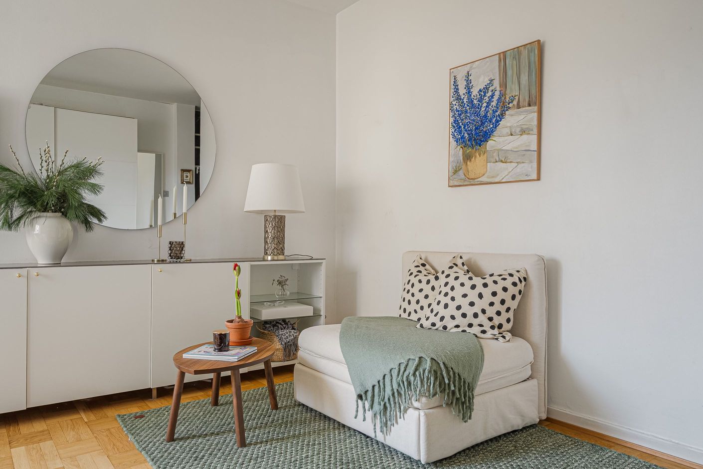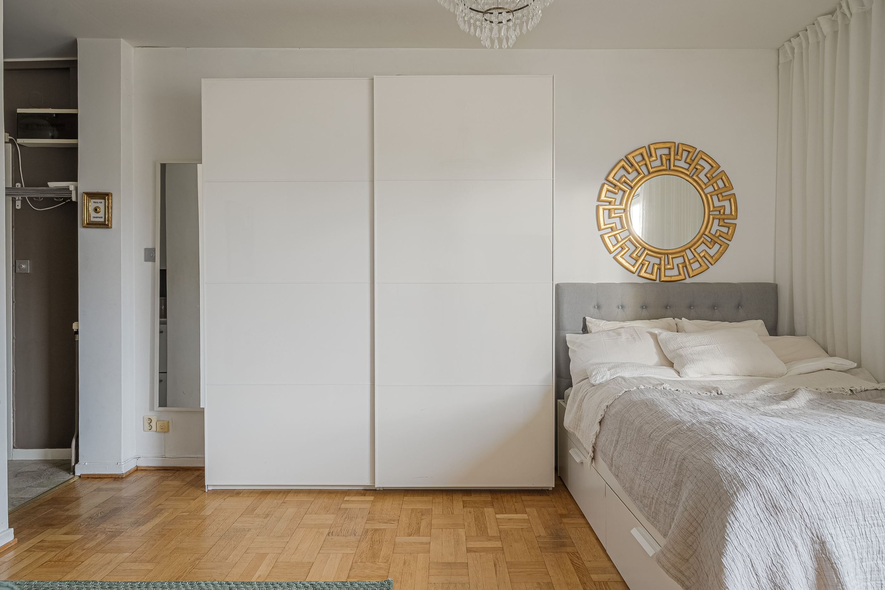 Bostaden har en smart och funktionell planlösning som på ett naturligt sätt rymmer säng, soffgrupp och matplats om så önskas. Köket är fullt utrustat med häll, ugn, diskmaskin, diskho och kyl. Lägenheten är målad i stilrena kulörer och erbjuder gott om förvaring i rymliga garderober, vilket skapar en både praktisk och hemtrevlig bostad.