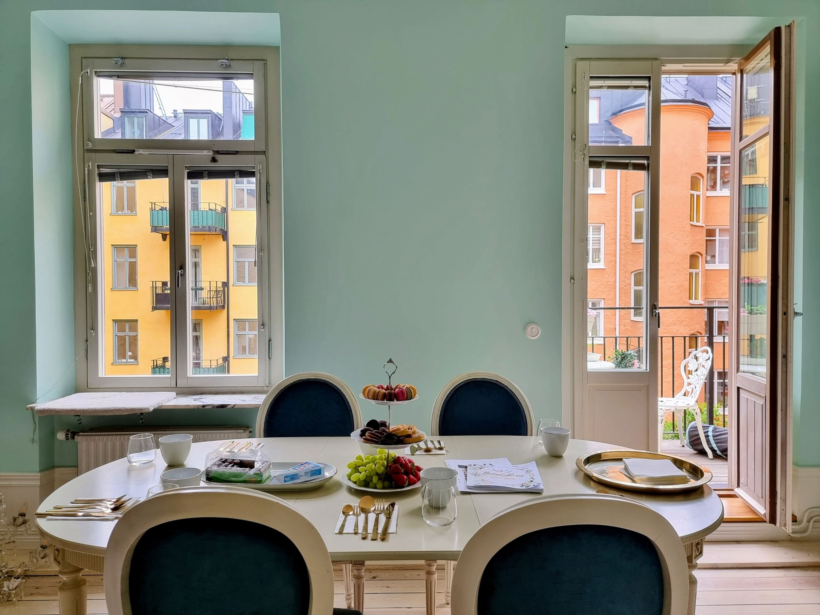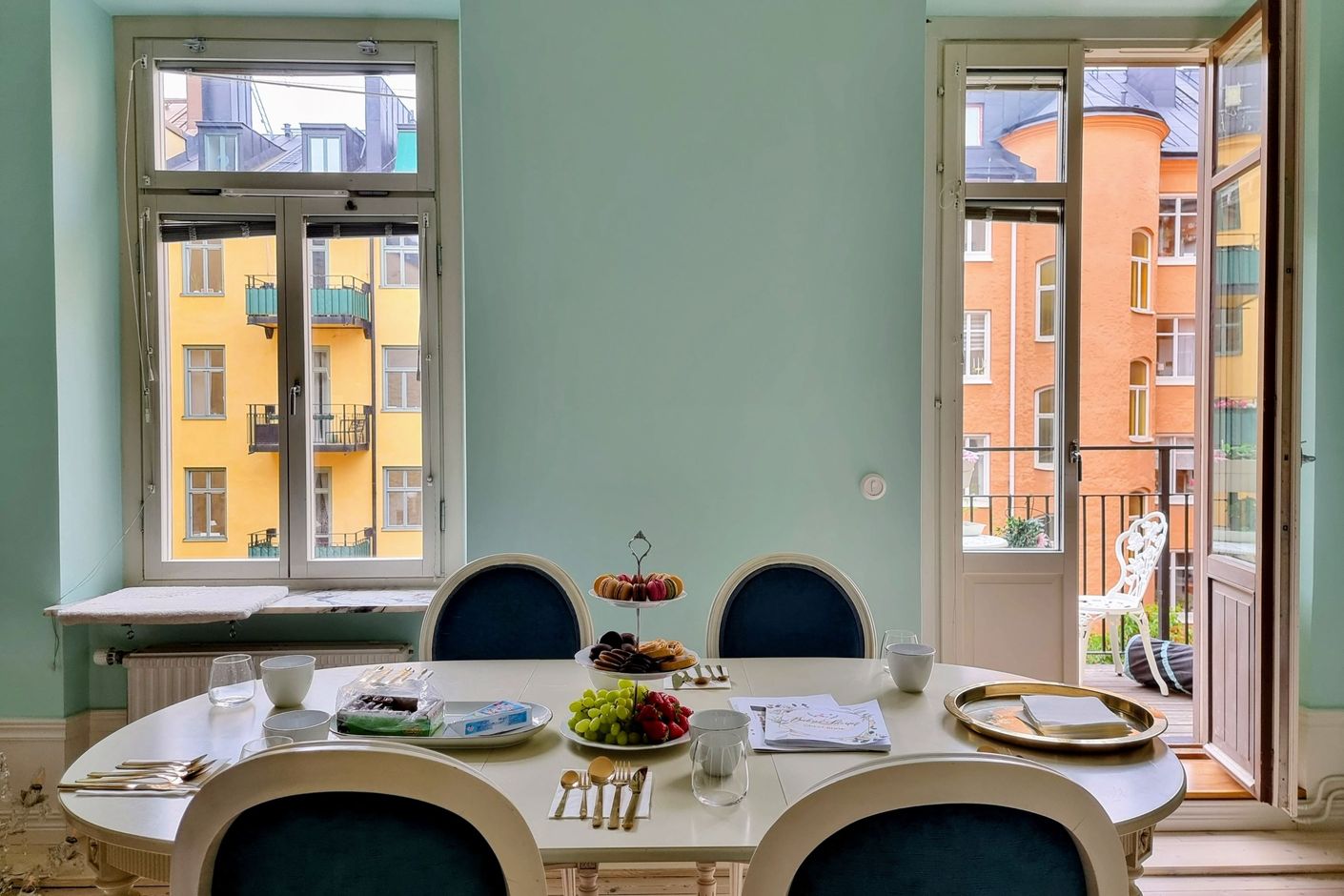 Lägenheten ligger högt upp i det lugna gårdshuset, med samtliga fönster och balkong vända mot den grönskande innergården – en riktig oas mitt i city.