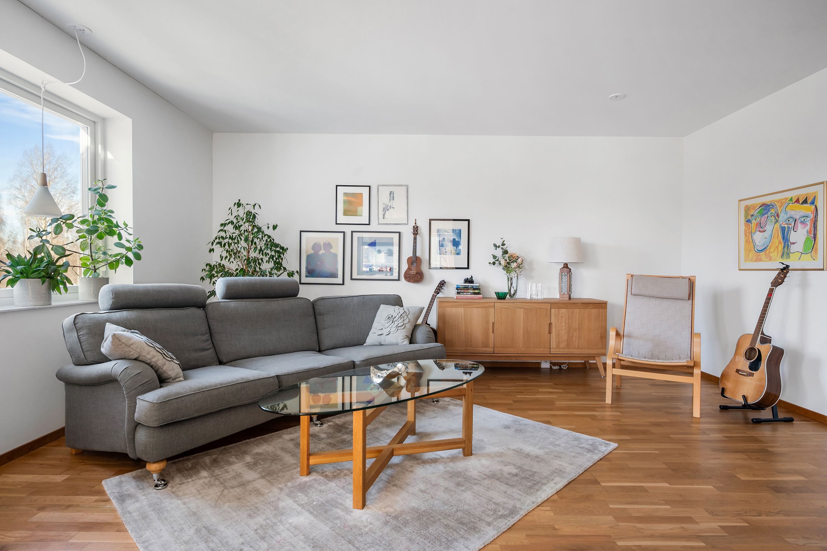 Bostaden erbjuder en öppen och modern planlösning med generös takhöjd, som gör det möjligt att rymma en stor matsalsgrupp intill de härliga fönsterpartierna i söder.