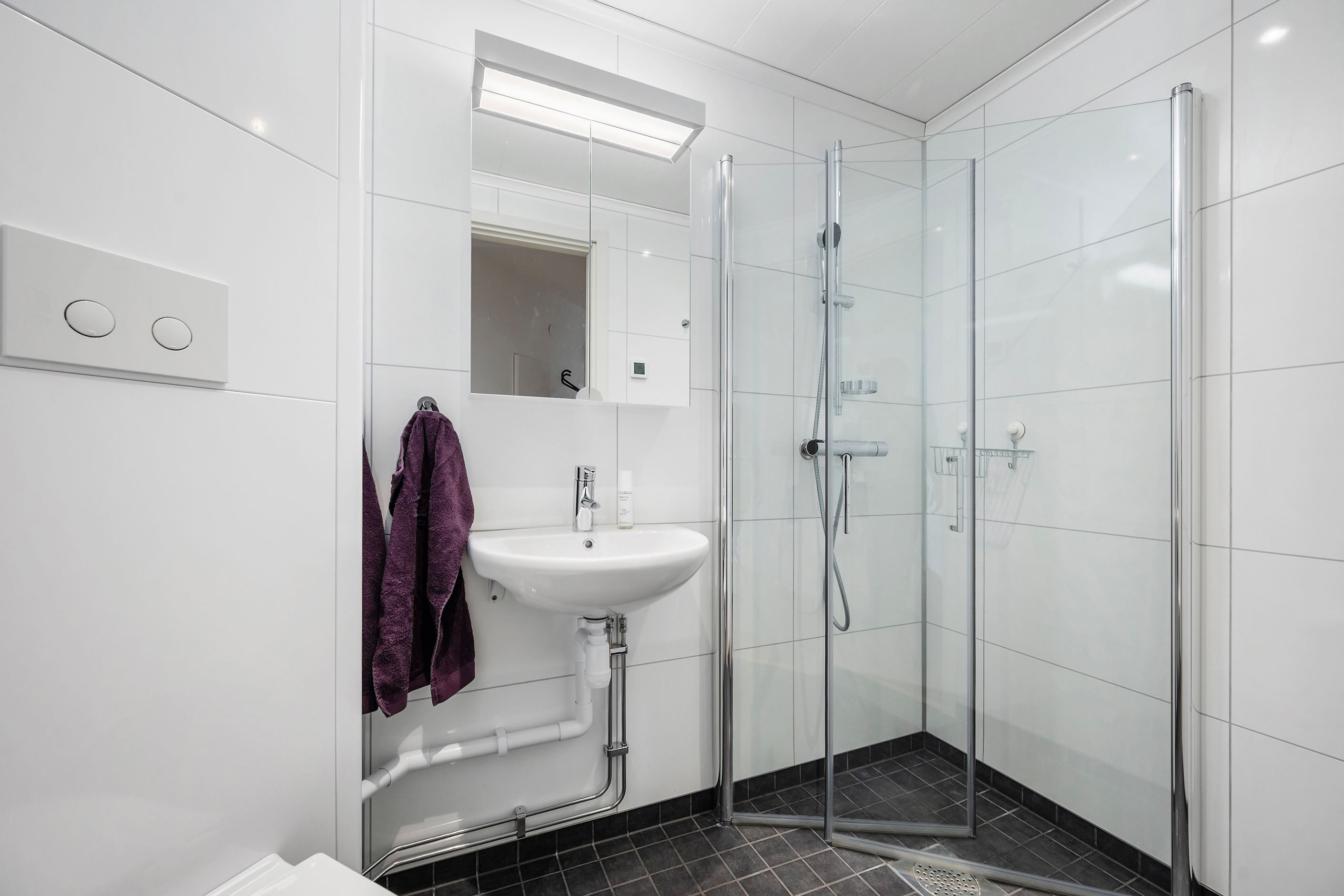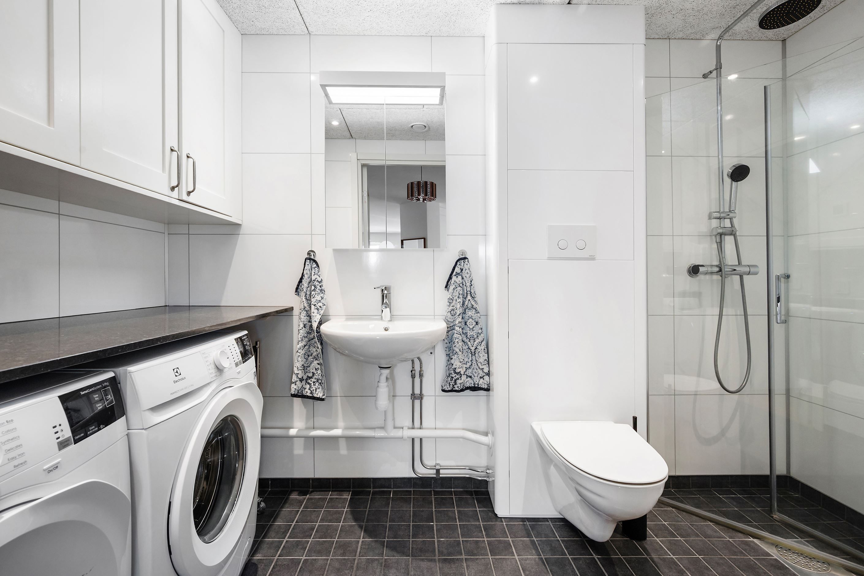 Badrummet och tvättstugan går i ett och här finner ni ett klinkergolv med golvvärme, väggar i Fibo Trespo och samtlig inredning är utvald med omsorg. Badrummet är utrustat med dusch, tvättställ med spegelskåp ovan, vägghängd wc samt tvättmaskin och torktumlare med väggskåp ovan. Med andra ord finns allt ni behöver för en praktisk och lättsam vardag. I bostaden finns ytterligare ett badrum med dusch, wc och tvättställ.