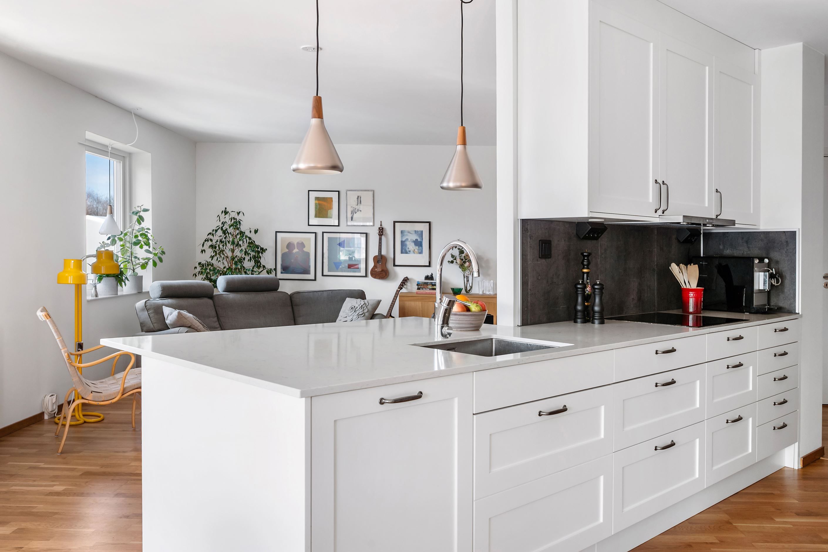 Bänkskivan i komposit skapar exklusivitet och tillsammans med den påkostade maskinella utrustningen får du ett kök med extra allt. Genomgående löper ett vackert ekgolv genom bostadens samtliga rum och väggarna är enhetligt ljusa. Köksön blir en fin detalj i den annars öppna planlösningen samtidigt som den ger bra förvaring, ytterligare arbetsyta och en härlig plats att umgås på samtidigt som maten tillagas.