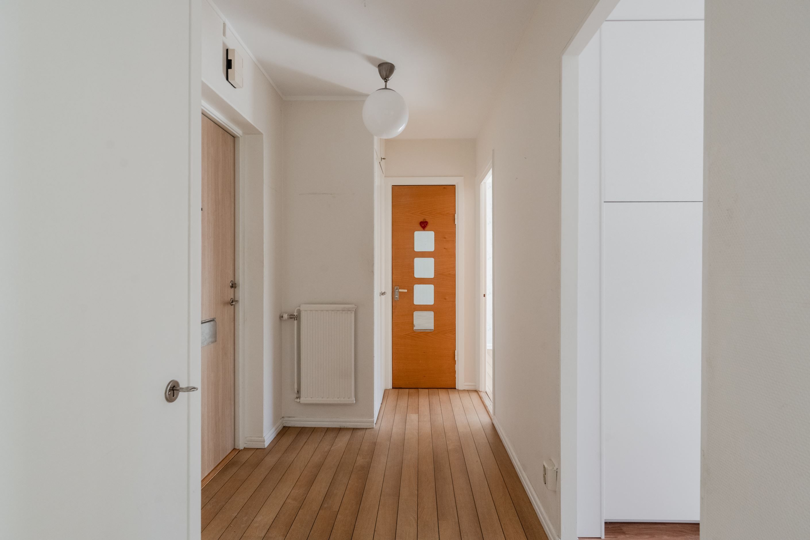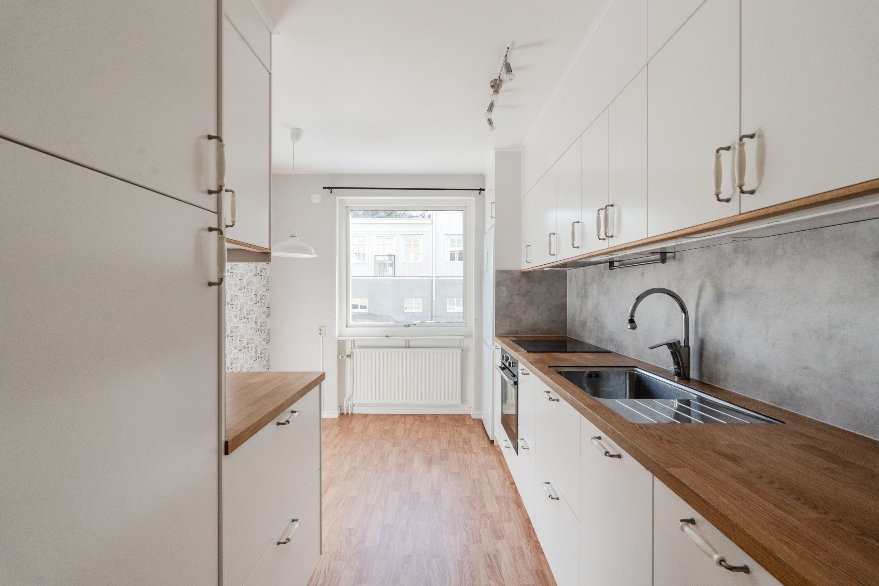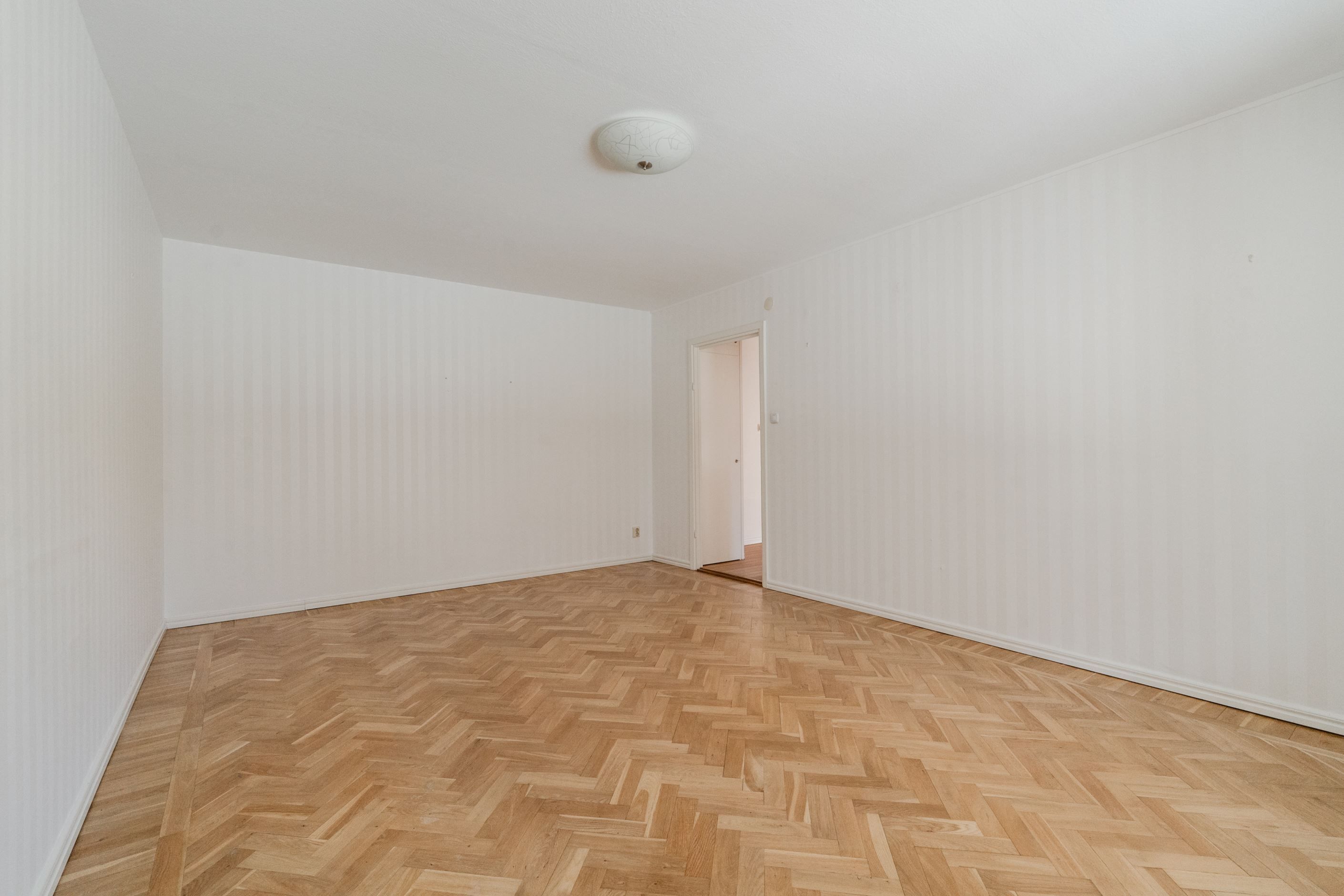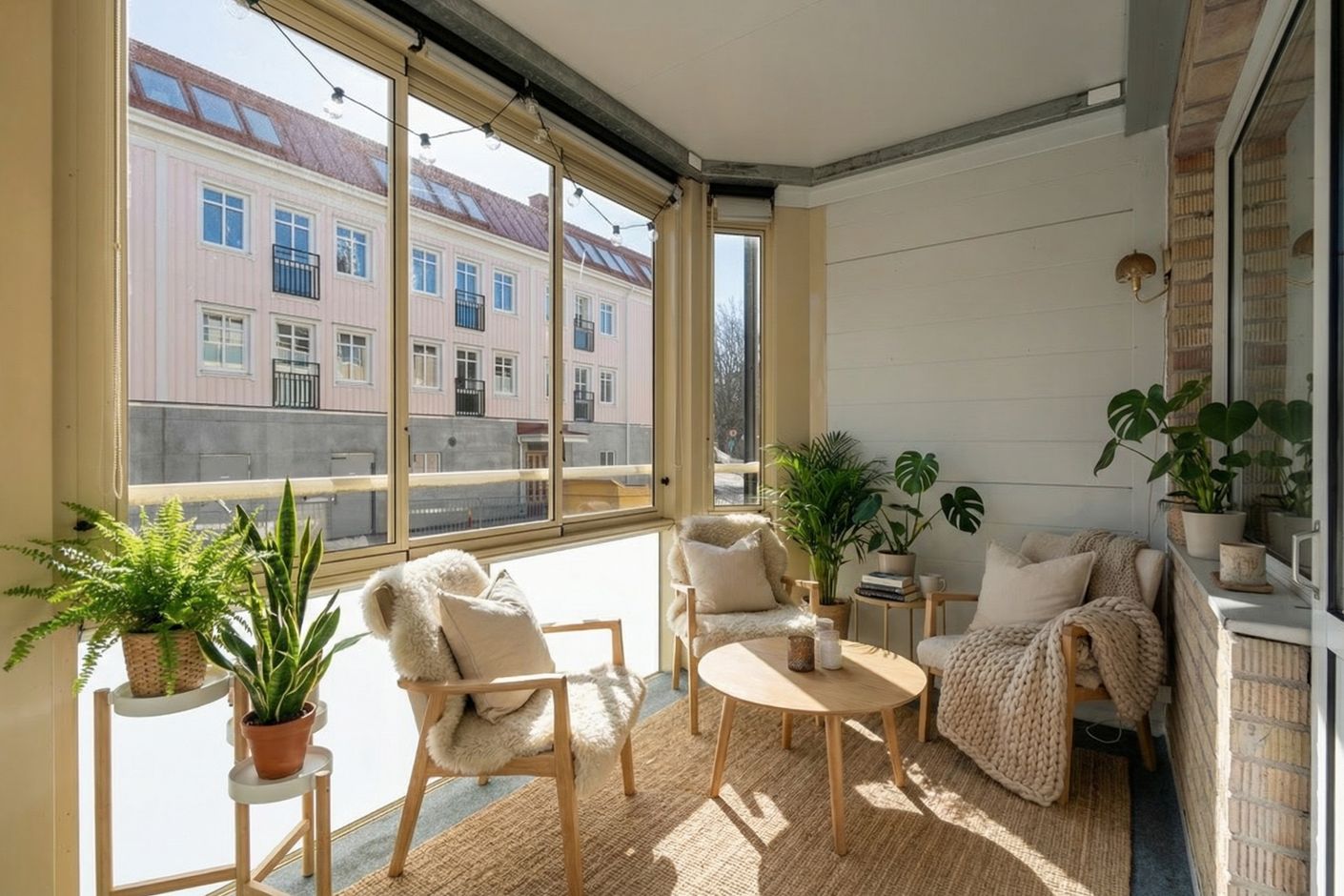 Lägenheten rymmer ett sovrum samt ett ljust och inbjudande vardagsrum där den klassiska fiskbensparketten och de nåtade skepssgolvet ger en tidlös och hemtrevlig känsla. Härifrån nås även den inglasade balkongen, som fungerar som ett extra rum större delen av året – perfekt för morgonkaffet eller en lugn stund oavsett väder.
