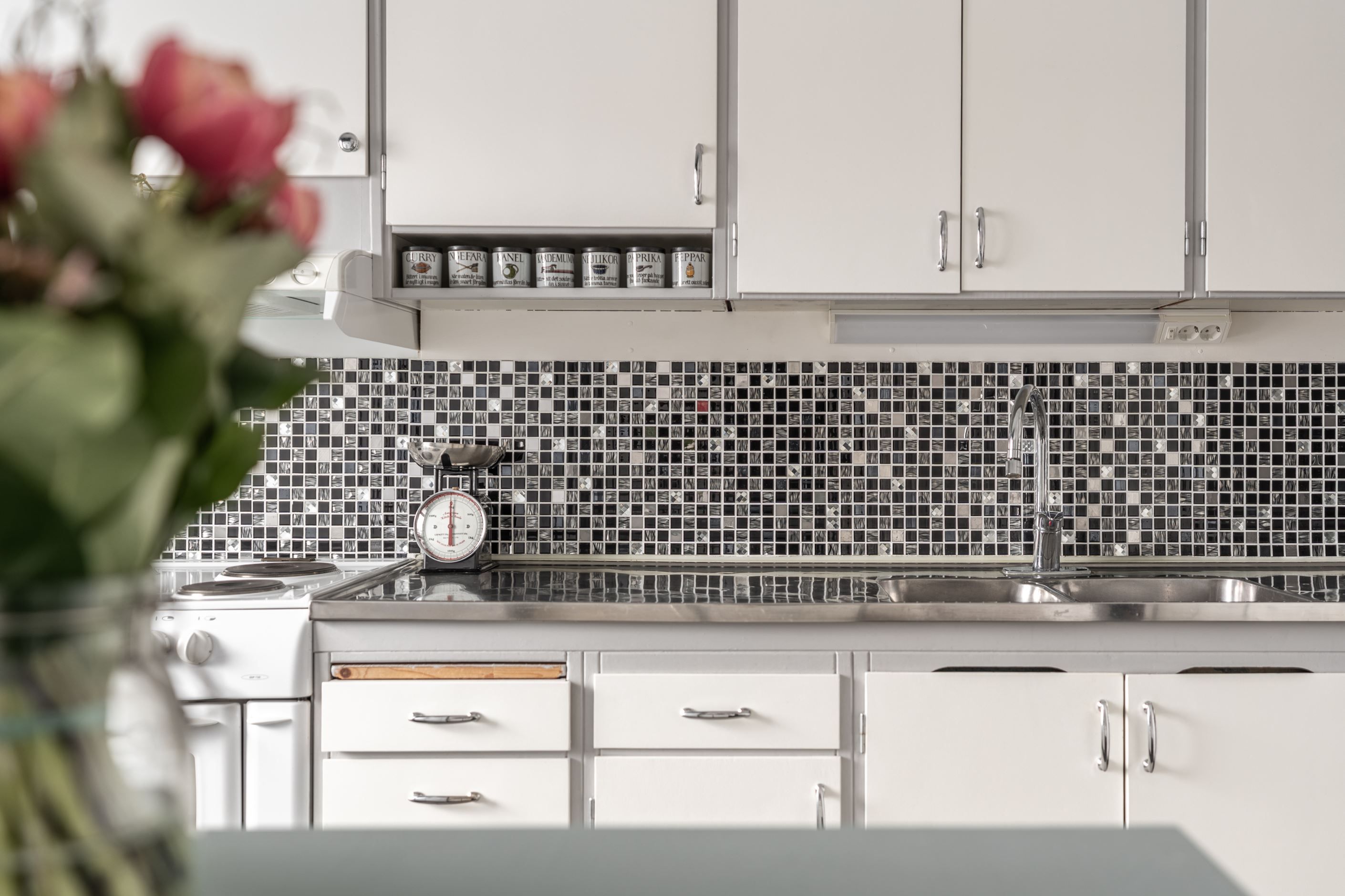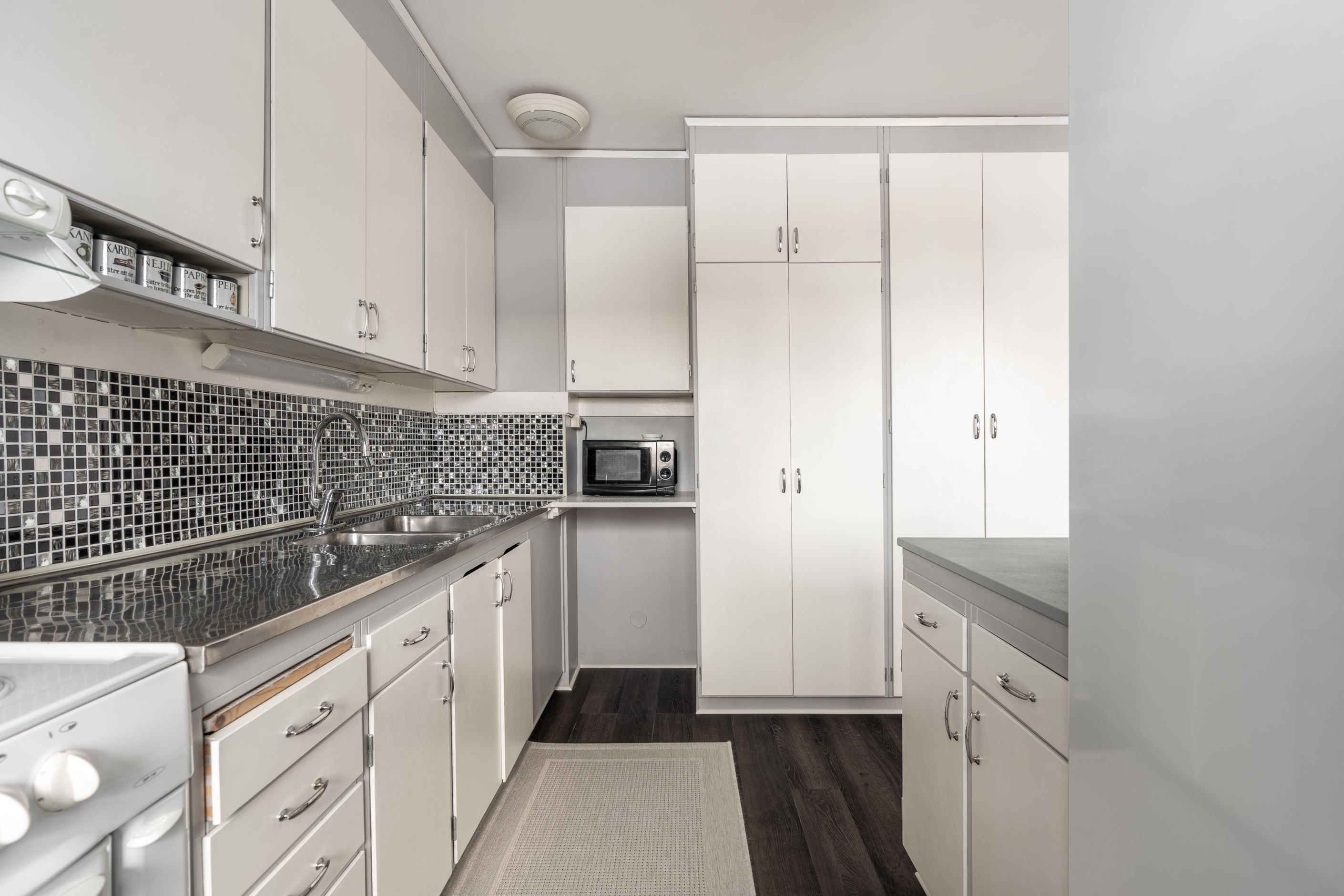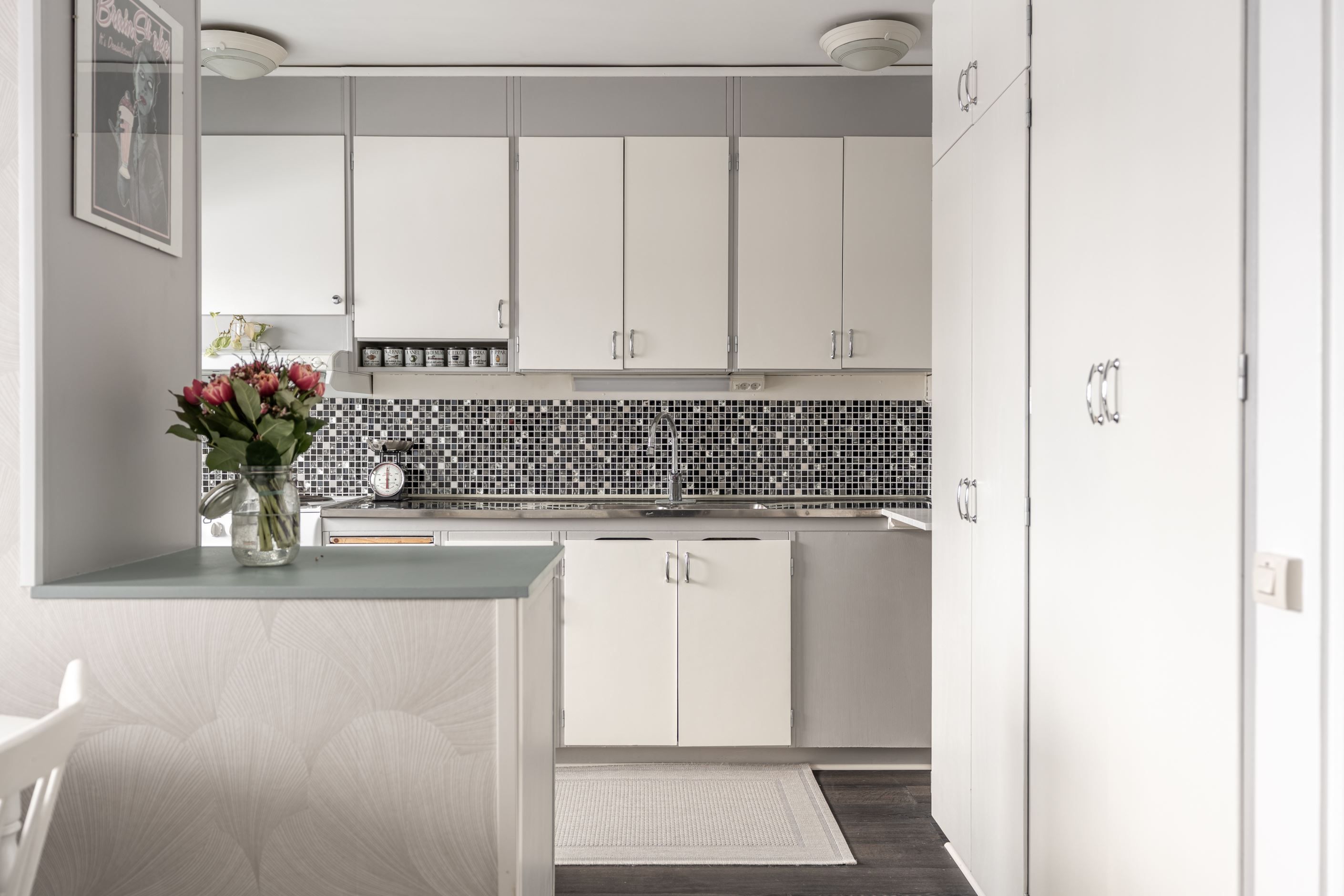 Köket är vitt och tidlöst utformat med god förvaring och öppet mellan kök och matplats för att skapa en mer social och luftig känsla. Här finns gott om plats för matgrupp, vilket gör köket till social plats att hänga i. Från bostadens kök nås den rymliga balkongen som vetter mot en lugn gata i bra solläge.