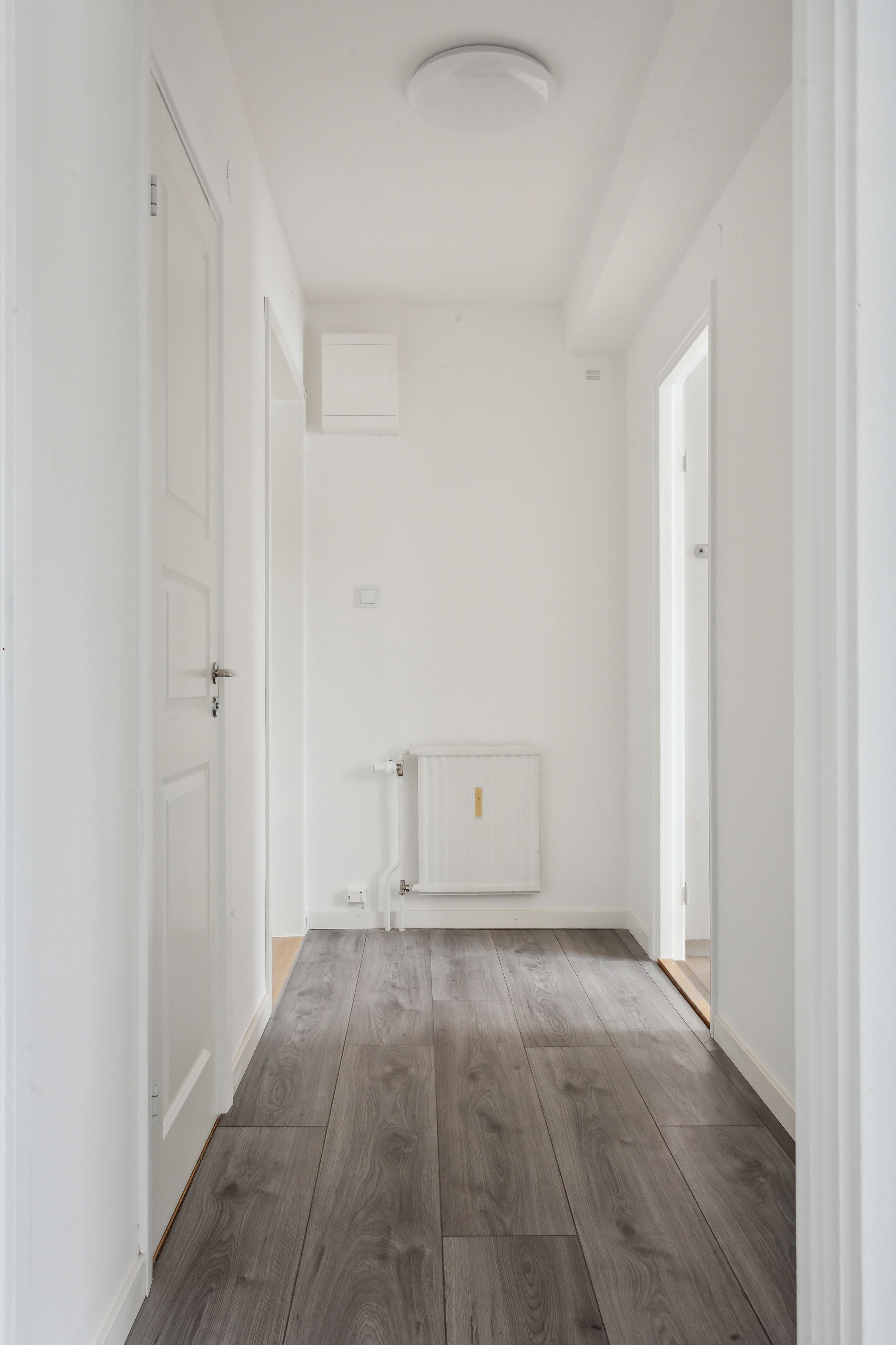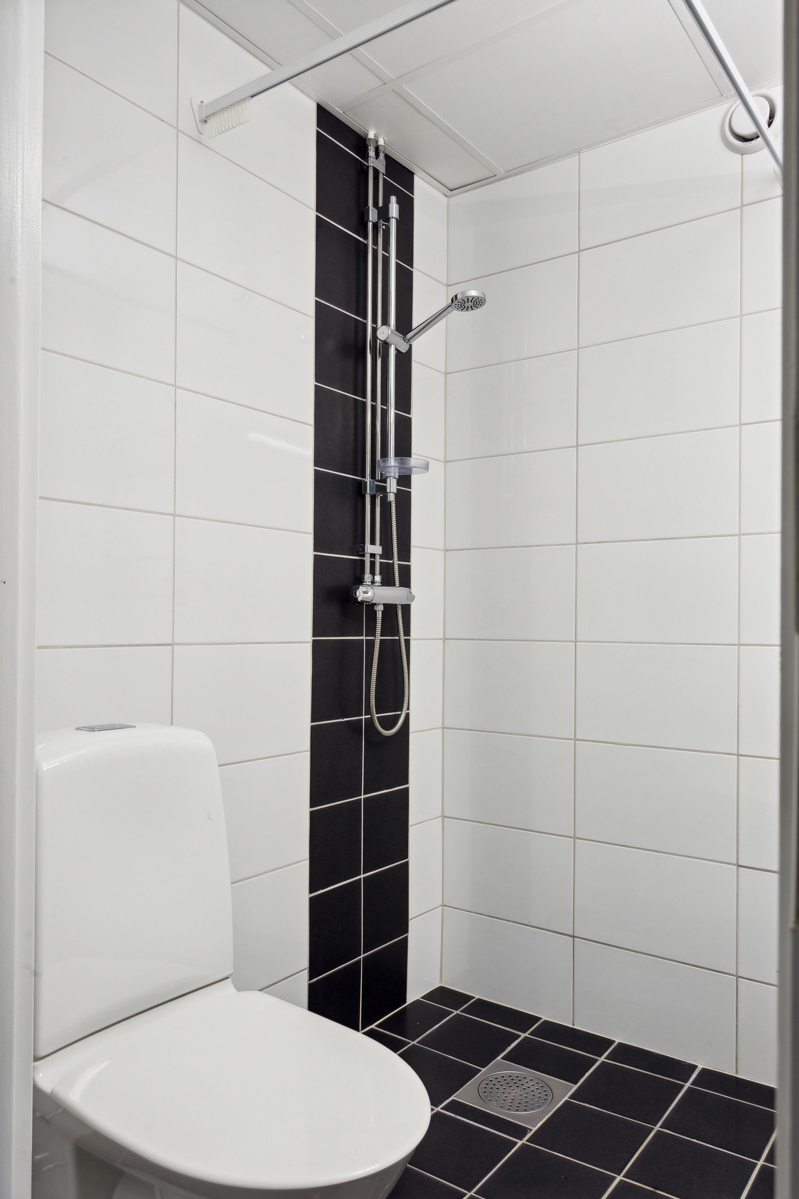 När du kliver in i lägenheten möts du av en ljus och rymlig hall med öppning till både kök, badrum och allrum. Badrummet är helkaklat i svart och vitt och har dusch, wc och handdukstork. Köket är praktiskt planerat och har plats för ett mindre matbord. Vardagsrummet är stort och lättmöblerat och kan anpassas efter behov.