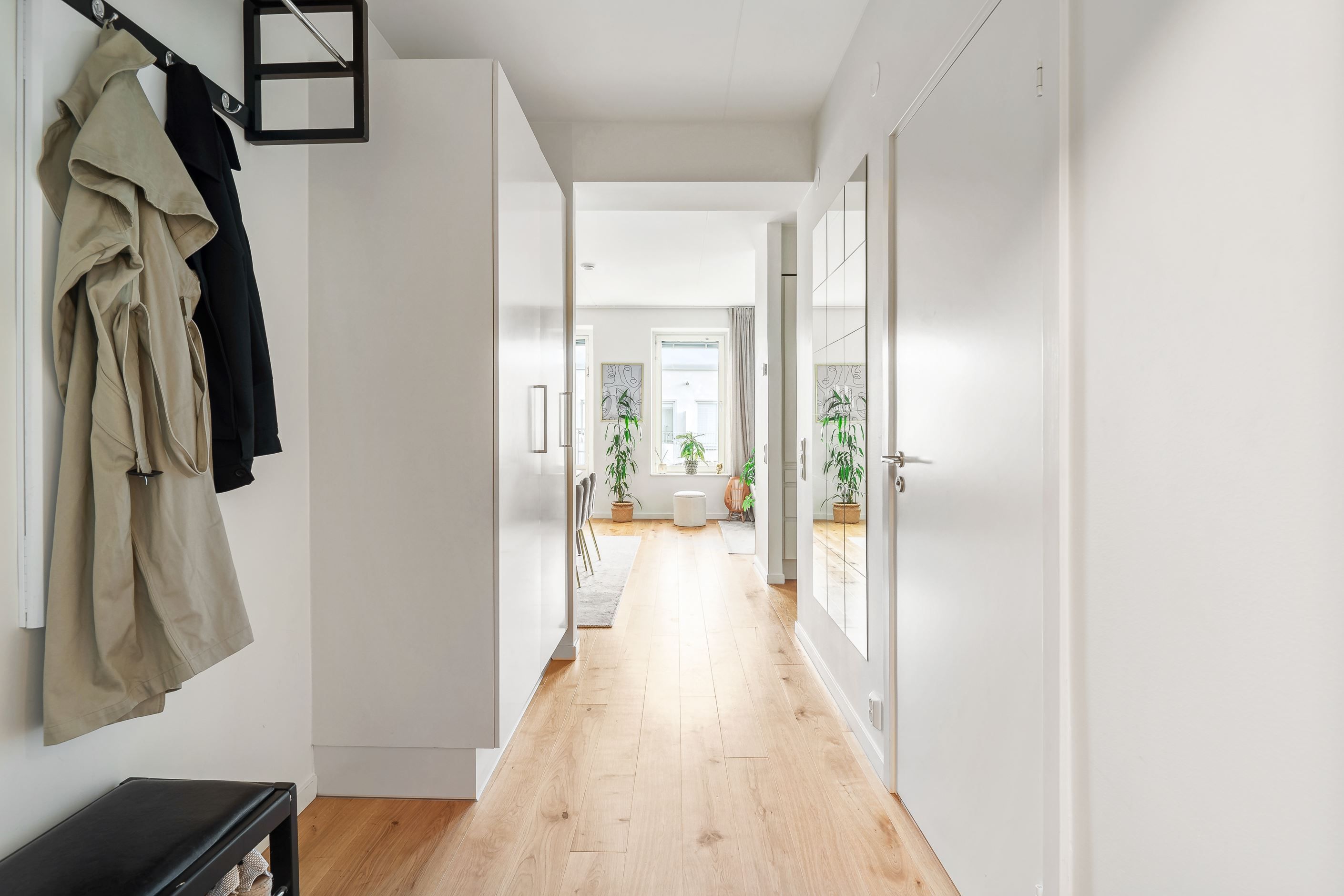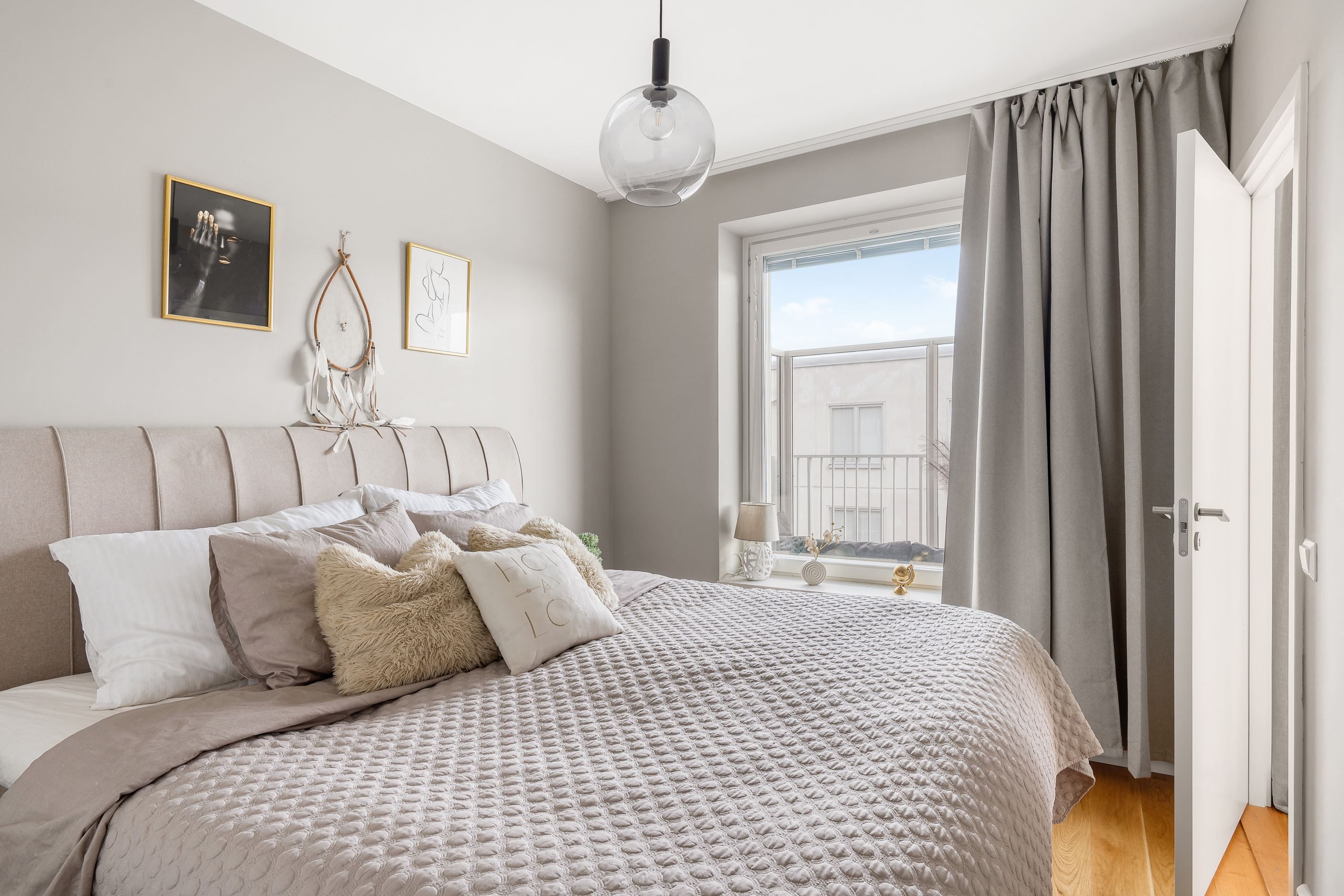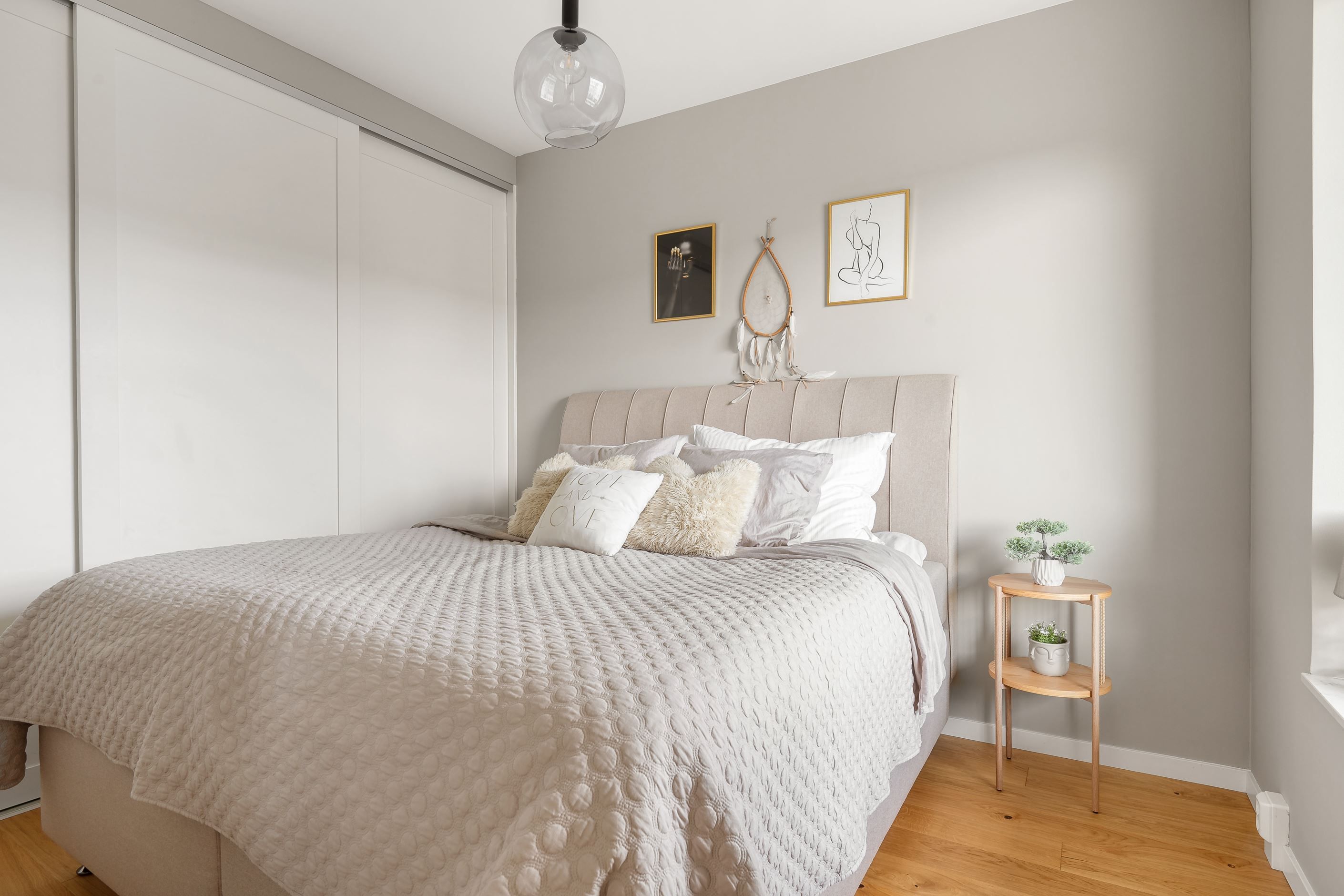 Ett och väl tilltalande sovrum med plats för dubbelsäng med annat möblemang. Hela bostaden präglas för sitt genomgående fina ytskikt. Här möts du av det högfunktionella och stilrena köket från HTH med full maskinpark. Med sin unika planlösning och sin smartfördelade yta kan man själv bästa hur man vill utforma sitt vardagsrum och matsal. Antingen möblera efter bilderna eller byta på matplats och vardagsrum. Bara låt idéerna florera och forma ditt hem!