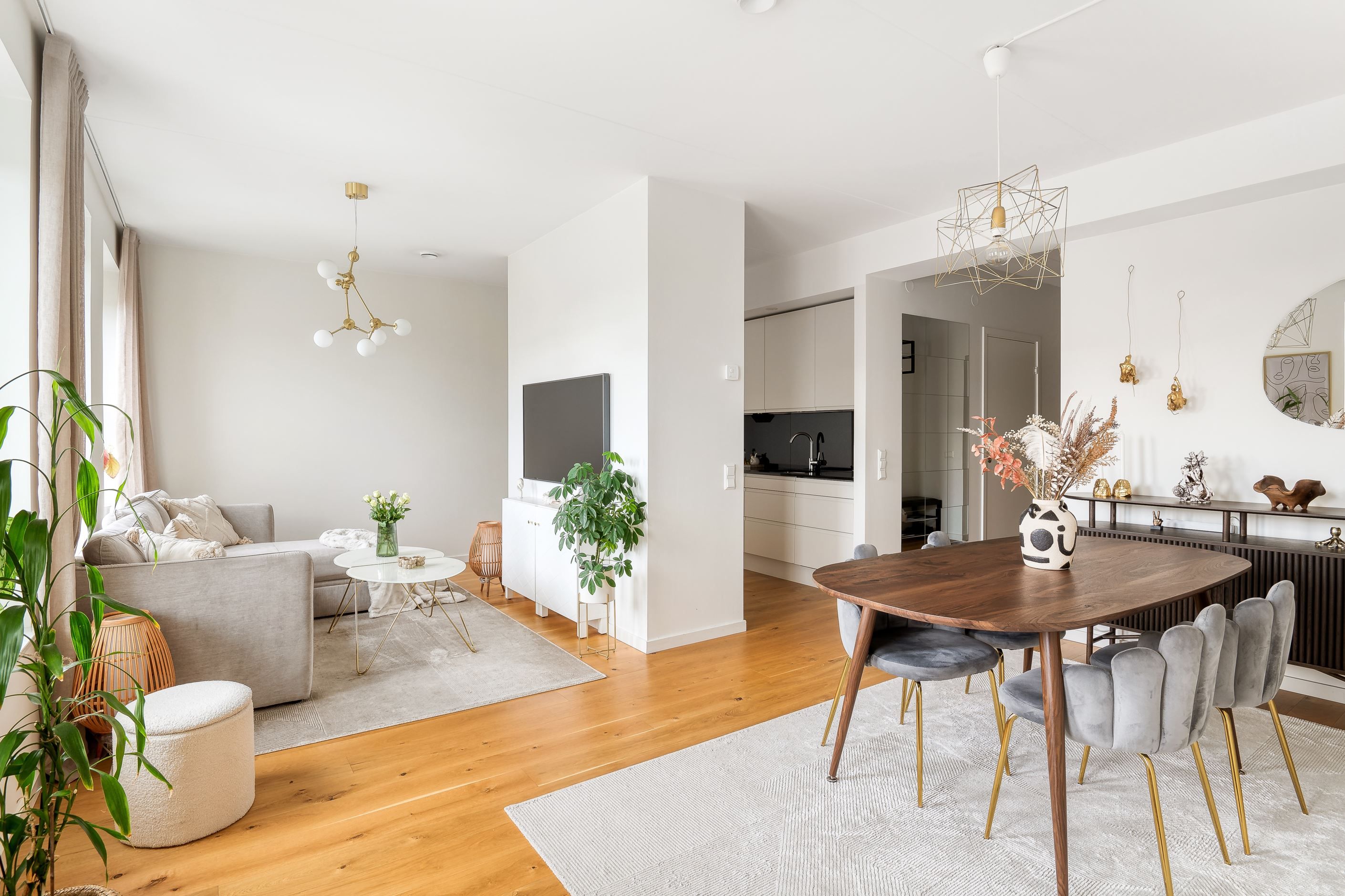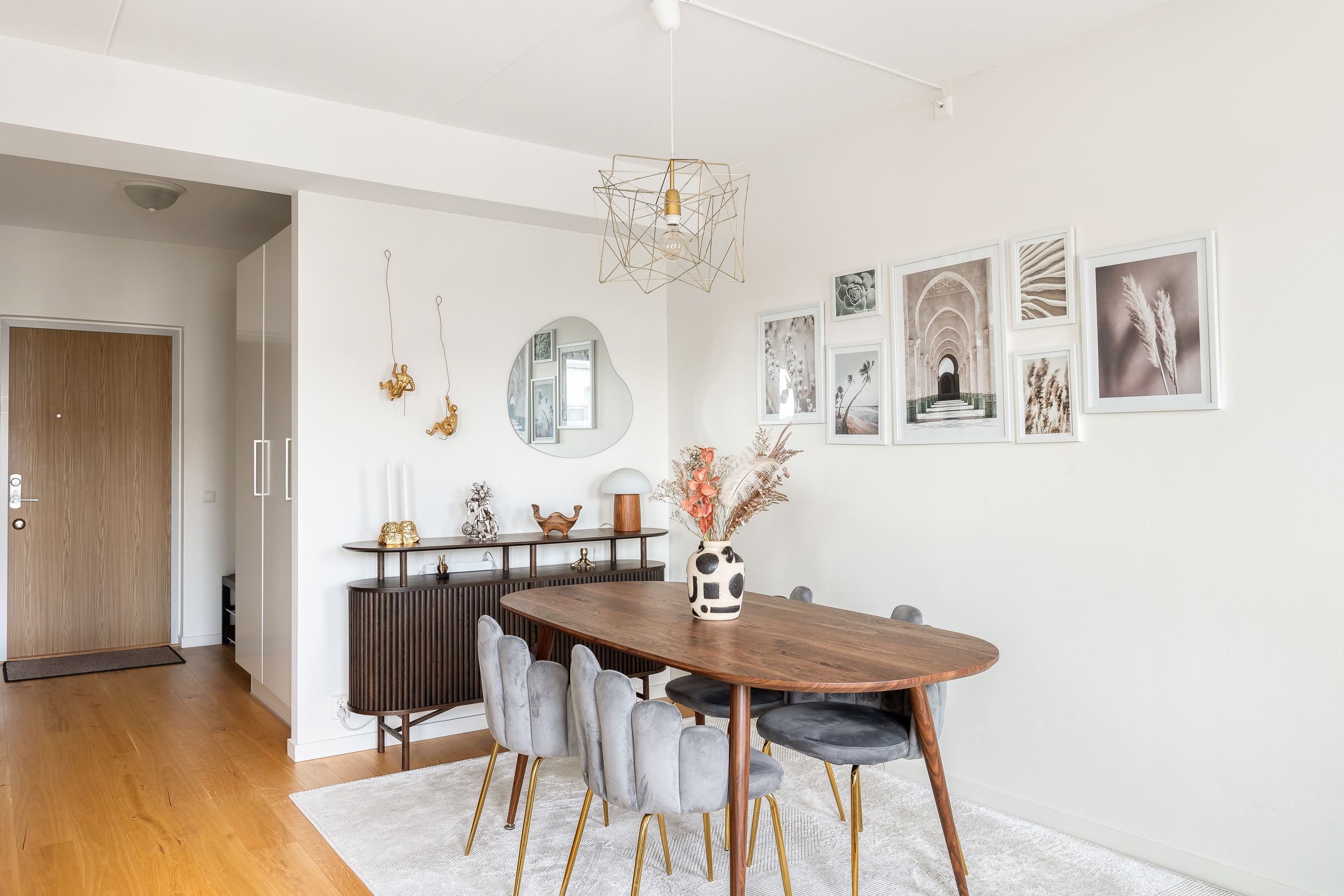 Här får man finns det gott om plats för möblemang för ett stort matbord och en större soffgrupp i vardagsrummet.