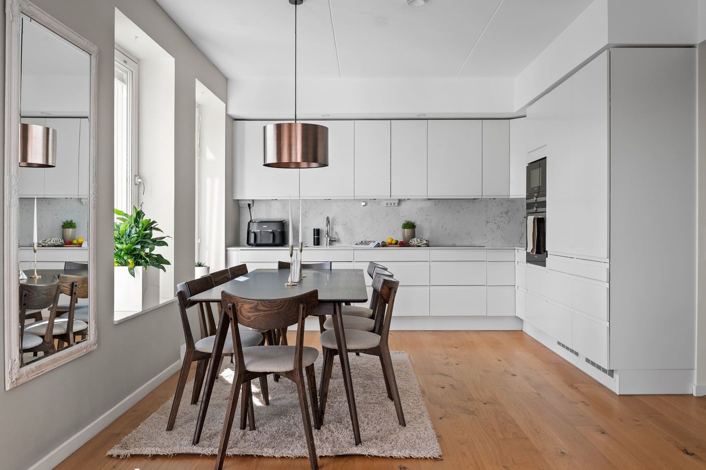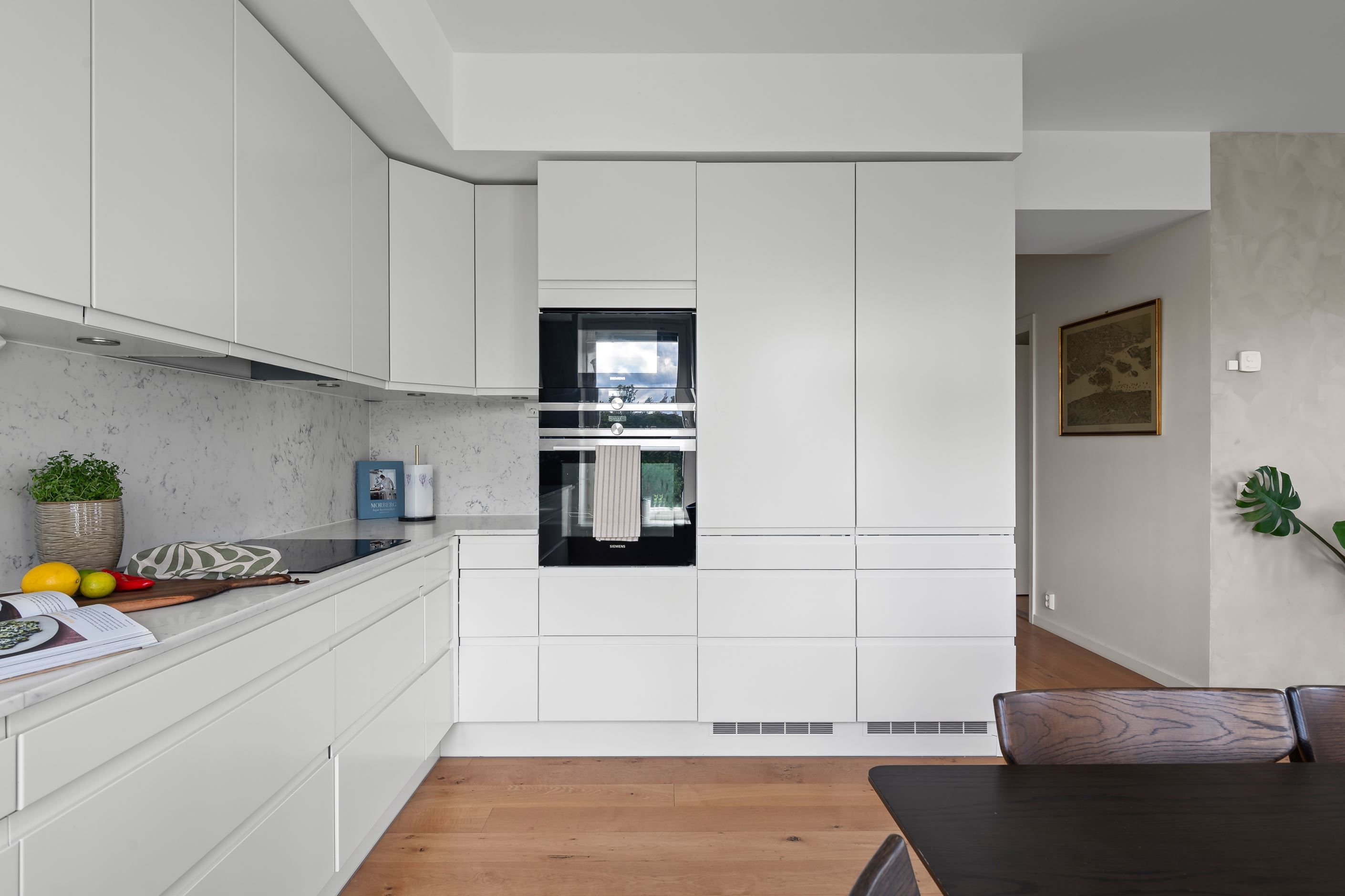 Två välplanerade sovrum erbjuder smarta möbleringsmöjligheter. Köket från HTH med full maskinpark möter vardagsrummet i en öppen och harmonisk planlösning. Här finns gott om plats för ett stort matbord vid köket och en generös soffgrupp i vardagsrummet – en idealisk miljö för både vardag och fest.