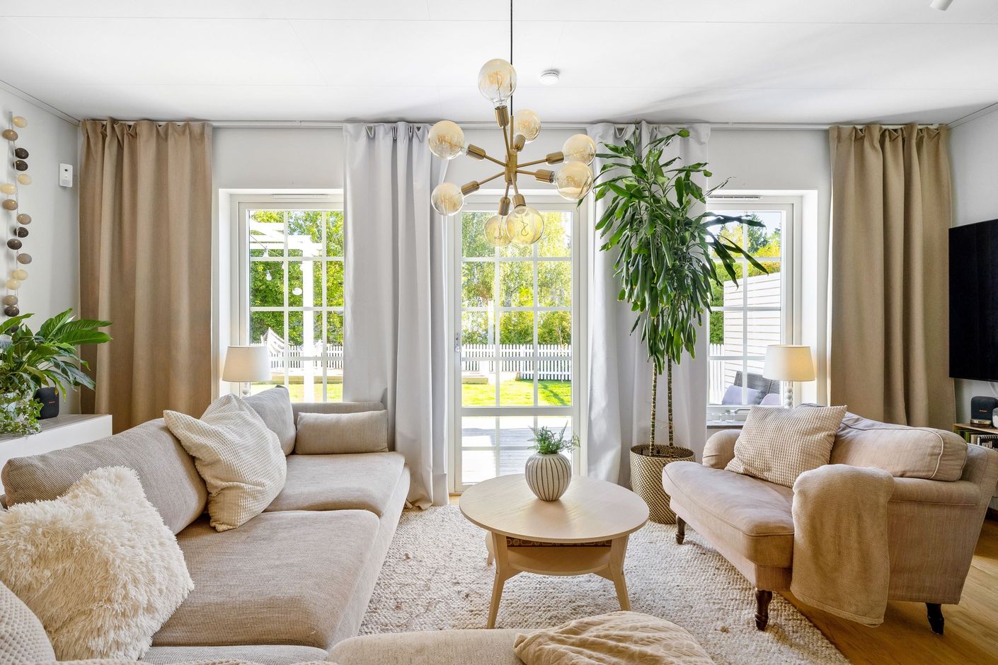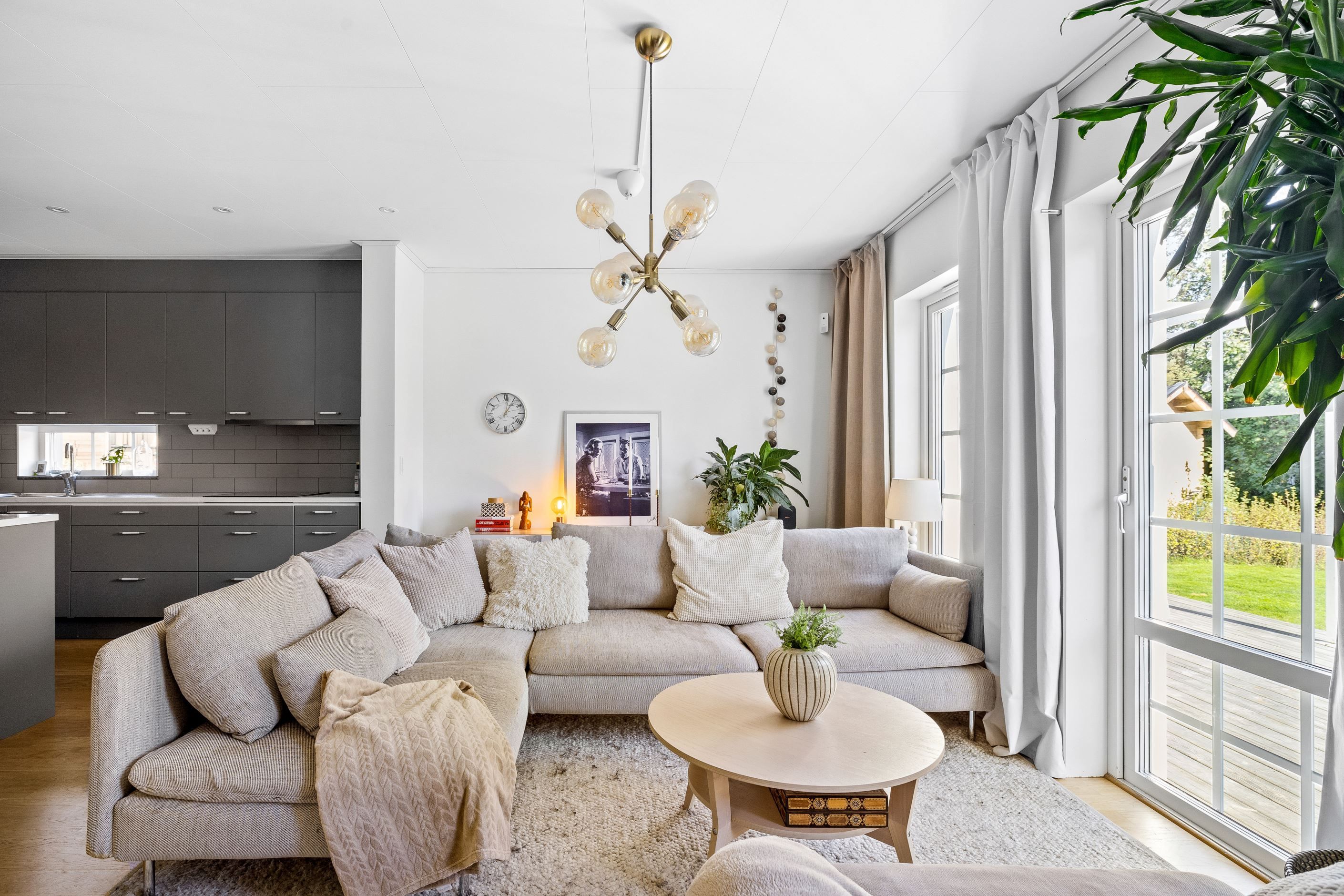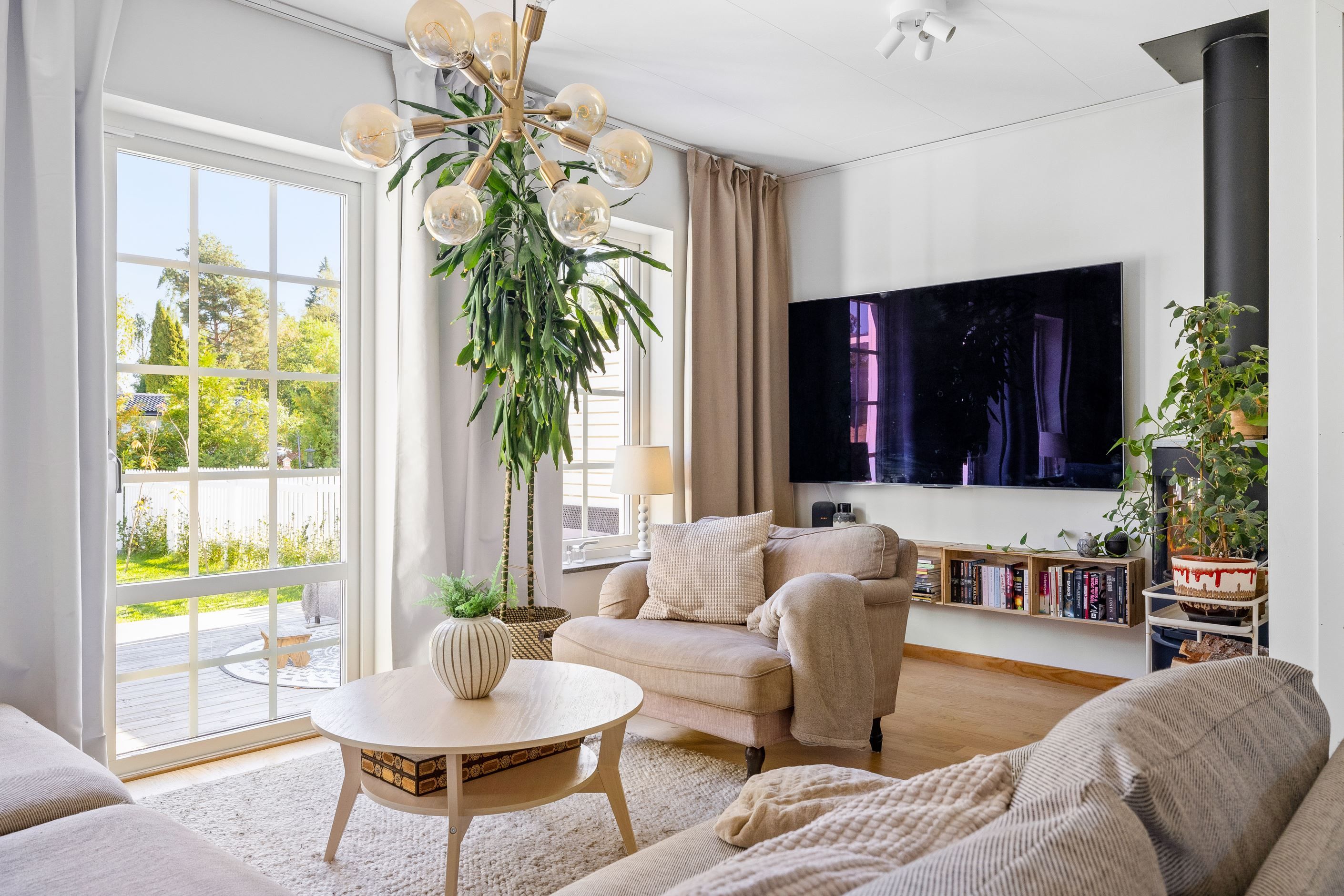 Stig in i denna moderna och ljusa bostad som genom de generösa fönsterpartierna och gavelfönstren ger varje rum naturligt ljus. Den stora trädäckade altanen på baksidan blir din privata fristad där du kan njuta av lugnet och stillheten eller bjuda in vänner och familj för en grillkväll under stjärnorna. Förutom altanen så har du en lagom stor trädgårdstomt, som omgärdas av måbärshäck och ett vitt staket som sträcker sig runt gaveln på huset. På framsidan finns det stensatt entrégång med plats för matbord och solstolar utanför köksfönstret.