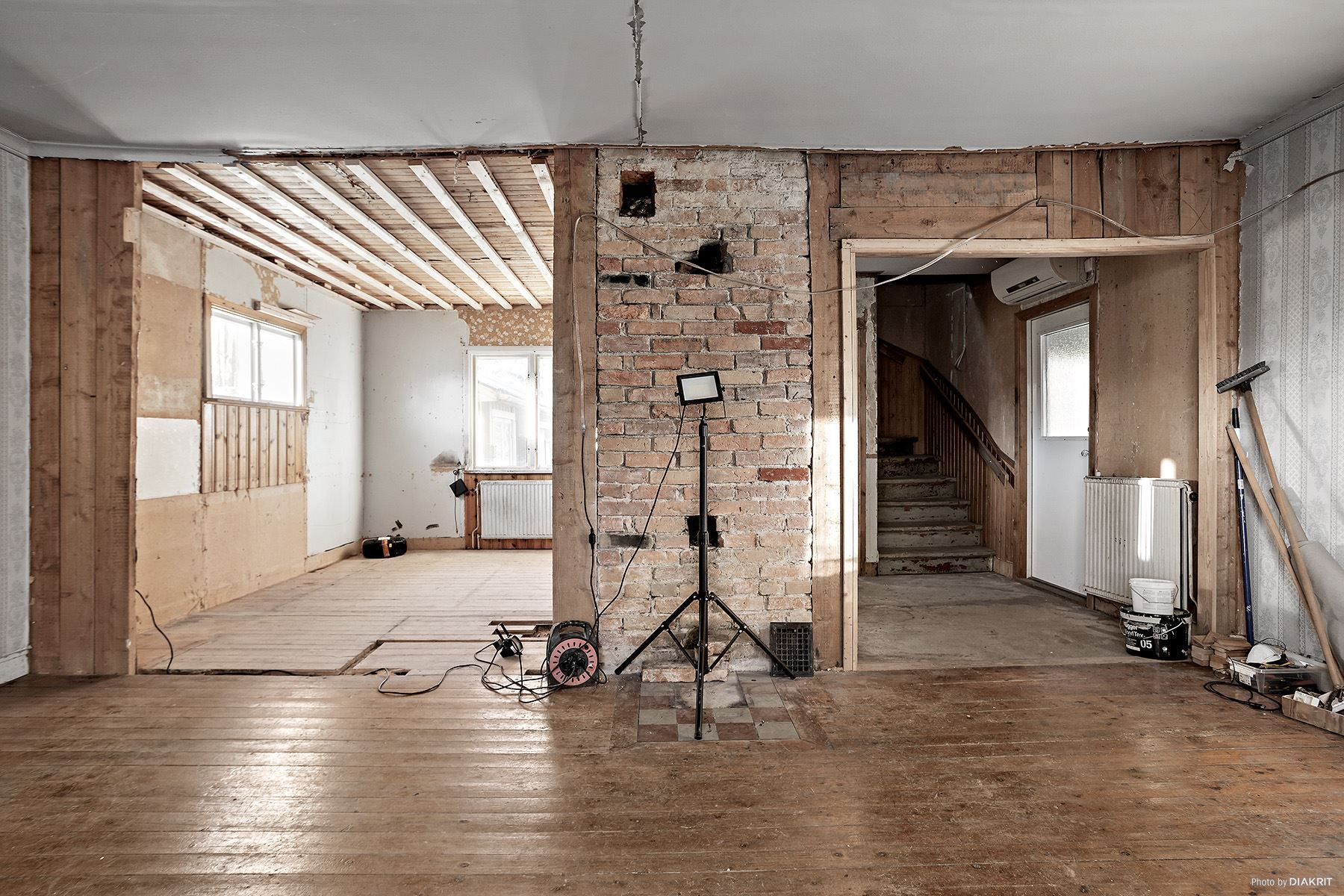 Här har en omfattande renovering påbörjats och nu är det upp till nästa ägare att färdigställa till vad man önskar. Stora delar av huset är utrivet för att kunna börja om på nytt, de vackra äldre trägolven har självklart bevarats så att du kan slipa och lacka dem och i vardagsrummet är den teglade murstocken synlig och utgör en snygg mittpunkt.
