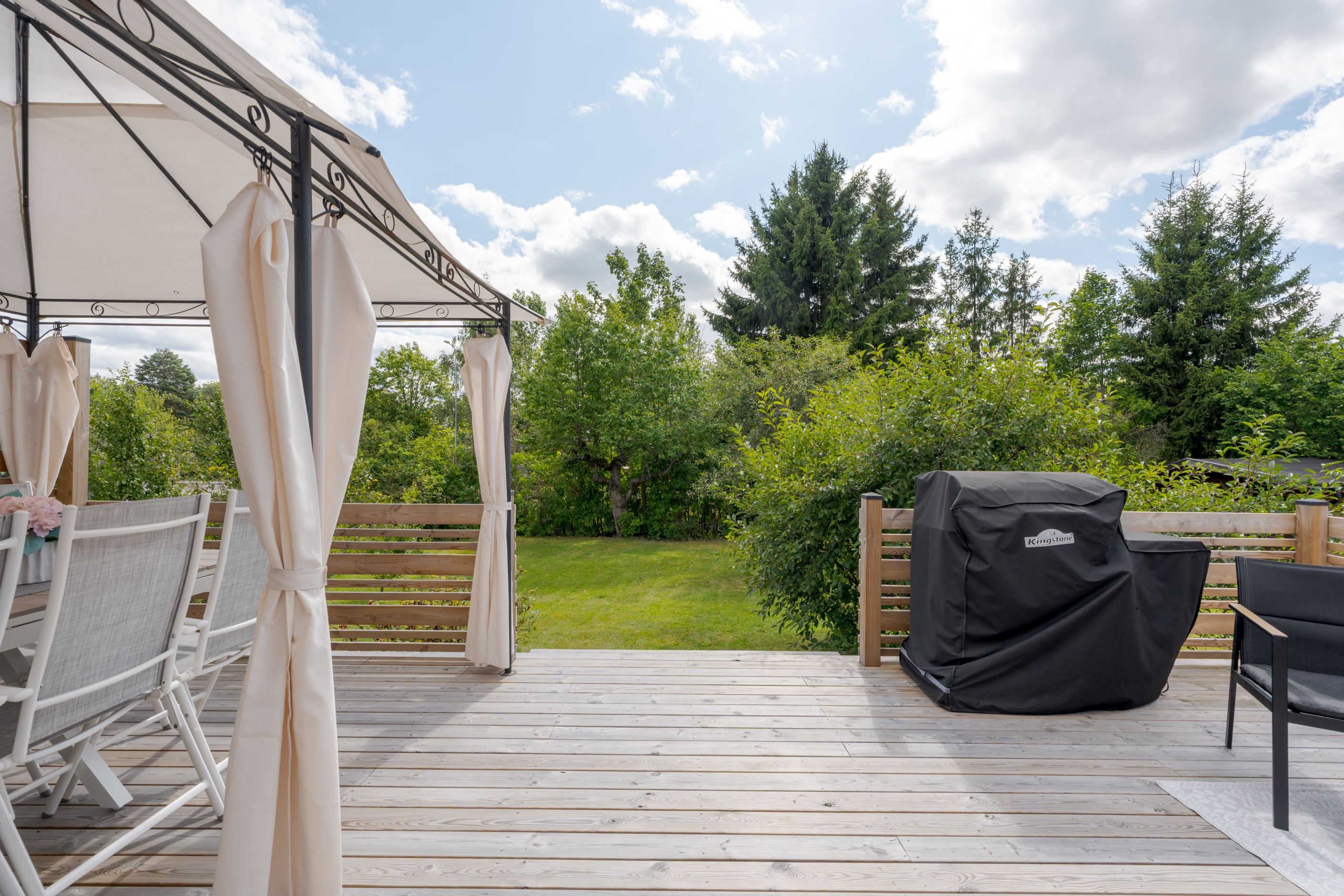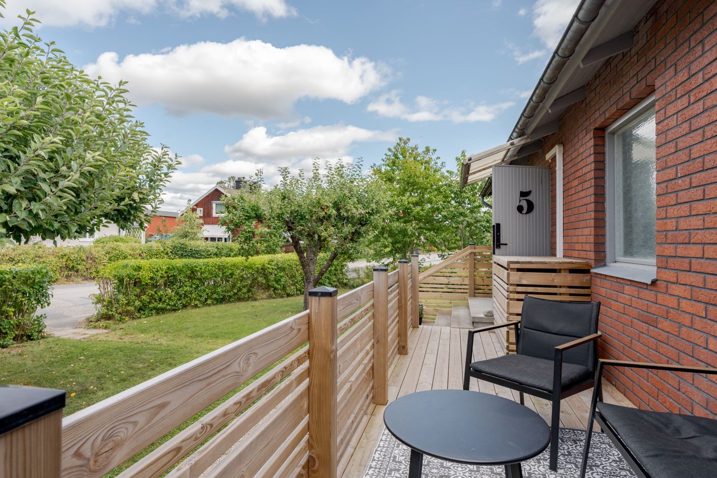 Entréplanet rymmer tre rymliga sovrum med nya ytskikt, samt ett stort vardagsrum som smidigt kombinerar matplats och soffgrupp. Härifrån kliver du direkt ut på den generösa altanen i soligt söderläge – byggd 2023 – med utsikt över den grönskande baksidan, perfekt för sommarens alla måltider och lata dagar i solen.