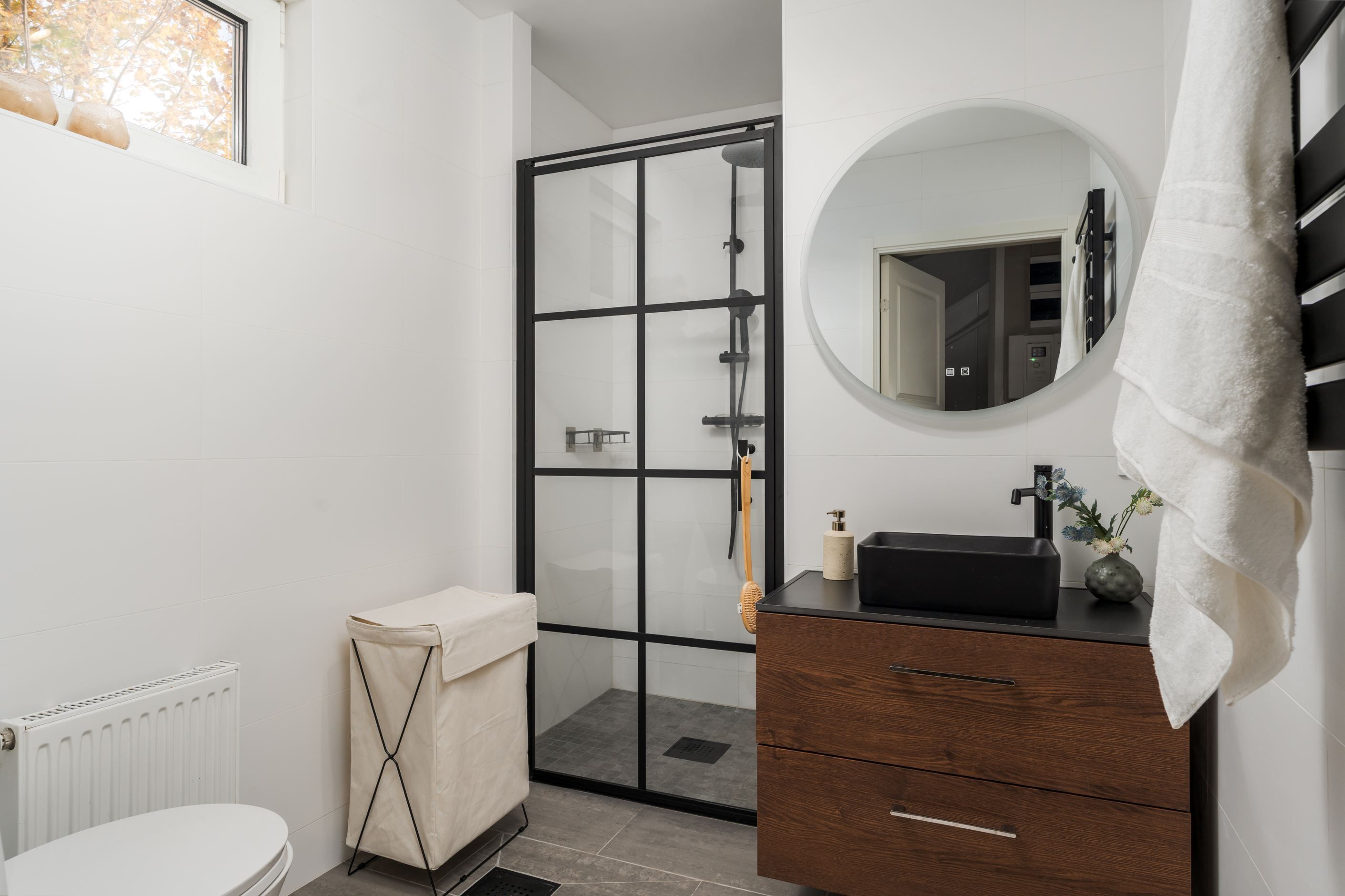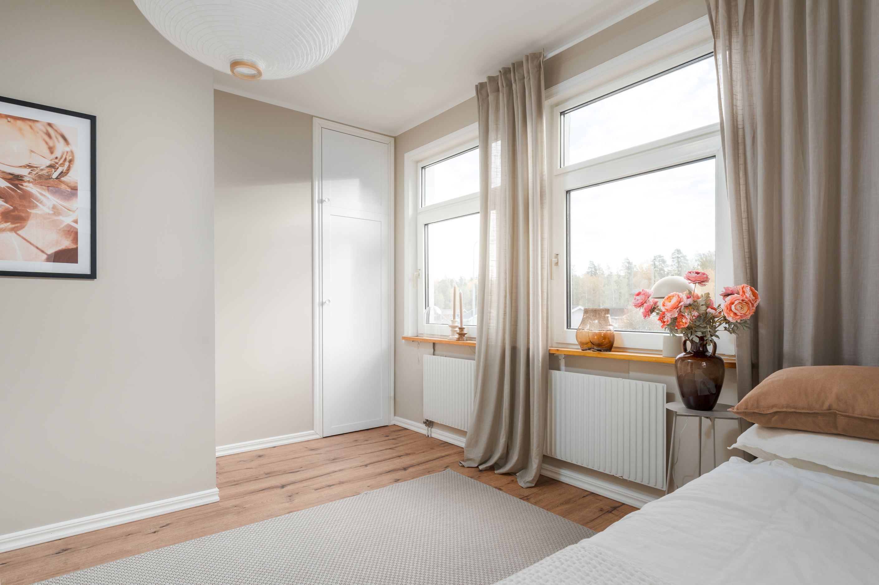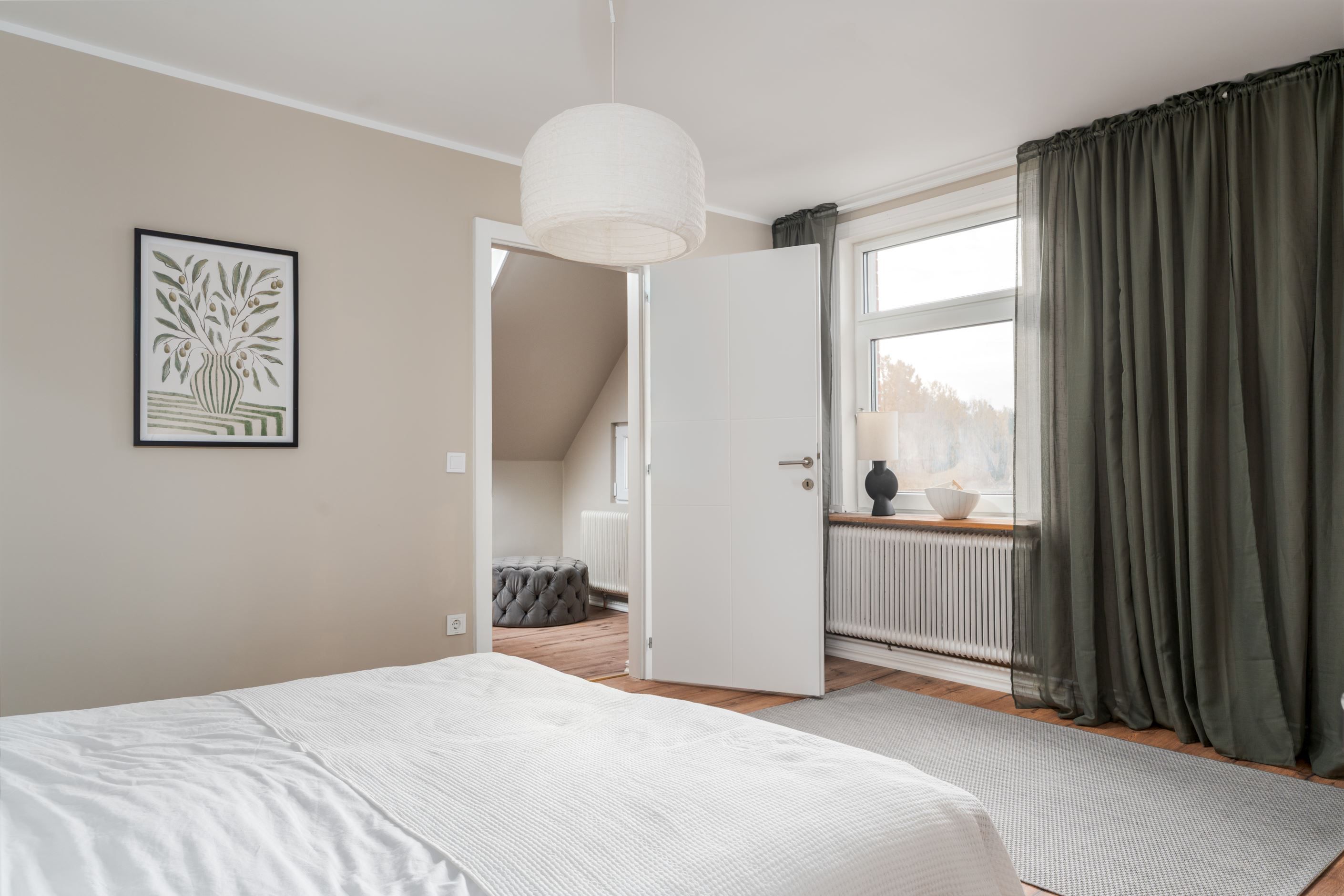 På entréplanet finns även ett sovrum – perfekt som gästrum, kontor eller för den som vill bo bekvämt utan trappor – samt ett helkaklat duschrum i tidlös design.