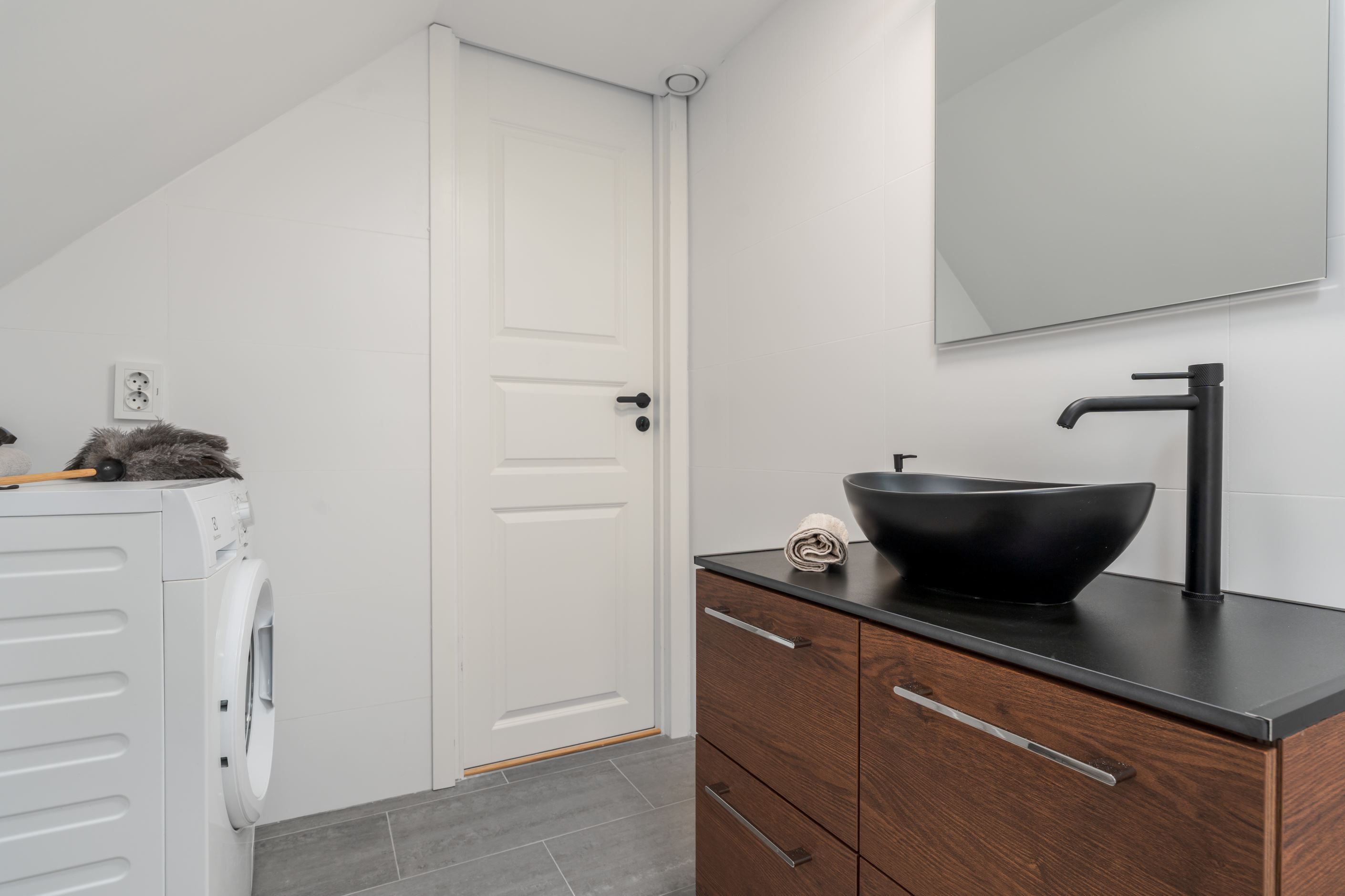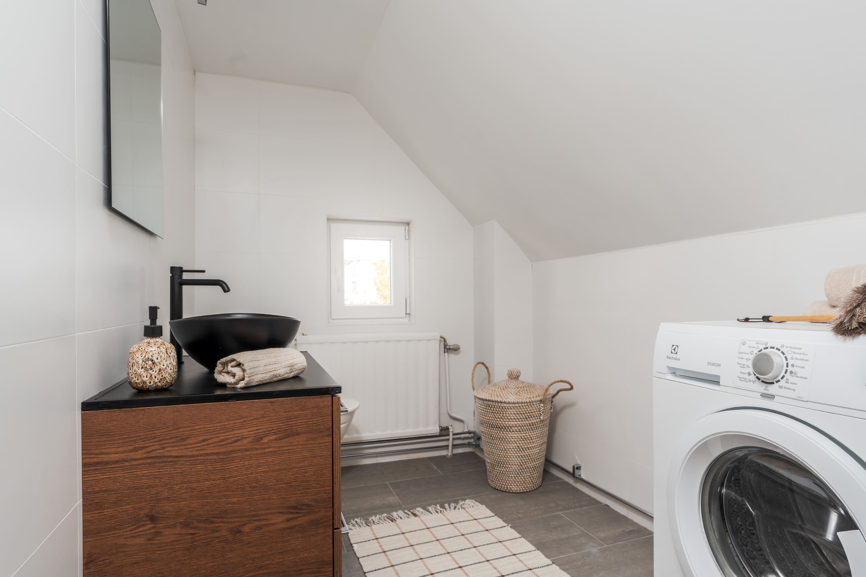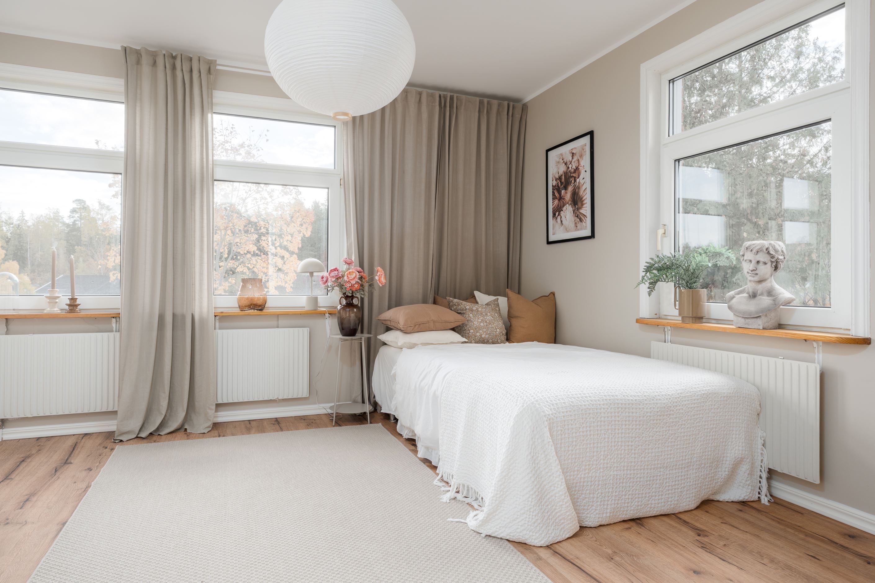 På entréplanet finns även ett sovrum – perfekt som gästrum, kontor eller för den som vill bo bekvämt utan trappor – samt ett helkaklat duschrum i tidlös design.