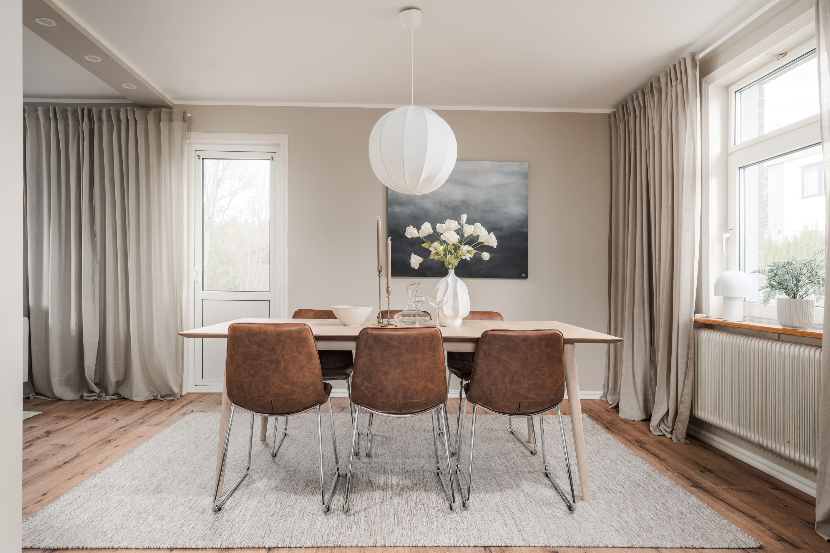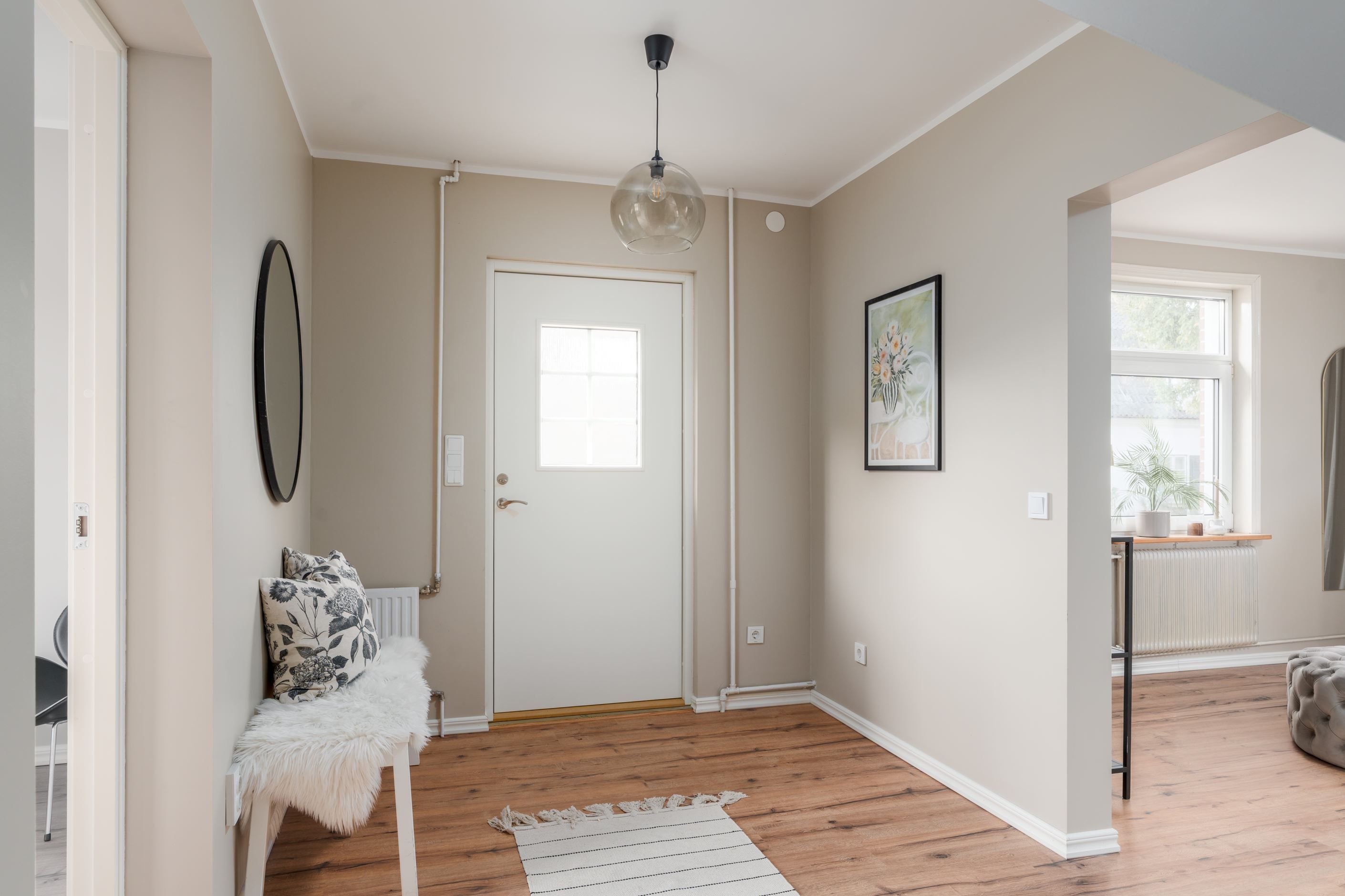 Redan i hallen möts du av en inbjudande atmosfär som leder vidare till husets hjärta – det öppna köket och vardagsrummet. Här samspelar ljus och rymd på ett harmoniskt sätt, med gott om plats för både soffgrupp, stort matbord och socialt umgänge. Den moderna planlösningen gör detta till en plats där familj och vänner gärna samlas.