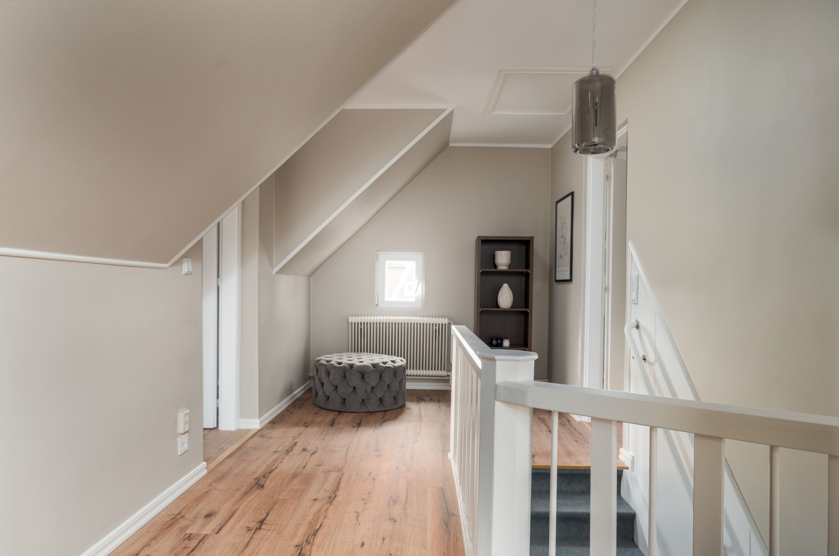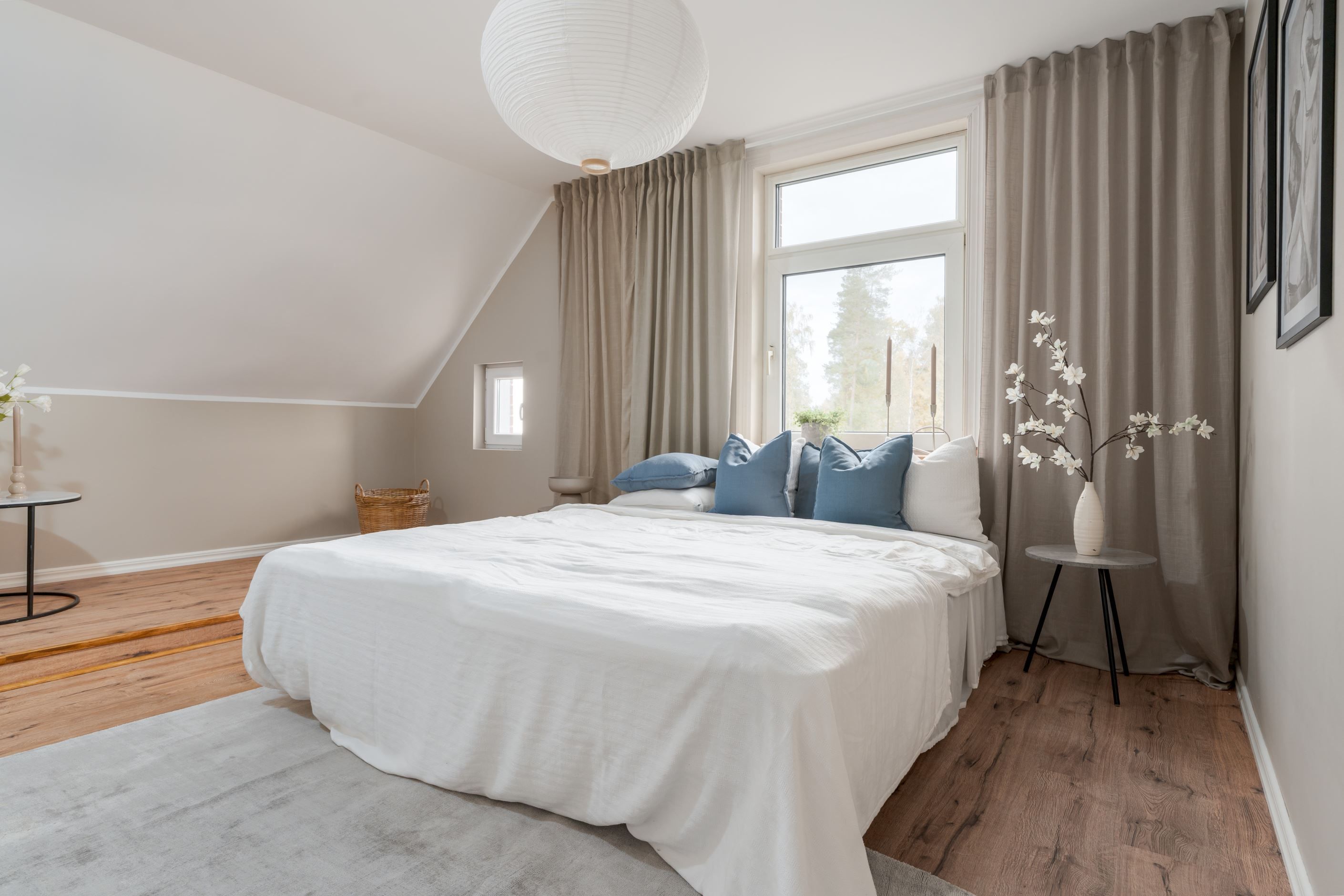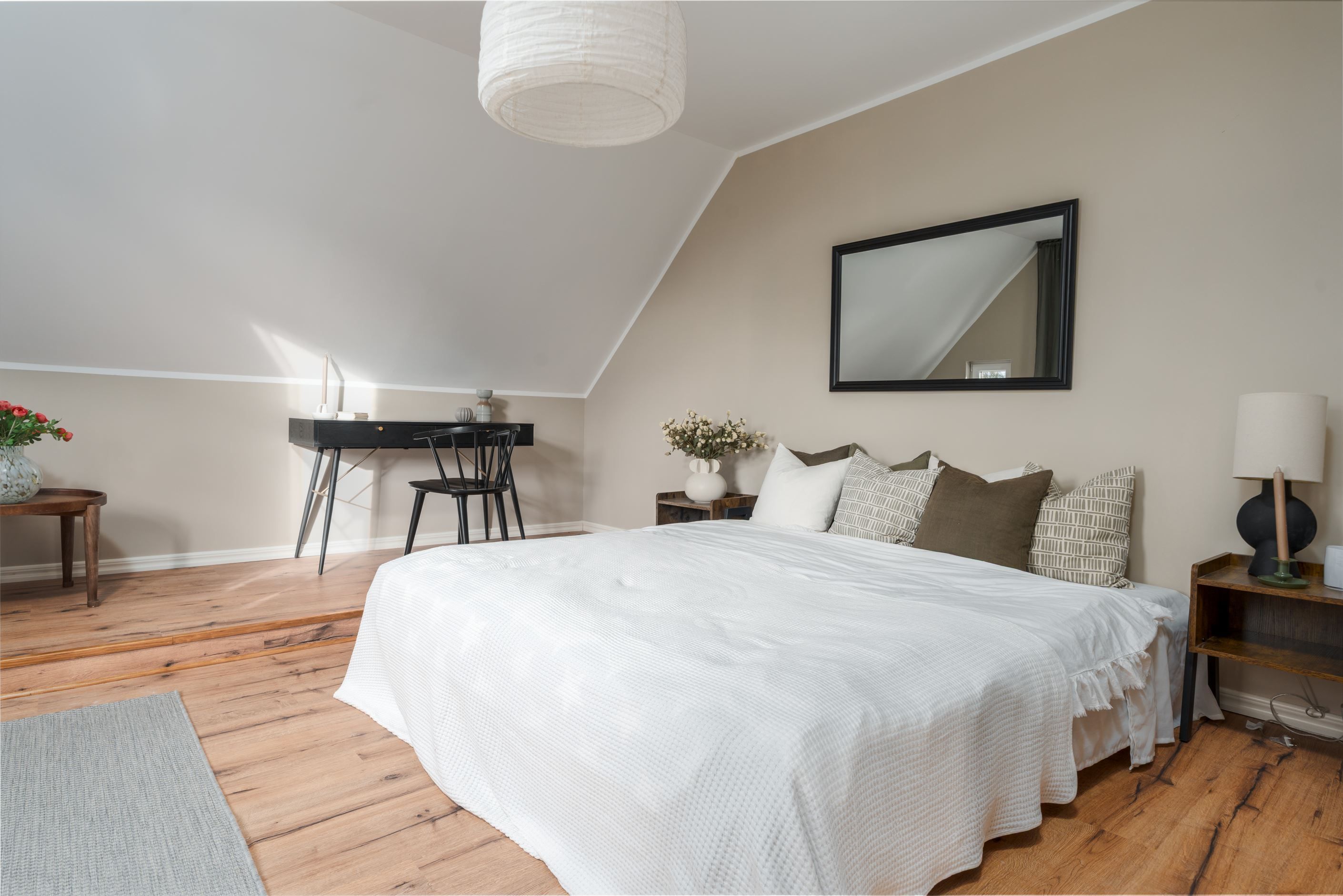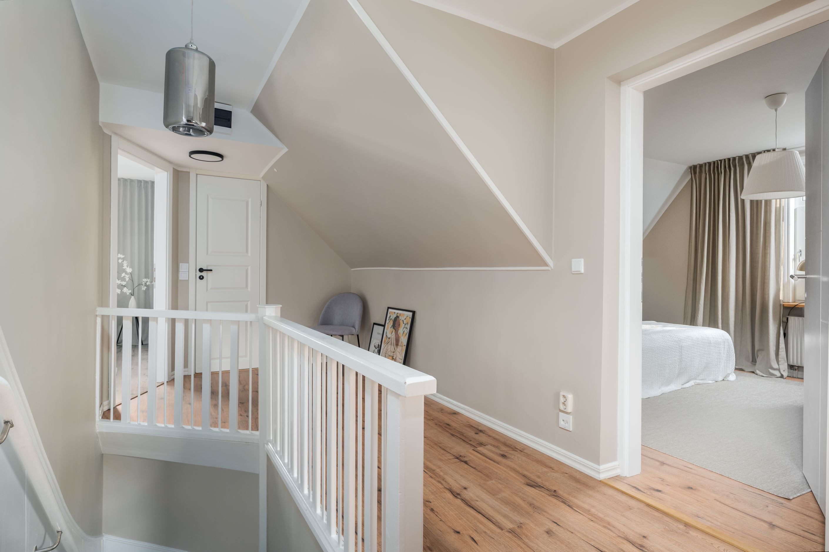 En trappa upp väntar den mer privata delen av huset med tre rymliga sovrum och en WC med handfat och tvättmaskin, vilket gör vardagen extra smidig.