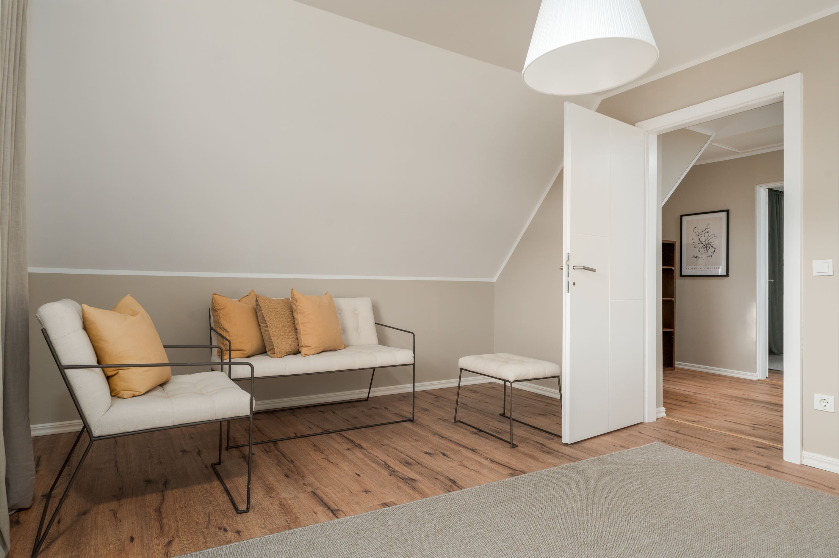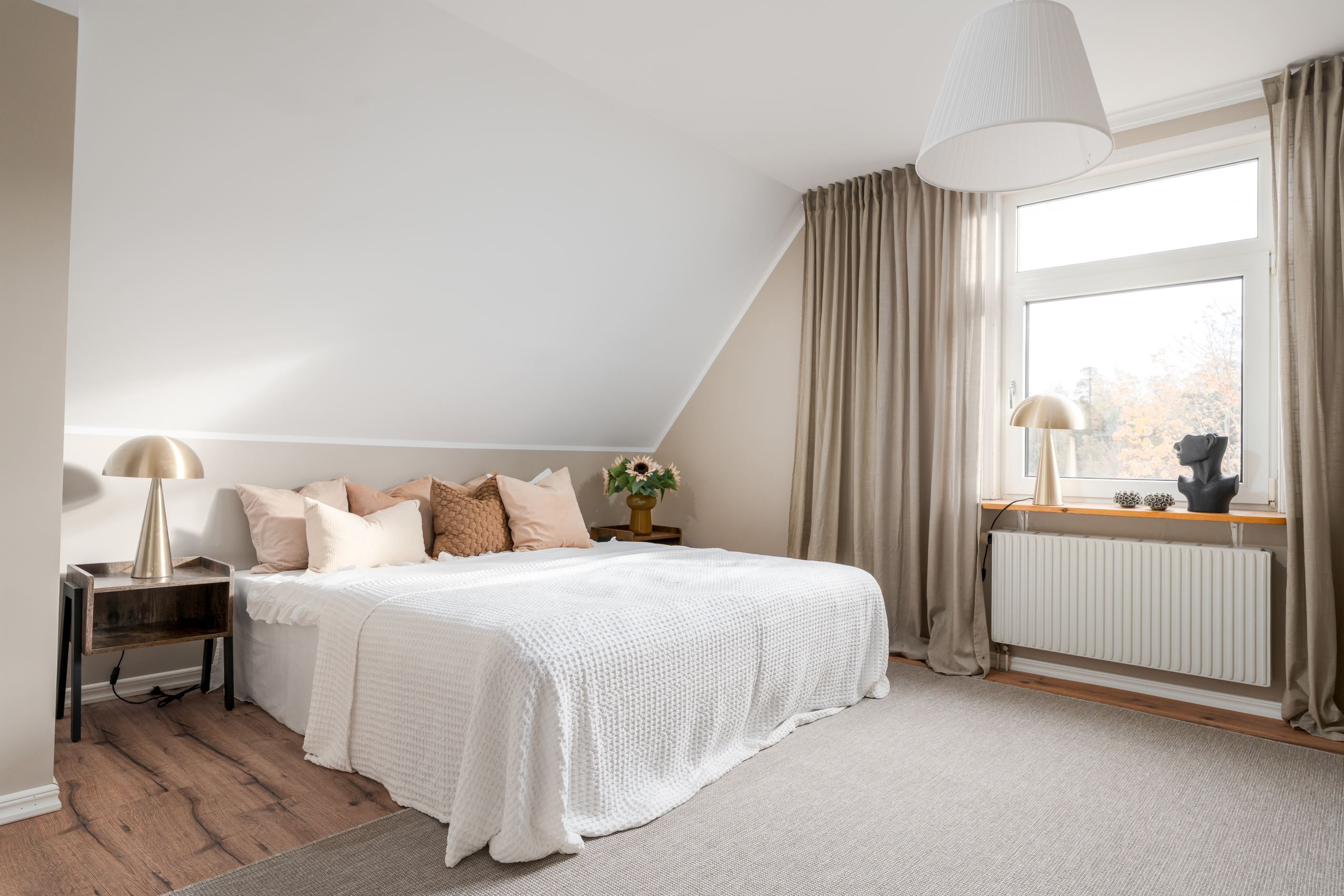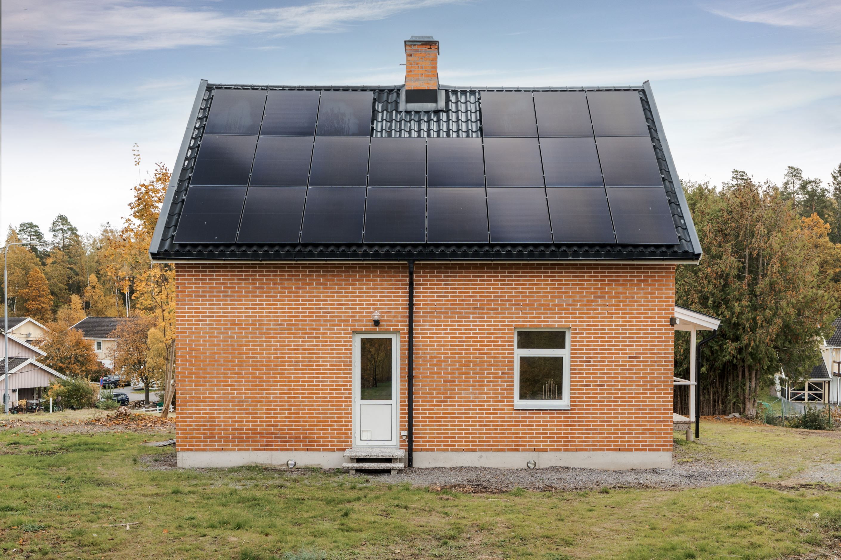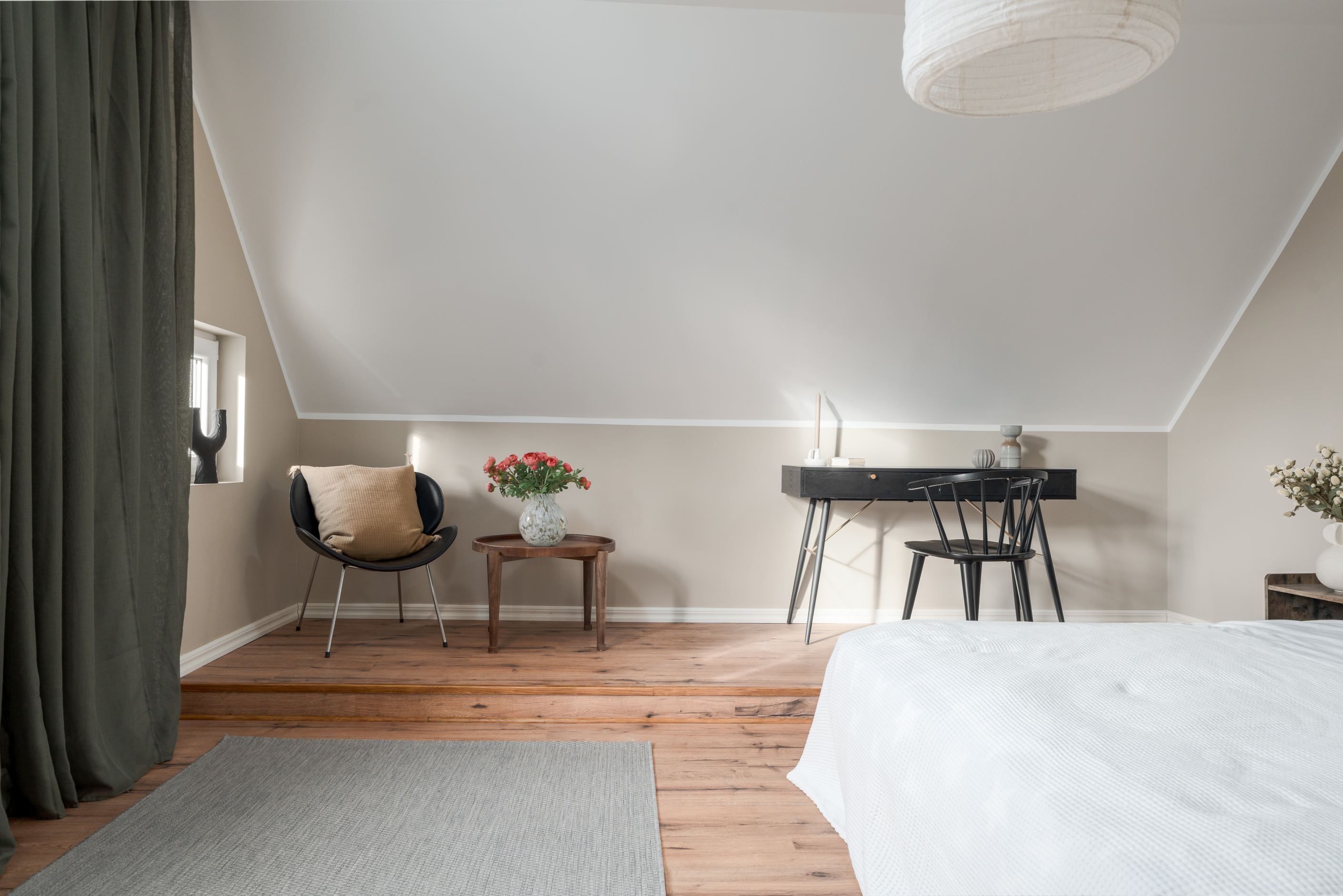 En trappa upp väntar den mer privata delen av huset med tre rymliga sovrum och en WC med handfat och tvättmaskin, vilket gör vardagen extra smidig.