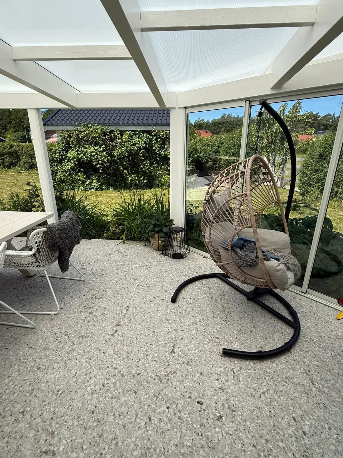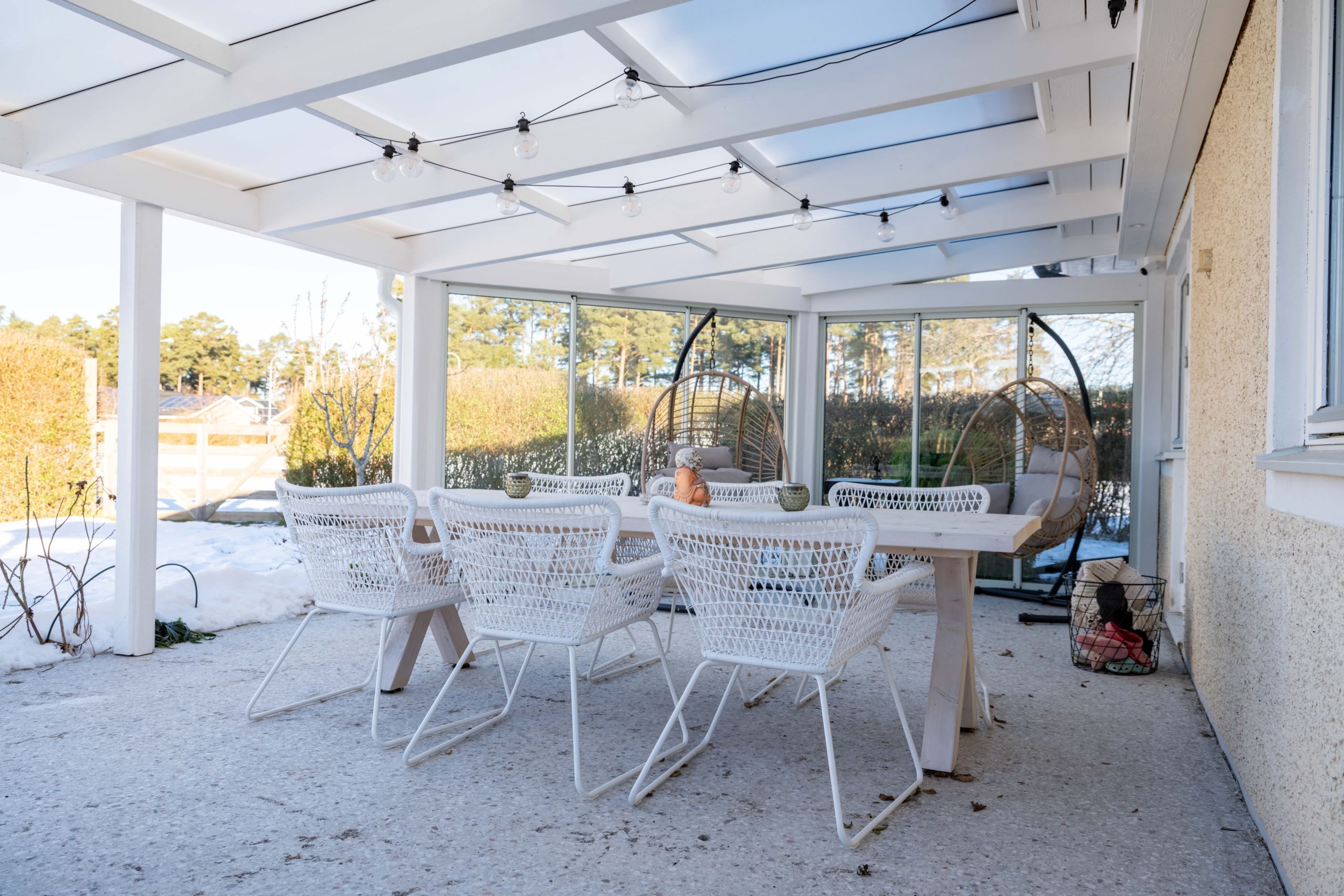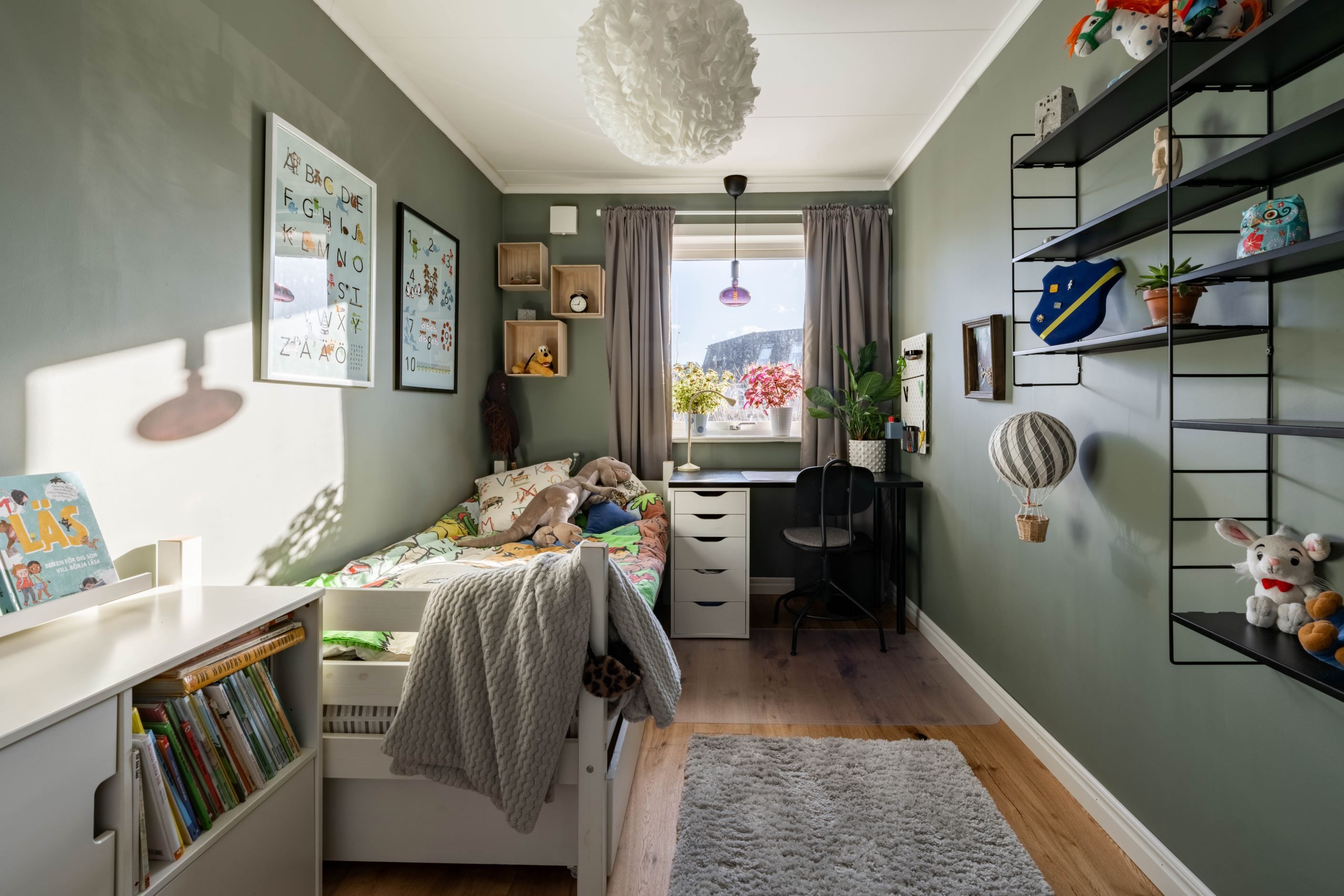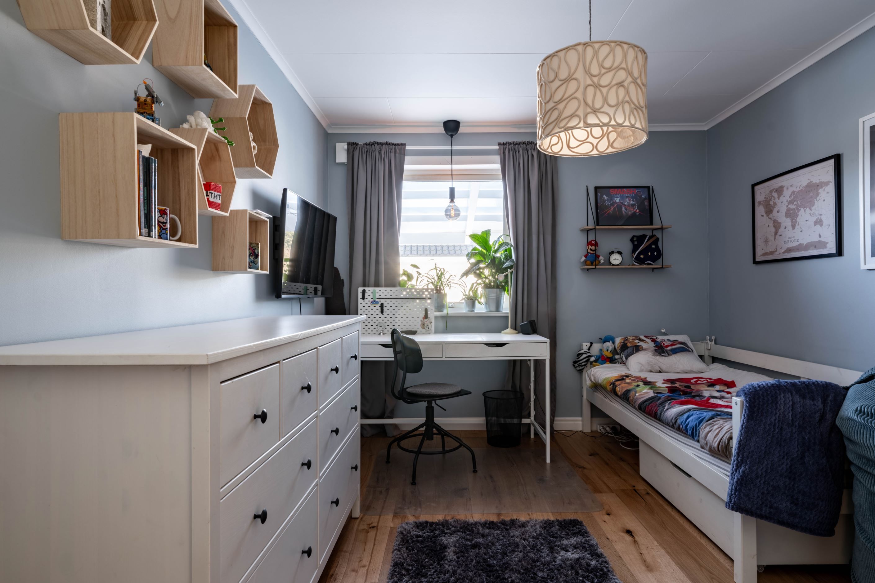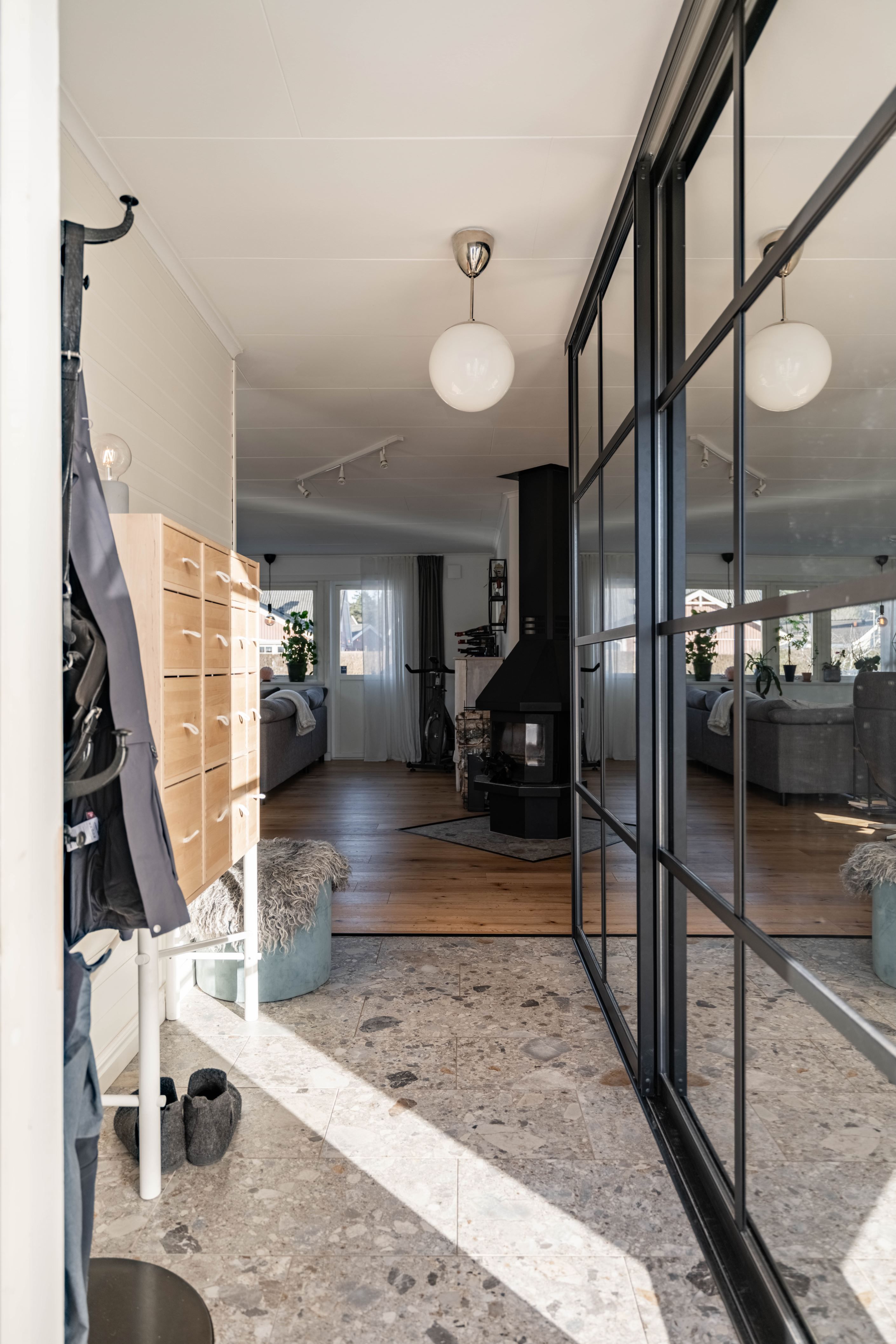 Garaget nås smidigt direkt inifrån huset, och i anslutning till garaget har man skapat ett extra rum som passar utmärkt som hemmakontor, gästrum eller tonårsrum – flexibelt och väldigt användbart.