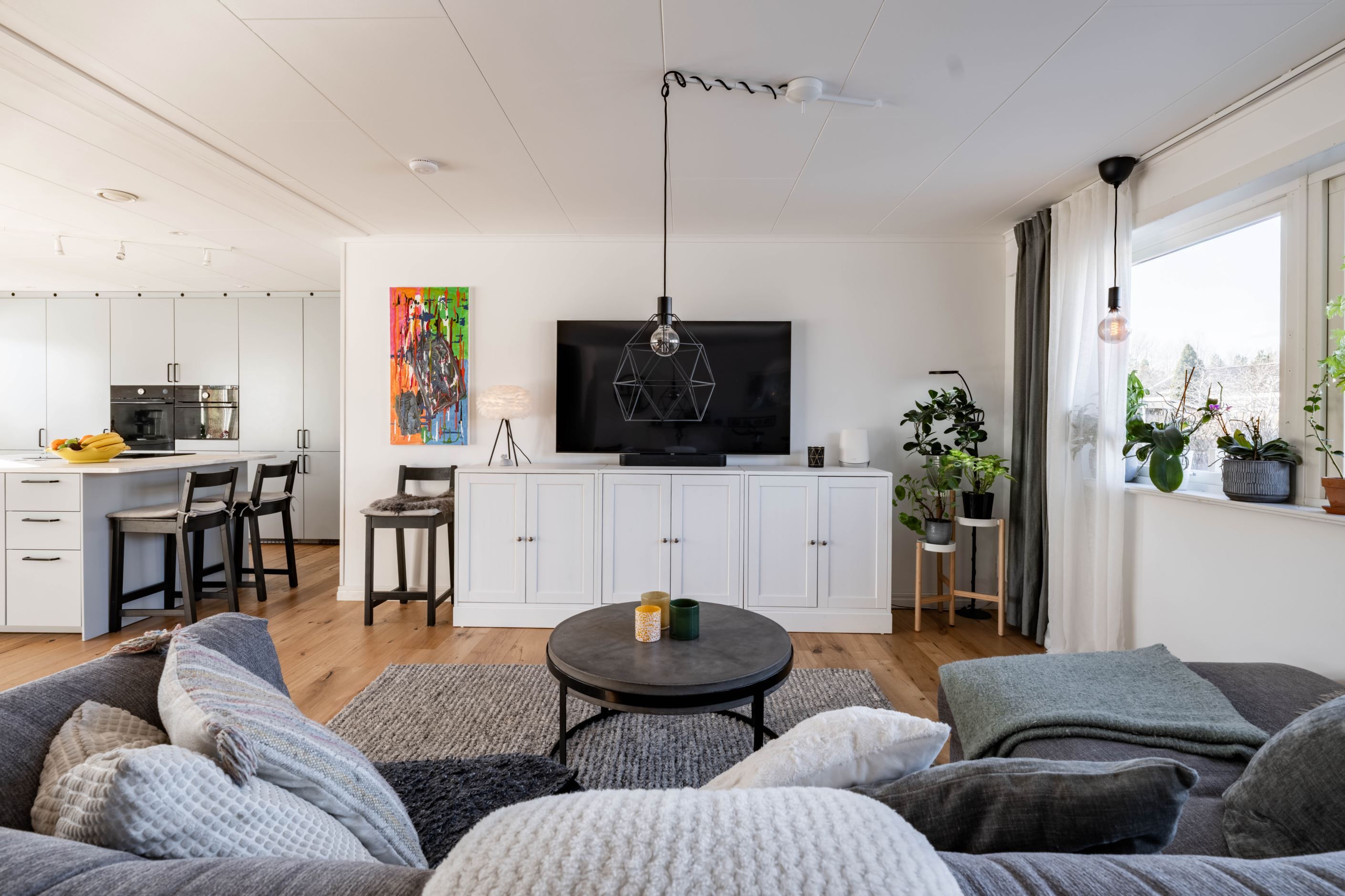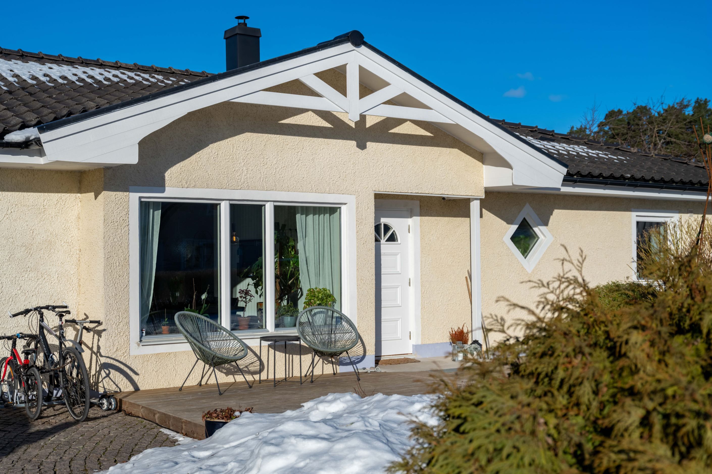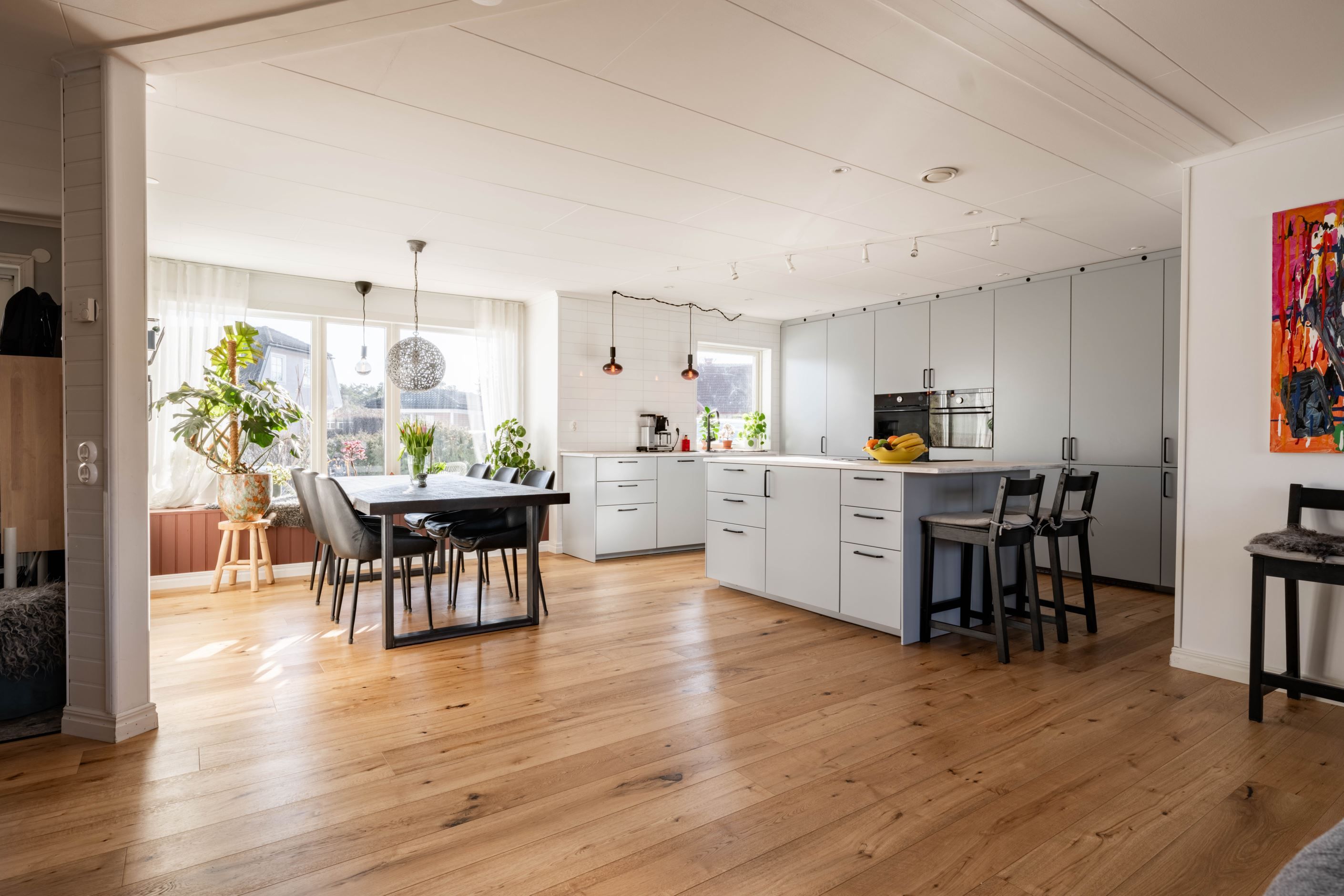 Denna härliga enplansvilla har under de senaste två åren genomgått en omfattande renovering där helheten stått i fokus. Planlösningen har öppnats upp för att skapa ljus, rymd och fina ytor att vara på. Ett helt nytt kök har byggts – modernt, mycket förvaring och snyggt – med en generös köksö som har bred häll med inbyggd fläkt. Vid fönstret finns en platsbyggd kökssoffa som både rymmer smart förvaring och som kan bli en självklar favoritplats för morgonkaffet.