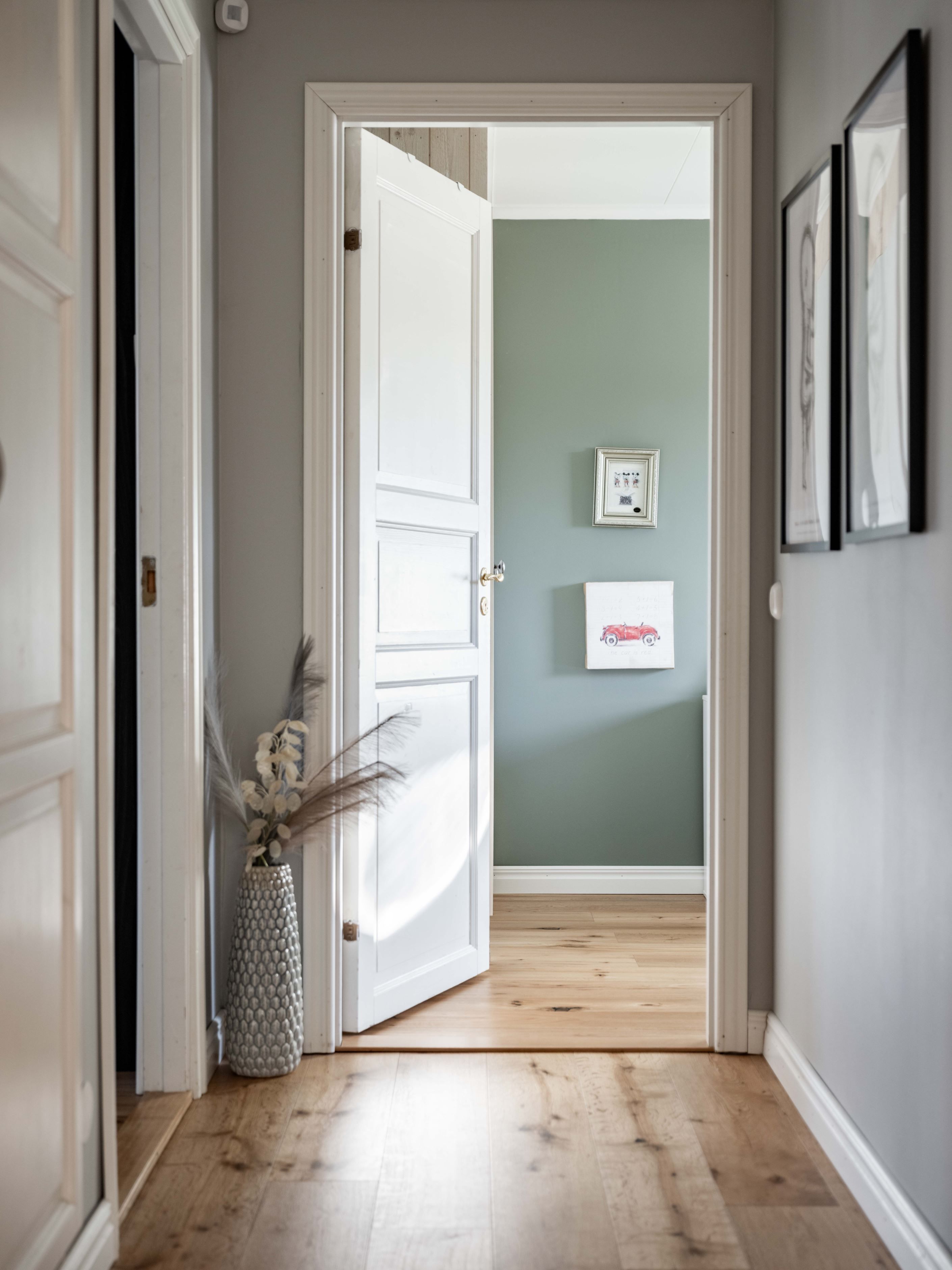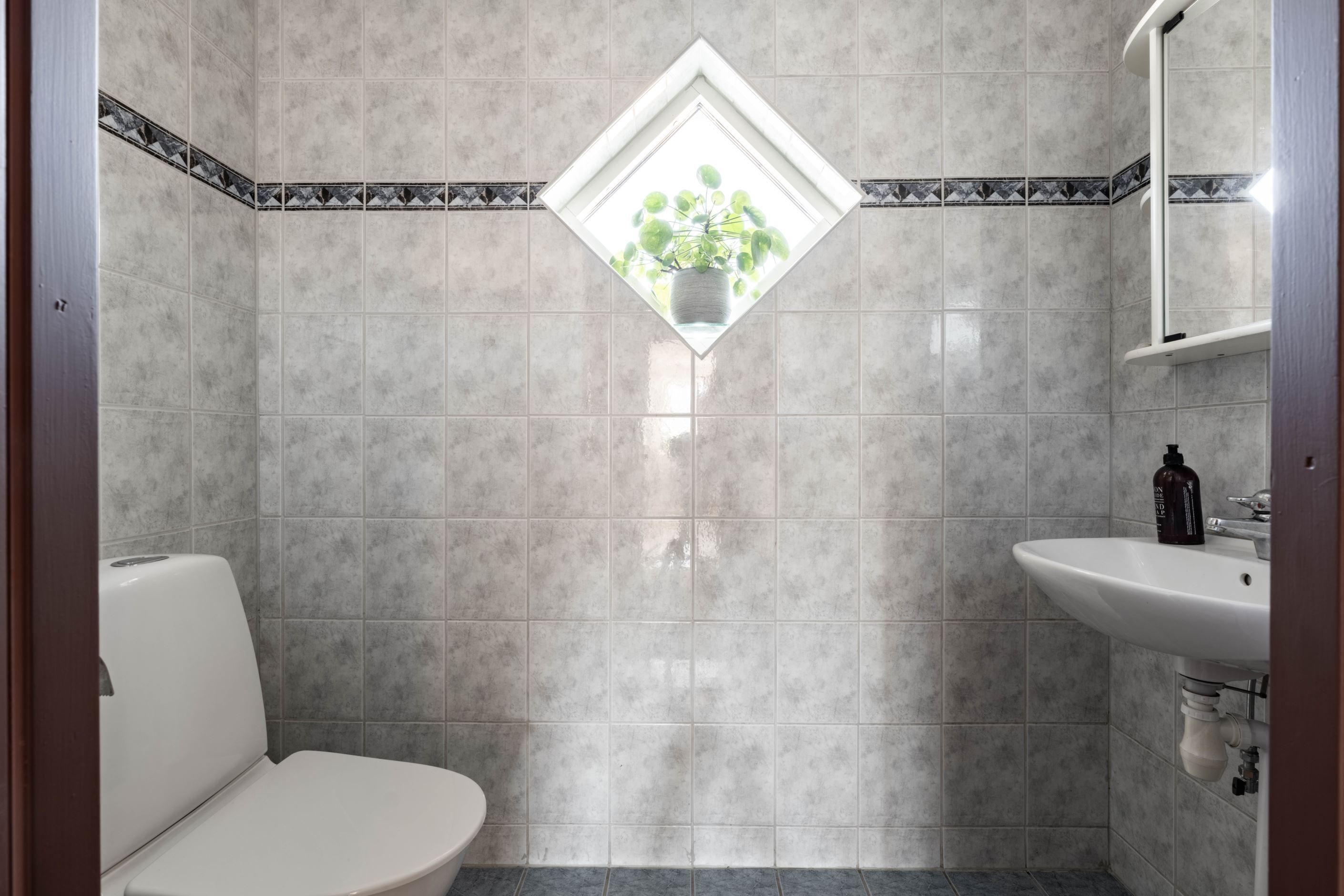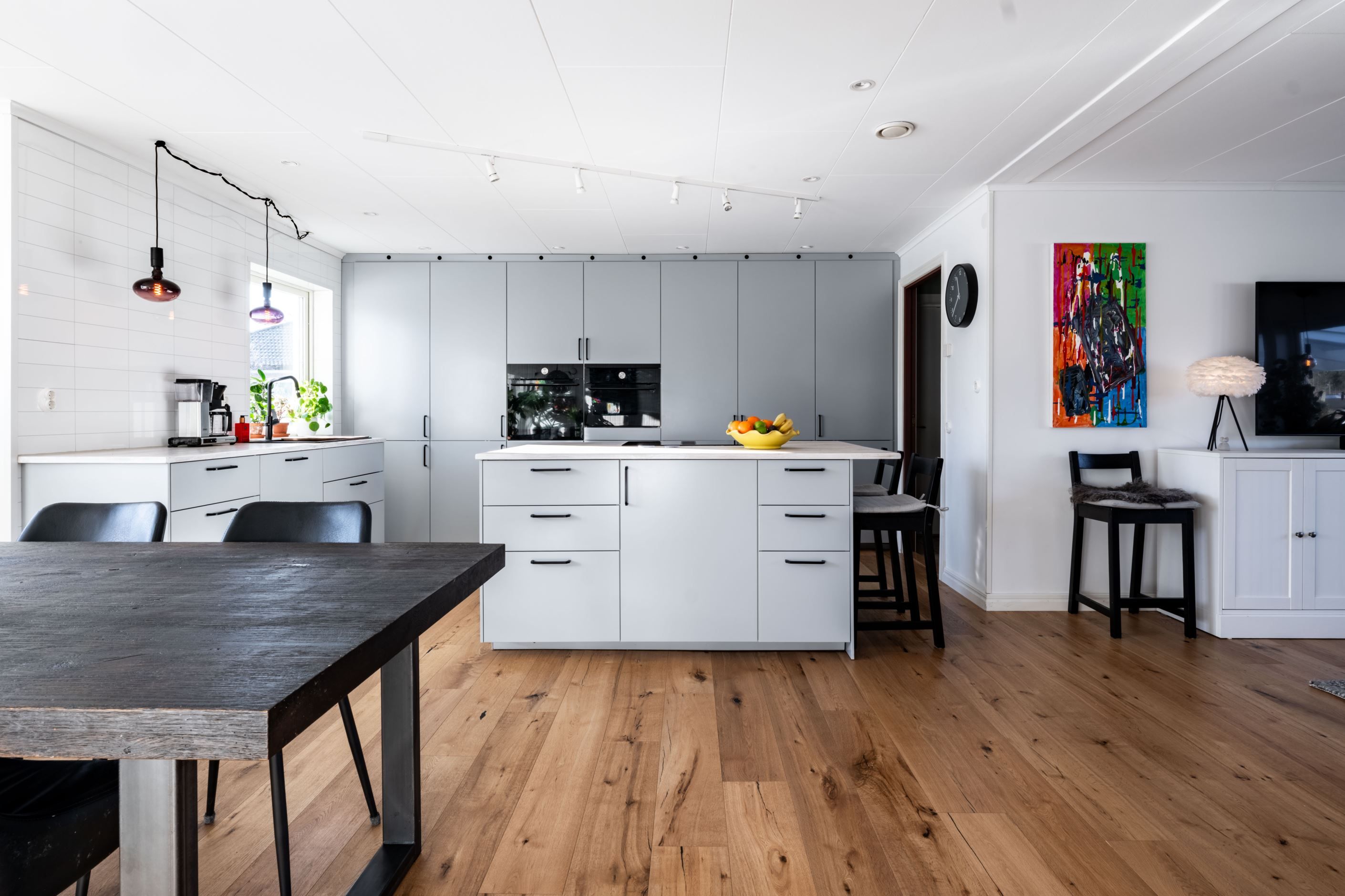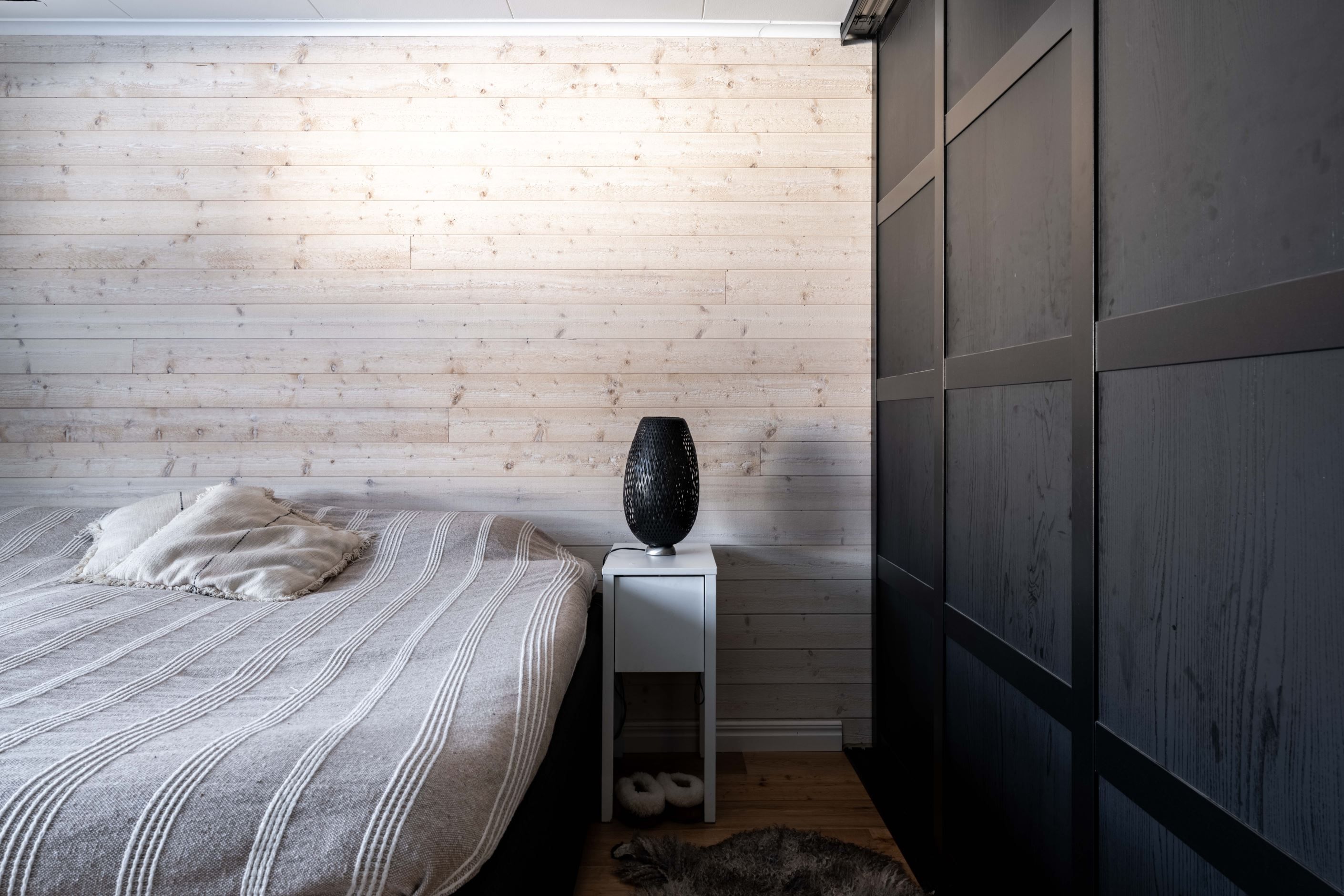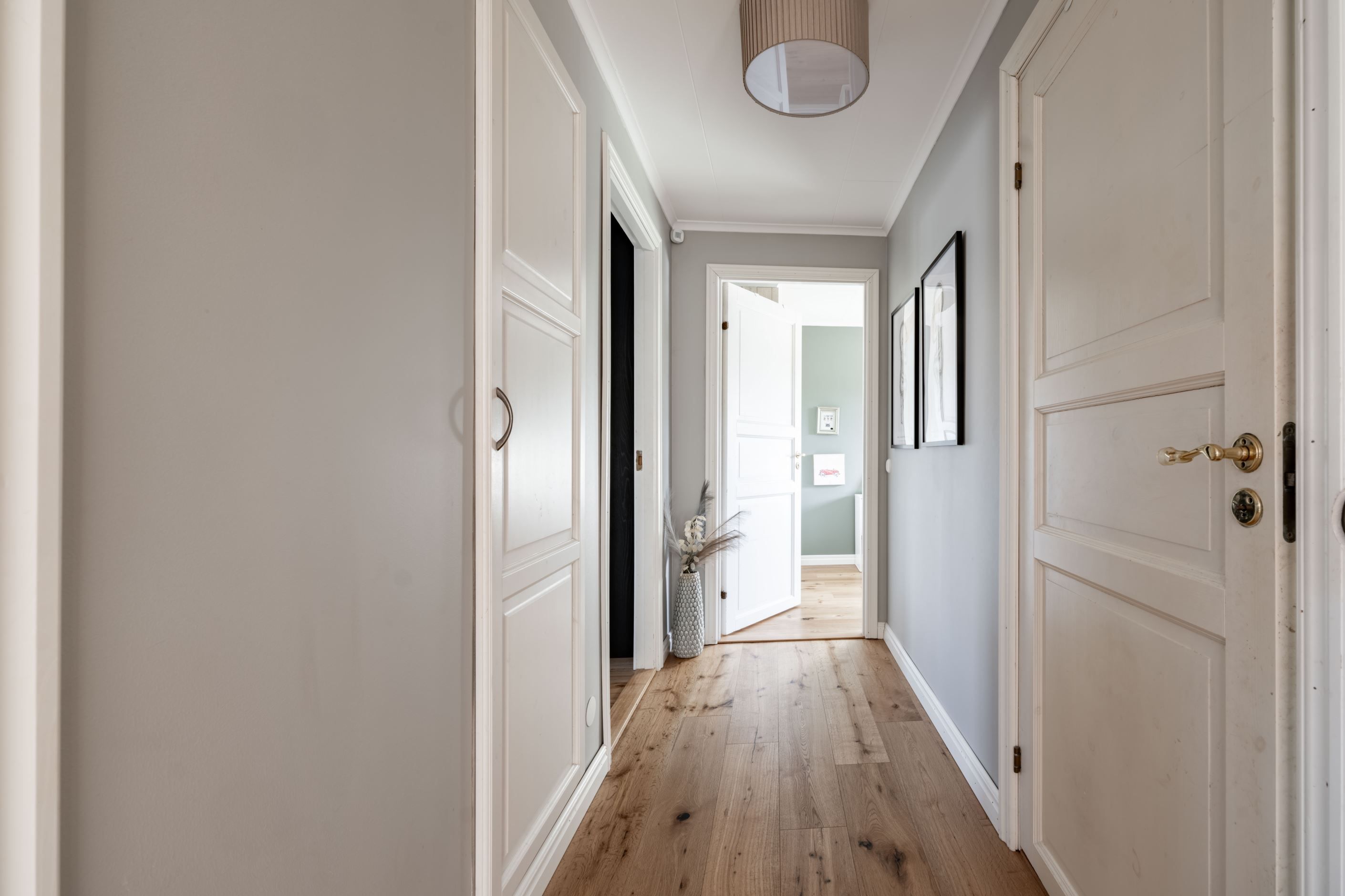 Mellan kök och vardagsrum är det öppet och i husets mitt står braskaminen som sprider både värme och mysfaktor till både kök och vardagsrum. Genomgående i huset ligger ett vackert enstavigt ekparkettgolv som ger ett lugnt och enhetligt intryck, med undantag för hallen där ett stilrent och praktiskt klinkergolv lagts. Samtliga väggar och tak är målade i harmoniska toner som förstärker den fina helhetskänslan. Och som du säkert redan listat ut så ligger inte ekparketten i badrum, toalett och tvättstuga heller.