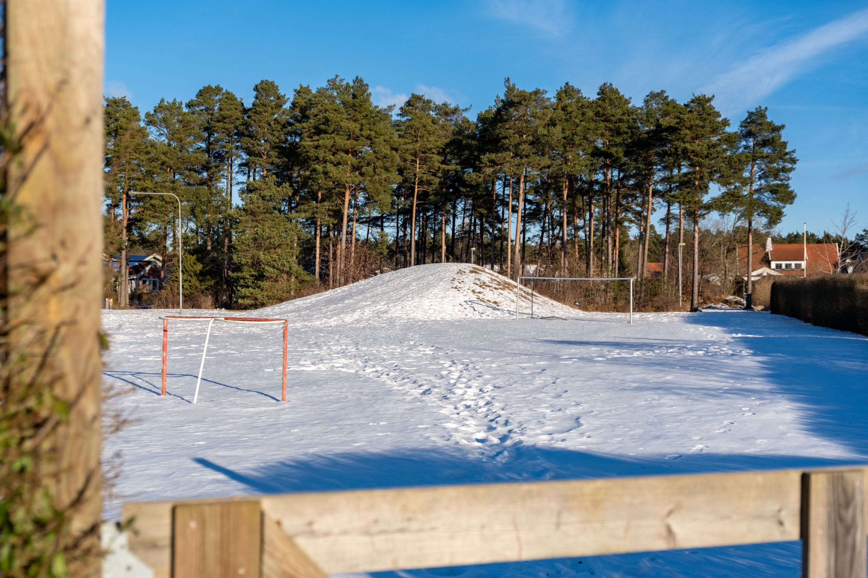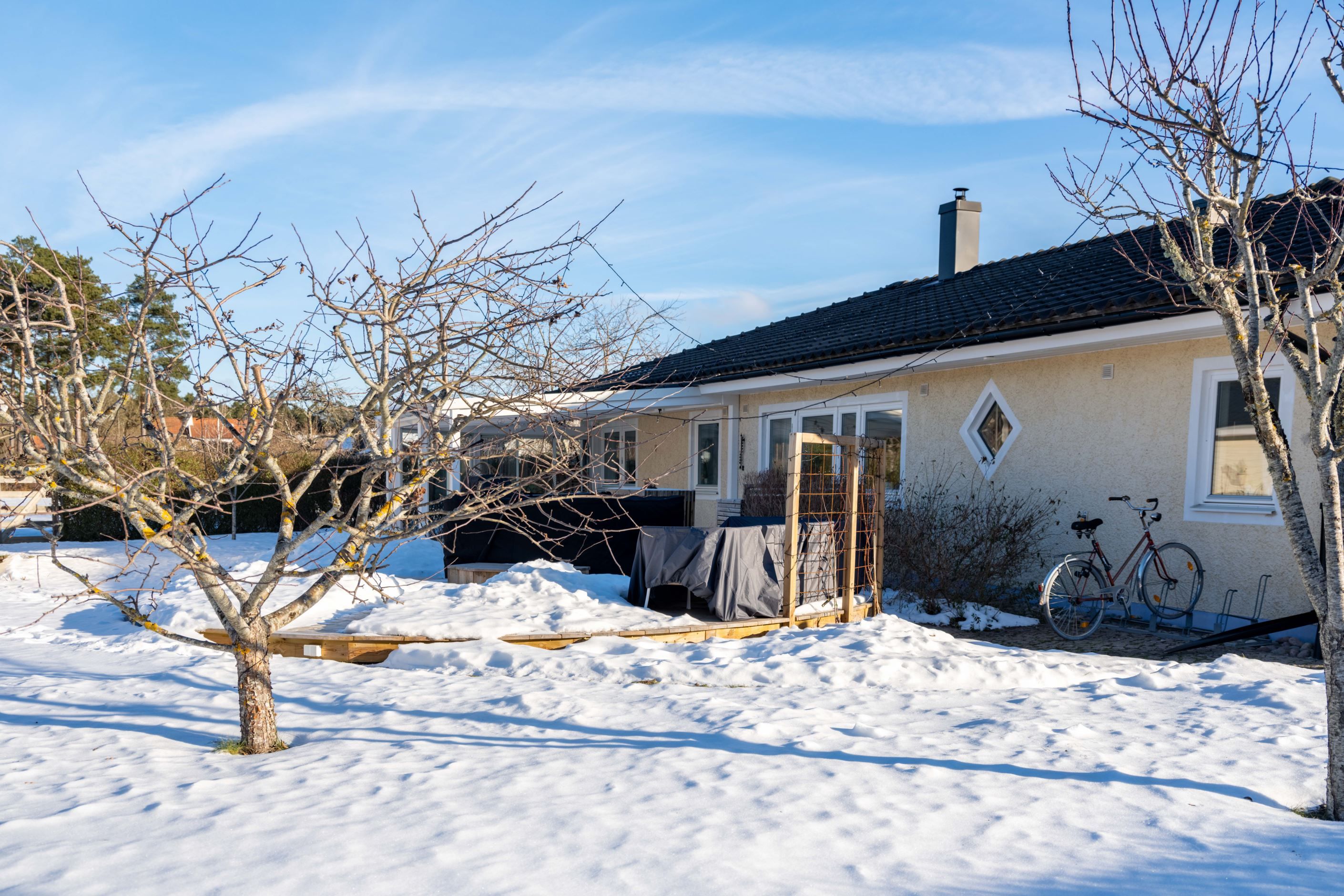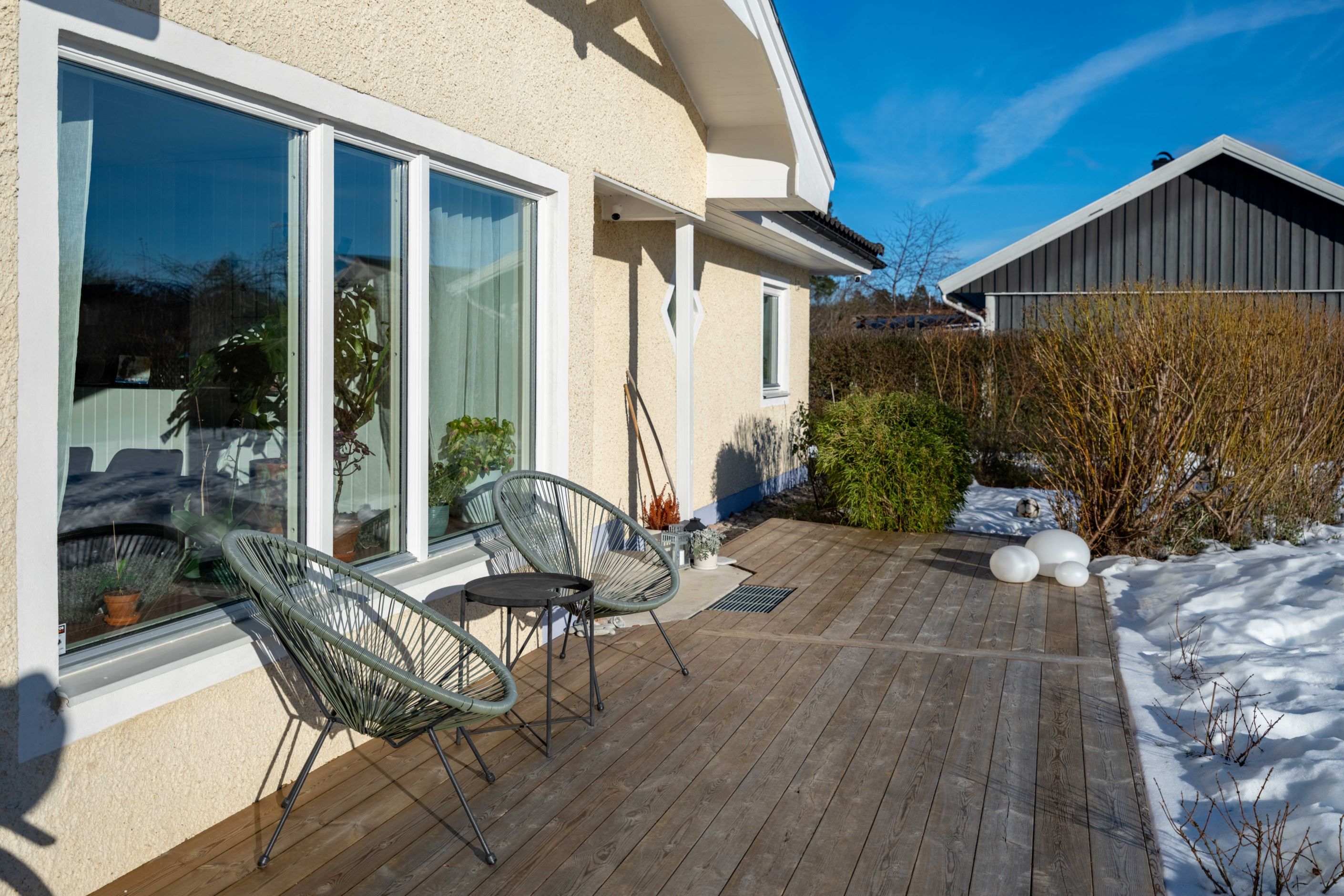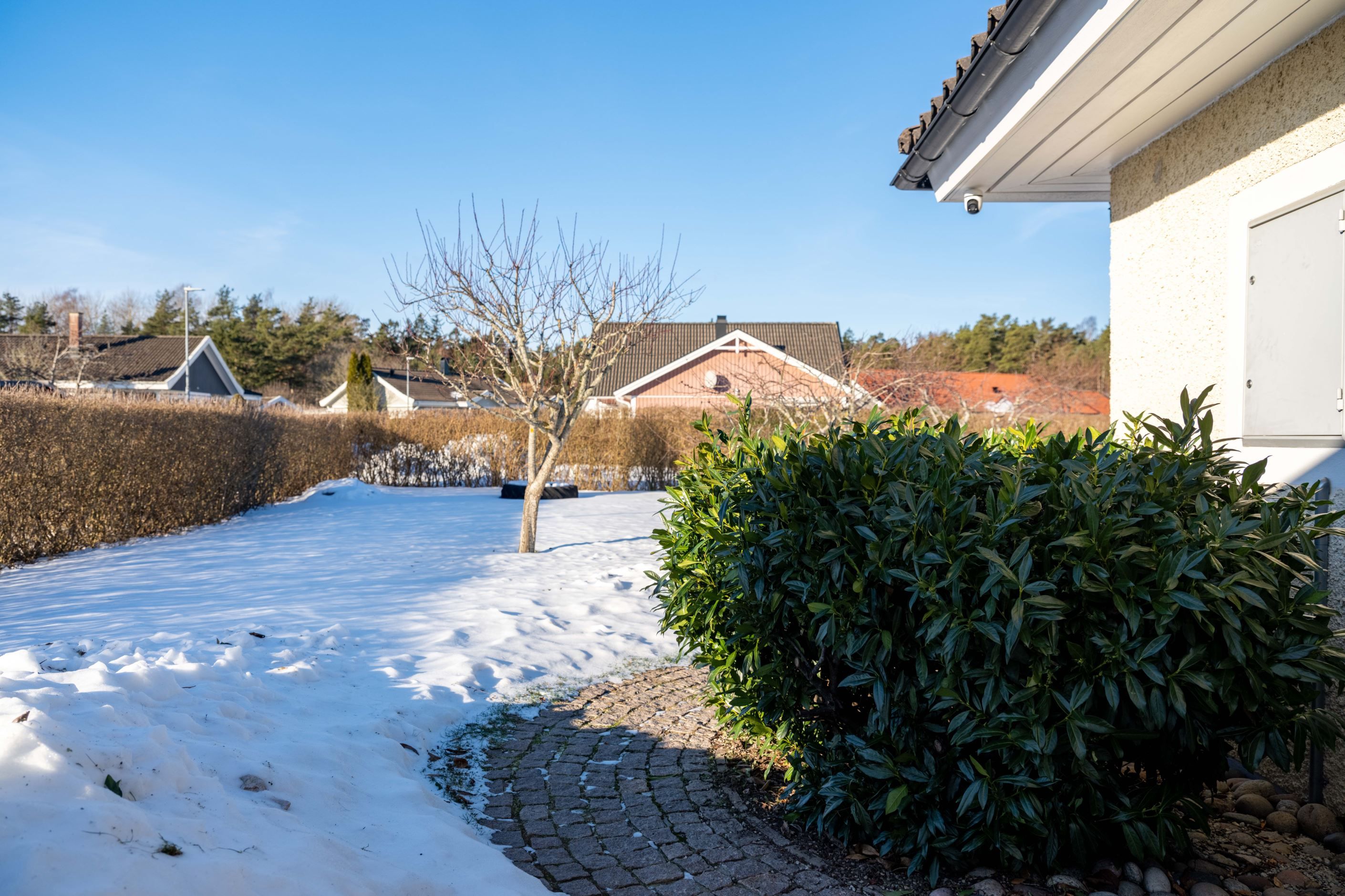 Tomten har ett kanonläge med grönområden som angränsar, vilket ger en härlig frihetskänsla och färre grannar inpå husknuten. Trädgården är vackert planterad och inbjuder till både lek och avkoppling. Genom grinden på baksidan kan barnen enkelt smita ut och leka. Läget erbjuder bästa tänkbara solläge, och direkt utanför entrén finns en trätrall som är som gjord för att slå sig ner med en kopp kaffe eller ett glas i kvällssolen.