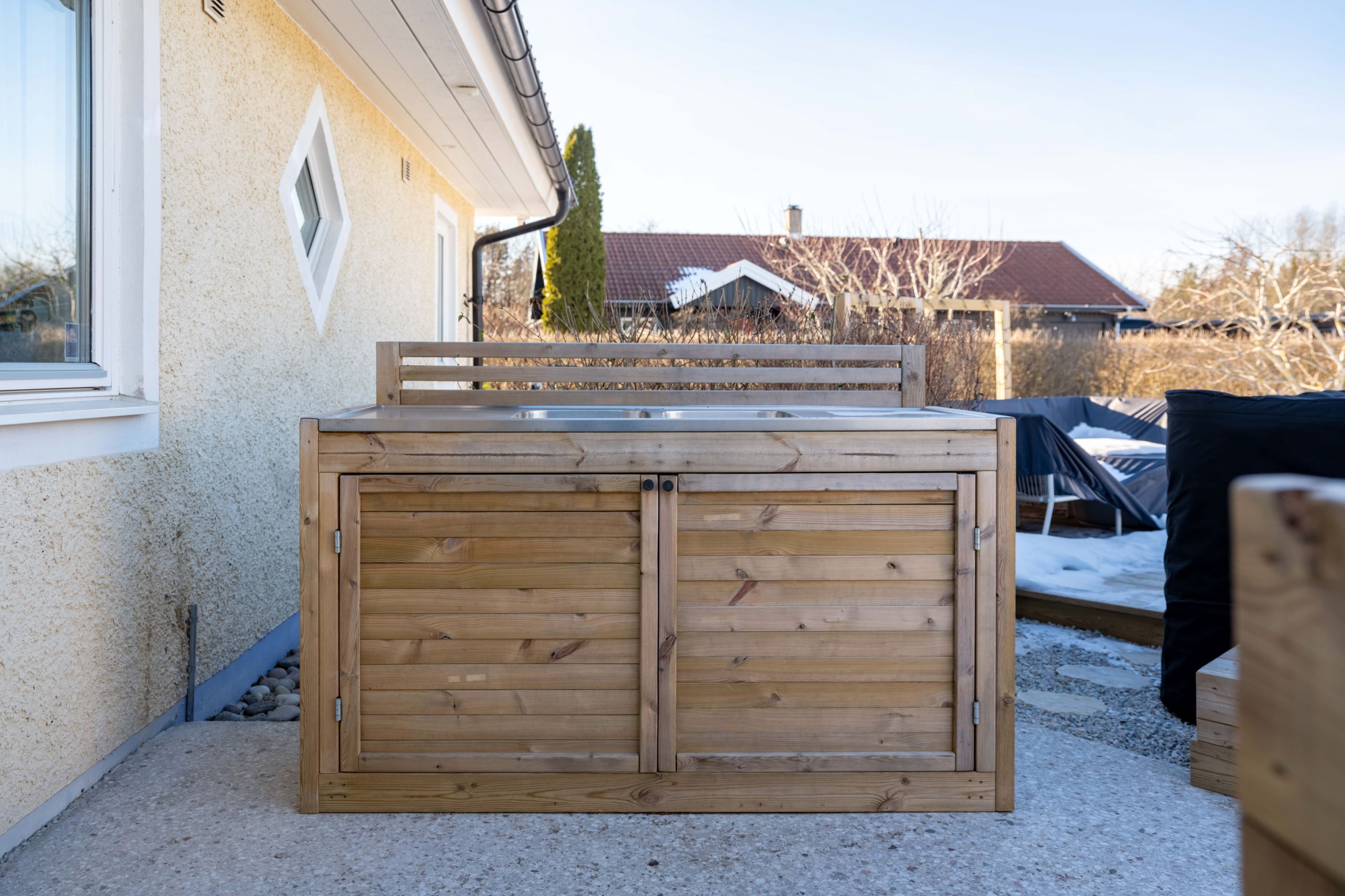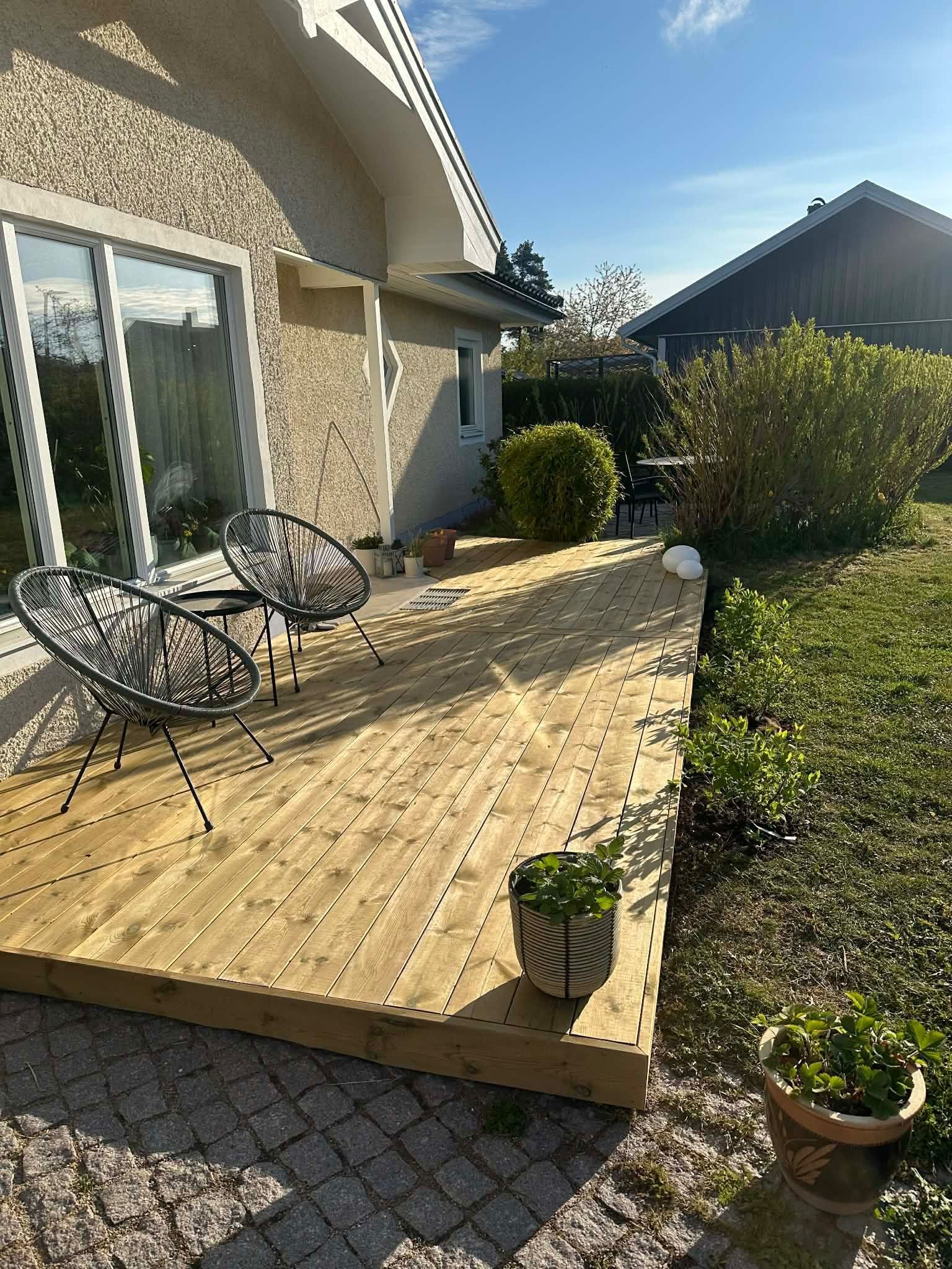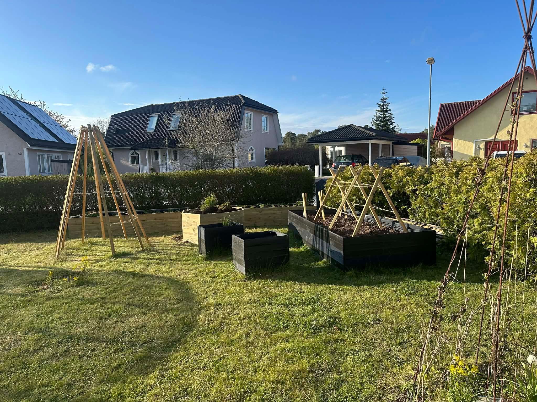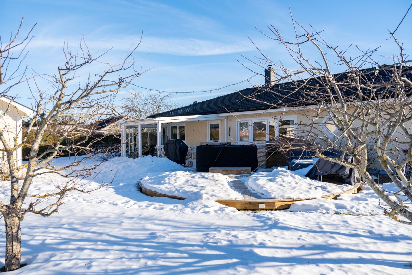 Tomten har ett kanonläge med grönområden som angränsar, vilket ger en härlig frihetskänsla och färre grannar inpå husknuten. Trädgården är vackert planterad och inbjuder till både lek och avkoppling. Genom grinden på baksidan kan barnen enkelt smita ut och leka. Läget erbjuder bästa tänkbara solläge, och direkt utanför entrén finns en trätrall som är som gjord för att slå sig ner med en kopp kaffe eller ett glas i kvällssolen.