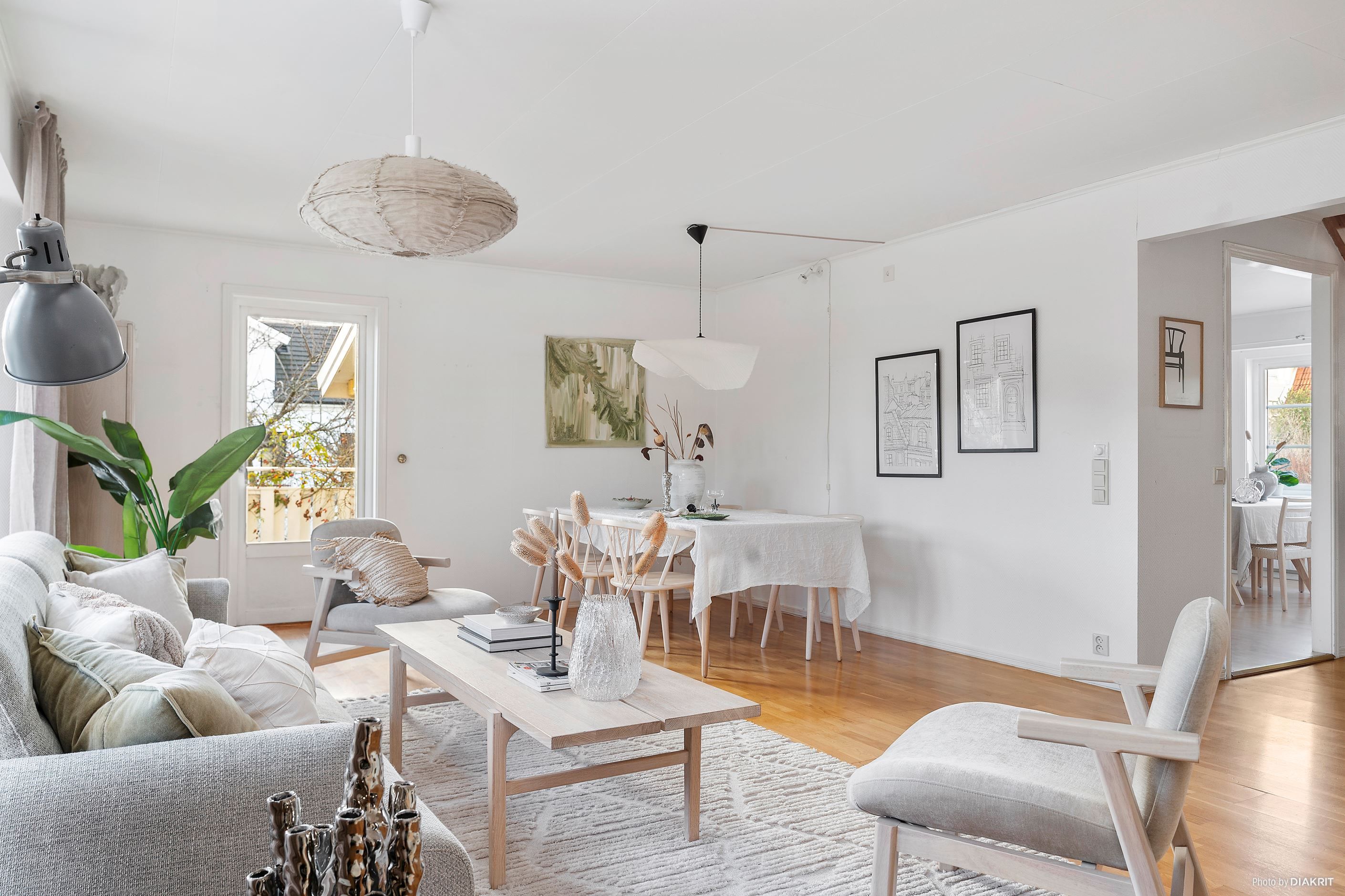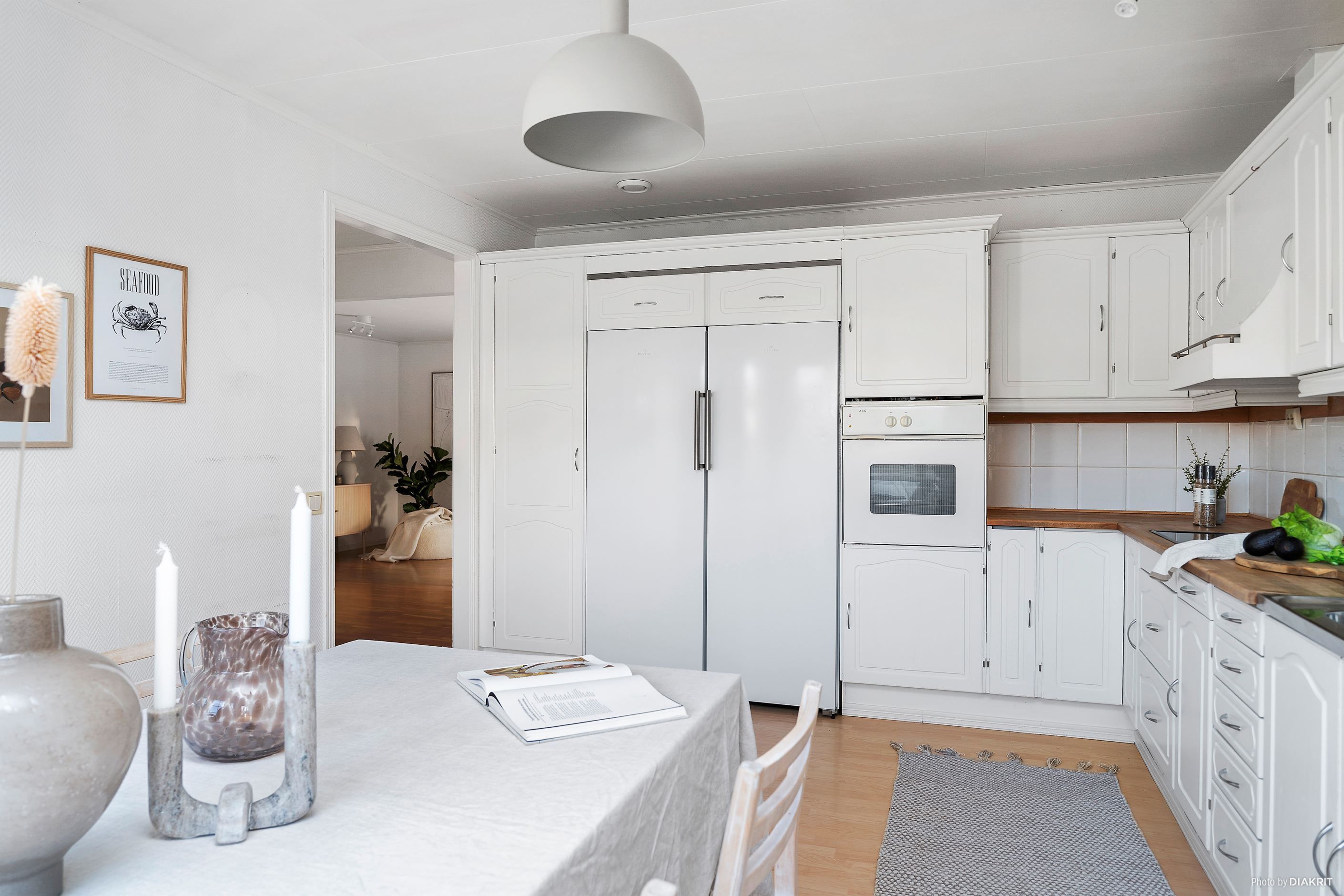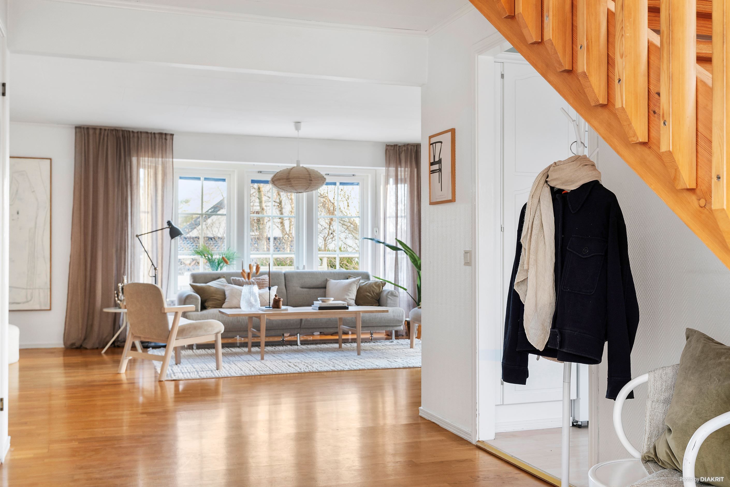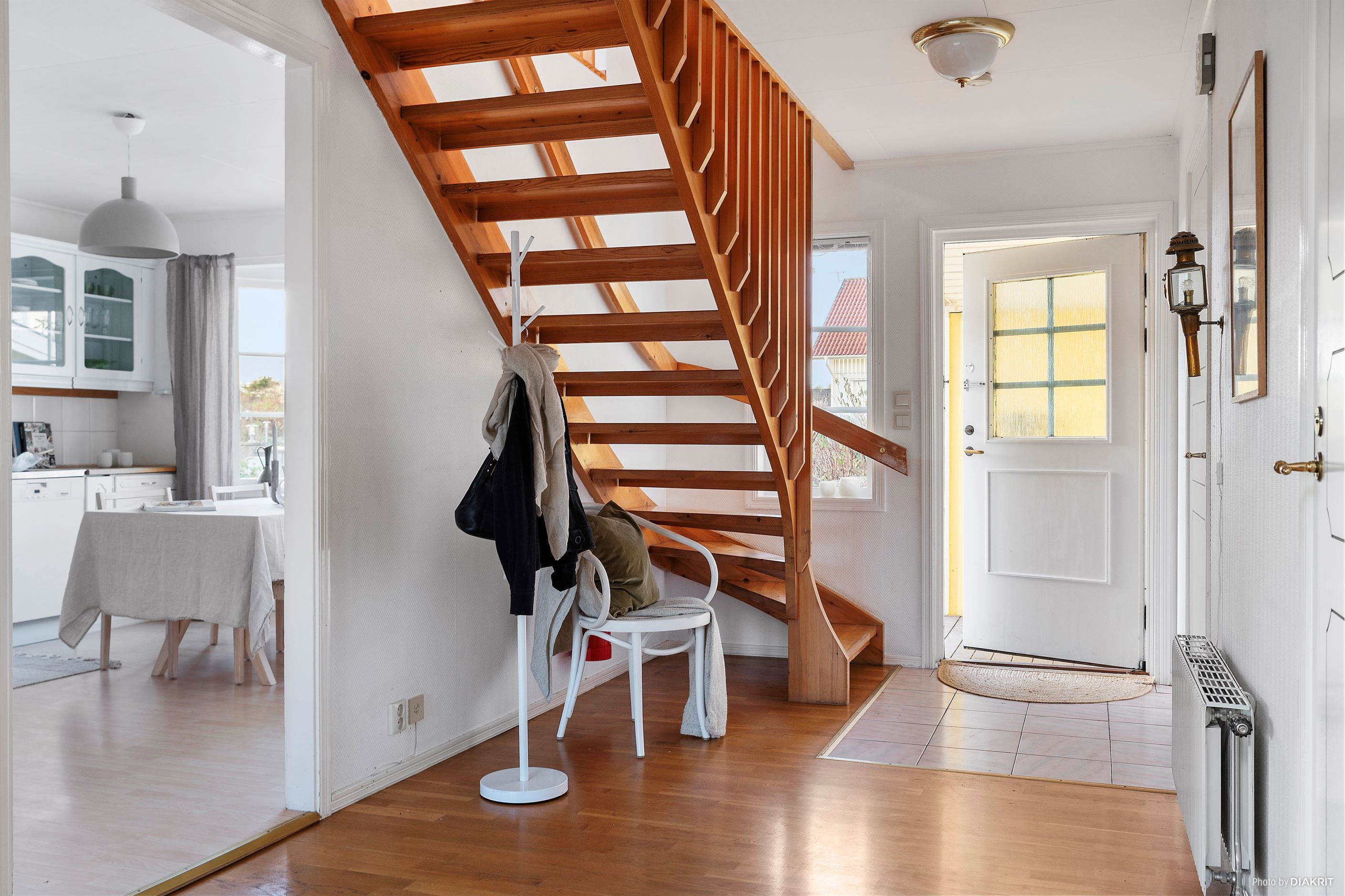 Invändigt erbjuds ni sällskapsytor på entréplanet med vardagsrum och kök. Från vardagsrummet ligger utgången till baksidans soliga altan. Köket är ljust med plats för ett matbord. På entréplan har ni även ett helkaklat badrum med dusch, en separat tvättstuga, en praktisk hall.