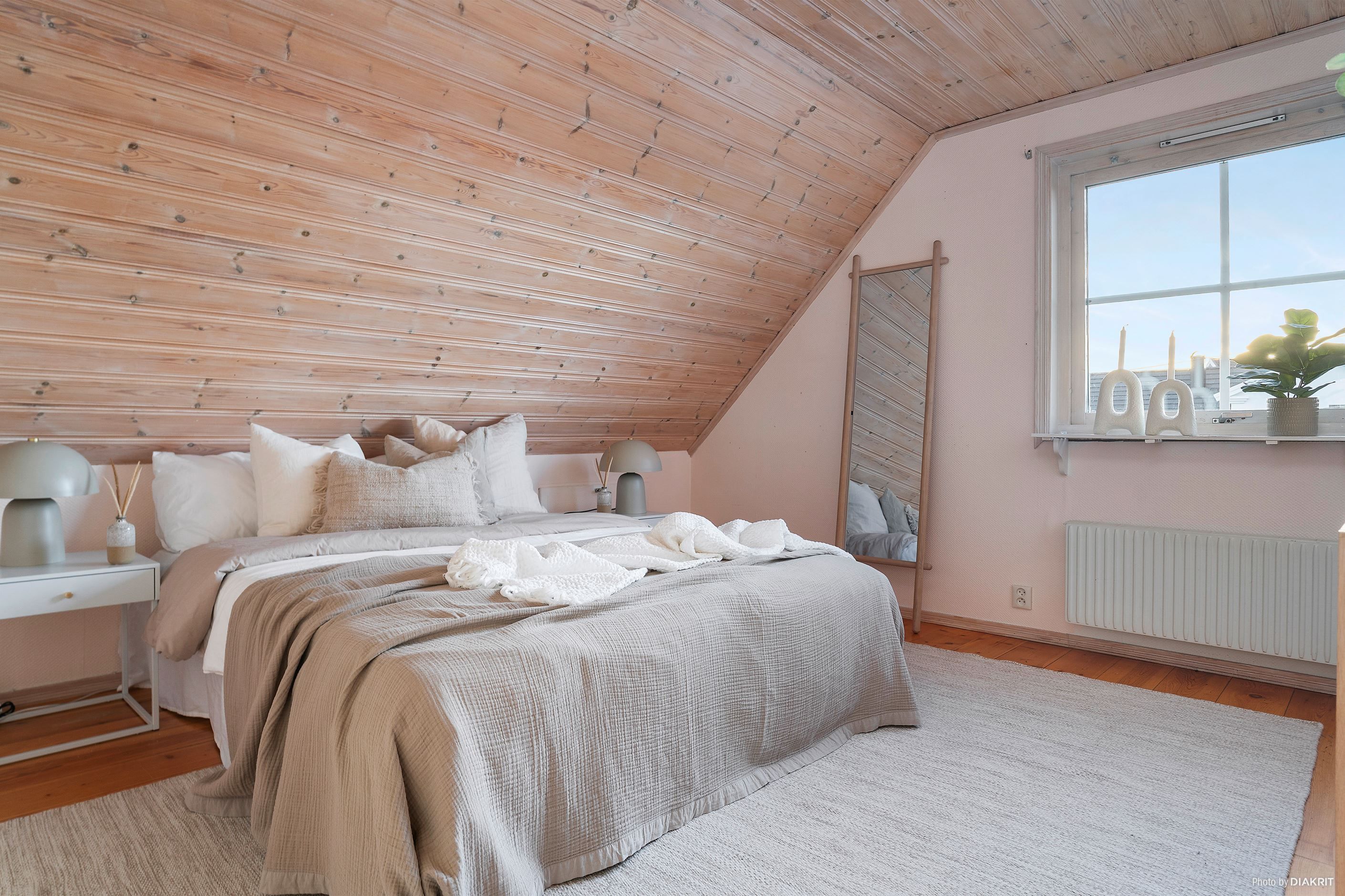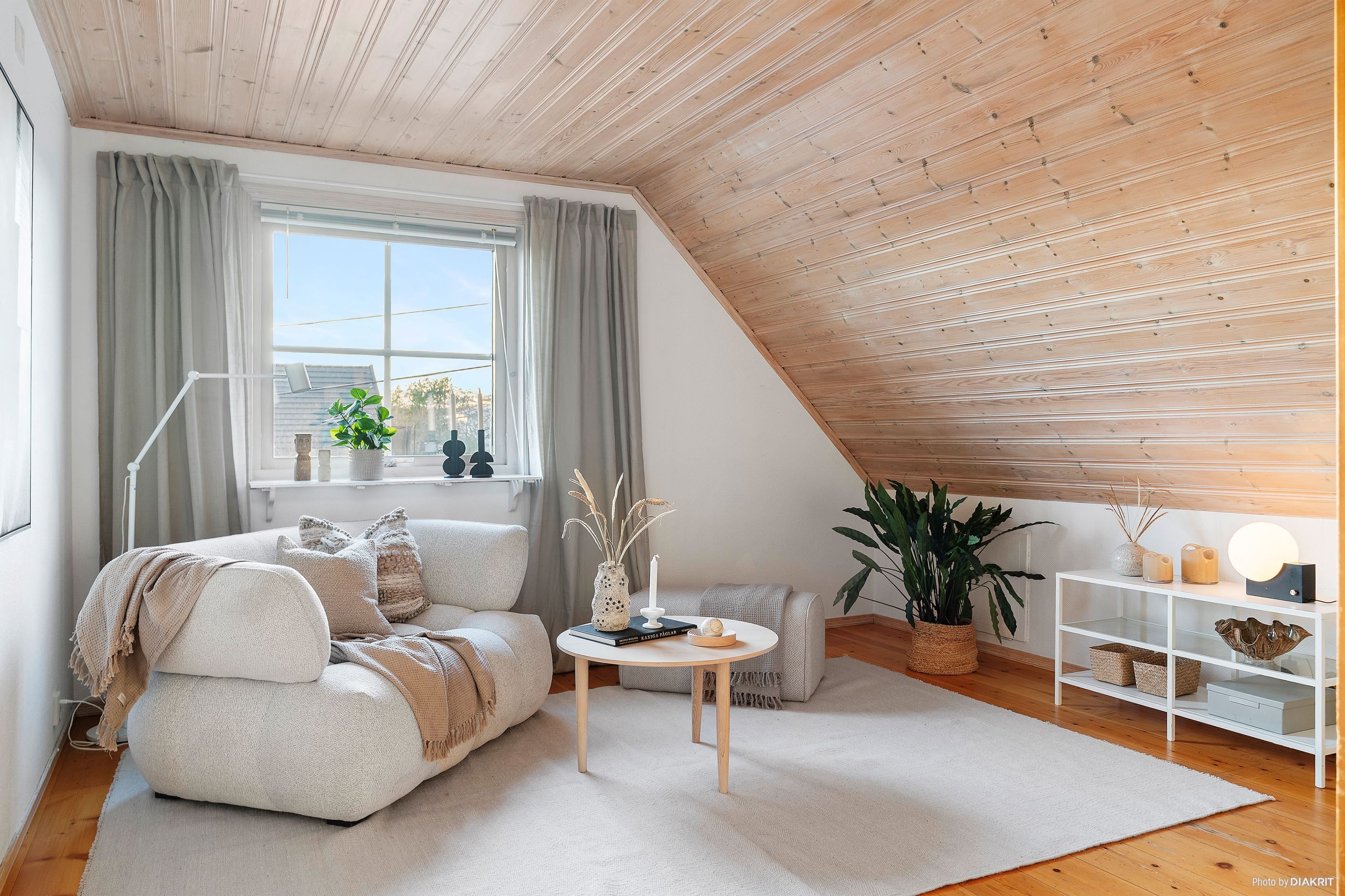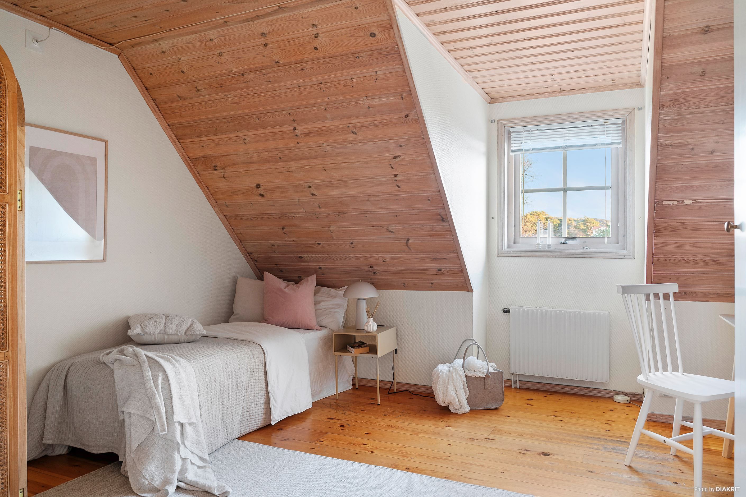 På övre plan har ni sovrumsavdelningen med två bra sovrum, ett allrum som enkelt kan bli ett stort sovrum till, samt ytterligare ett helkaklat badrum. Inredningsbar vind för ytterligare ett sovrum.