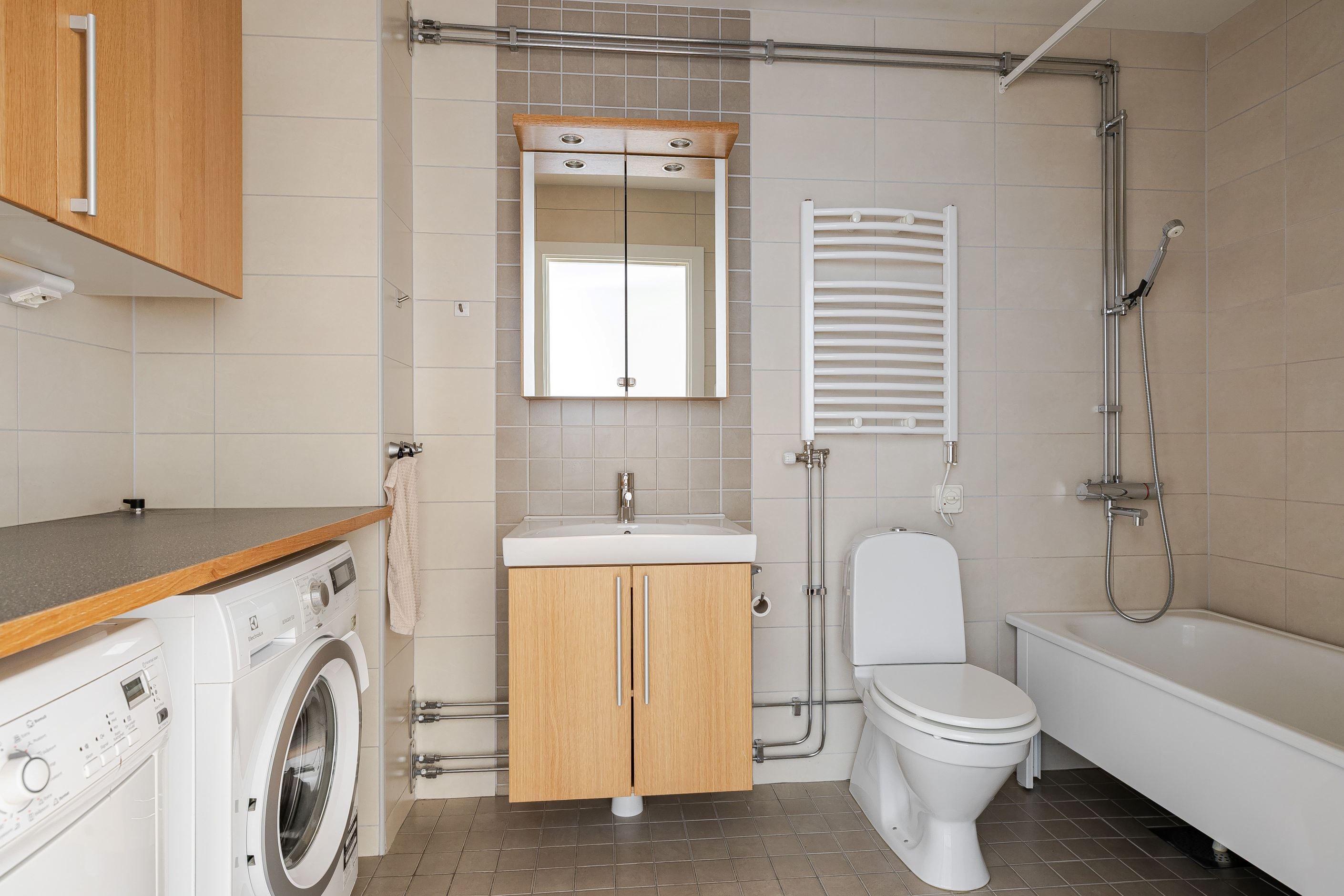 Badrum med kakel och klinker försett med badkar, tvättmaskin, torktumlare, handfat i kommod och spegelskåp. Snyggt och fräscht!