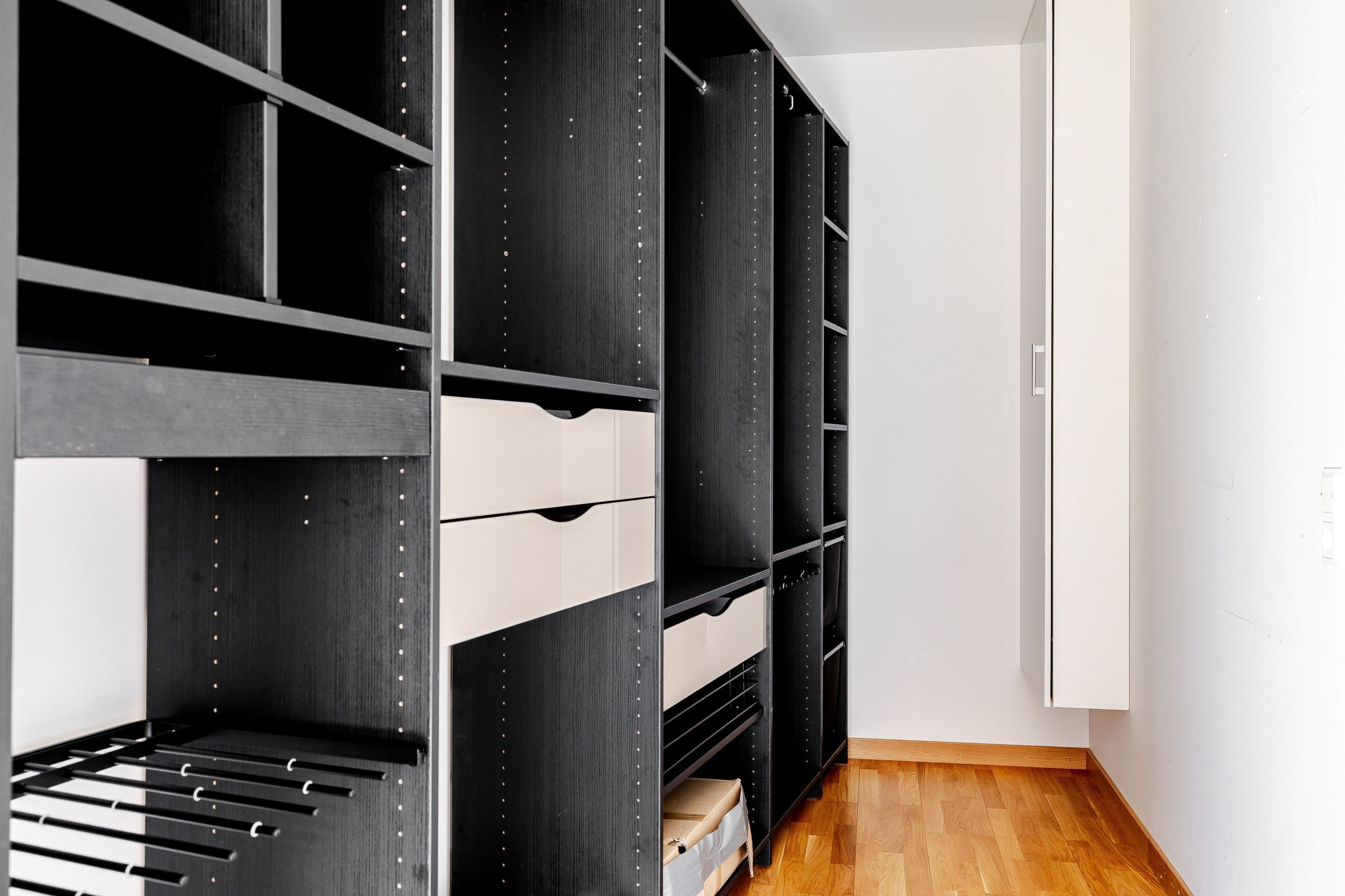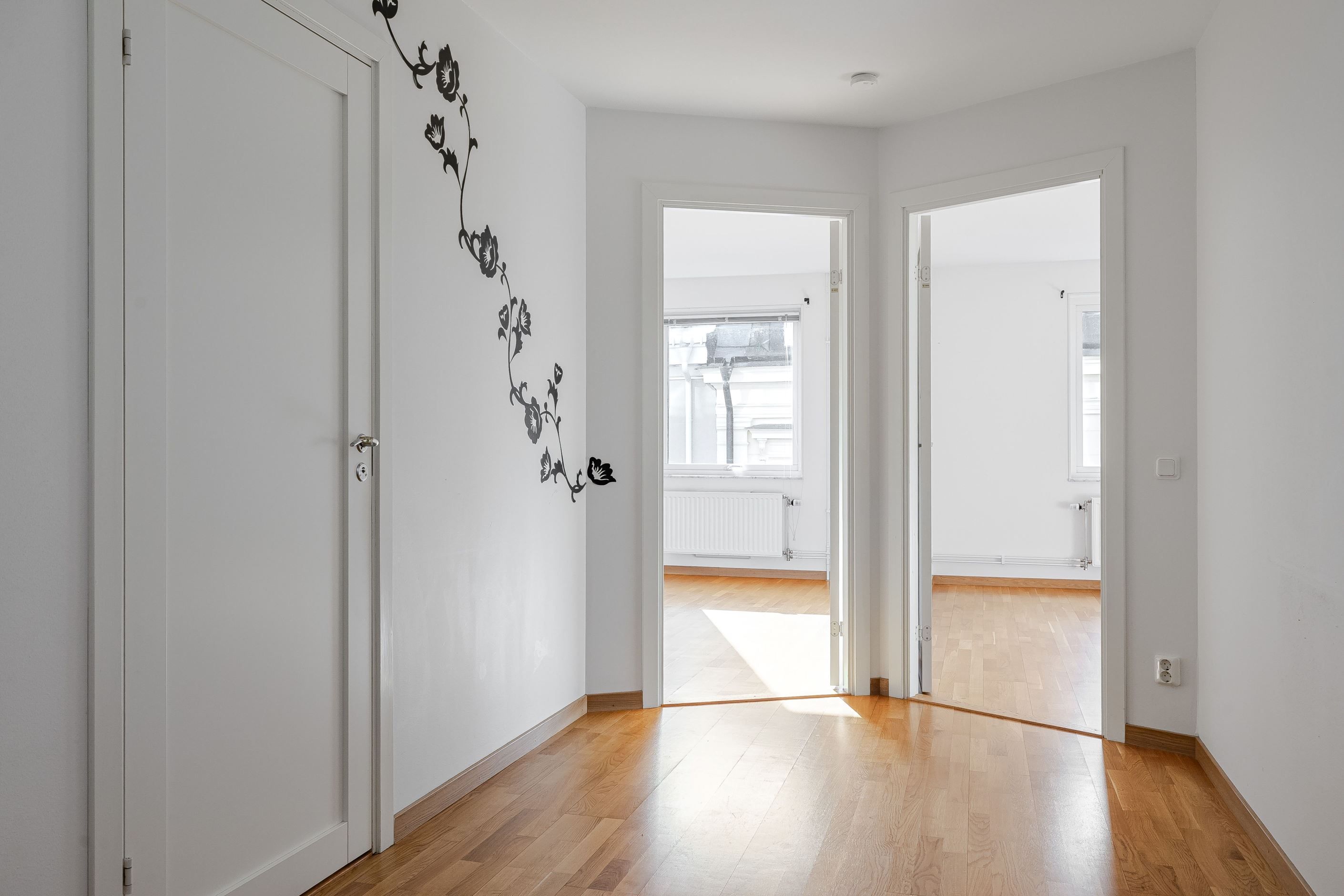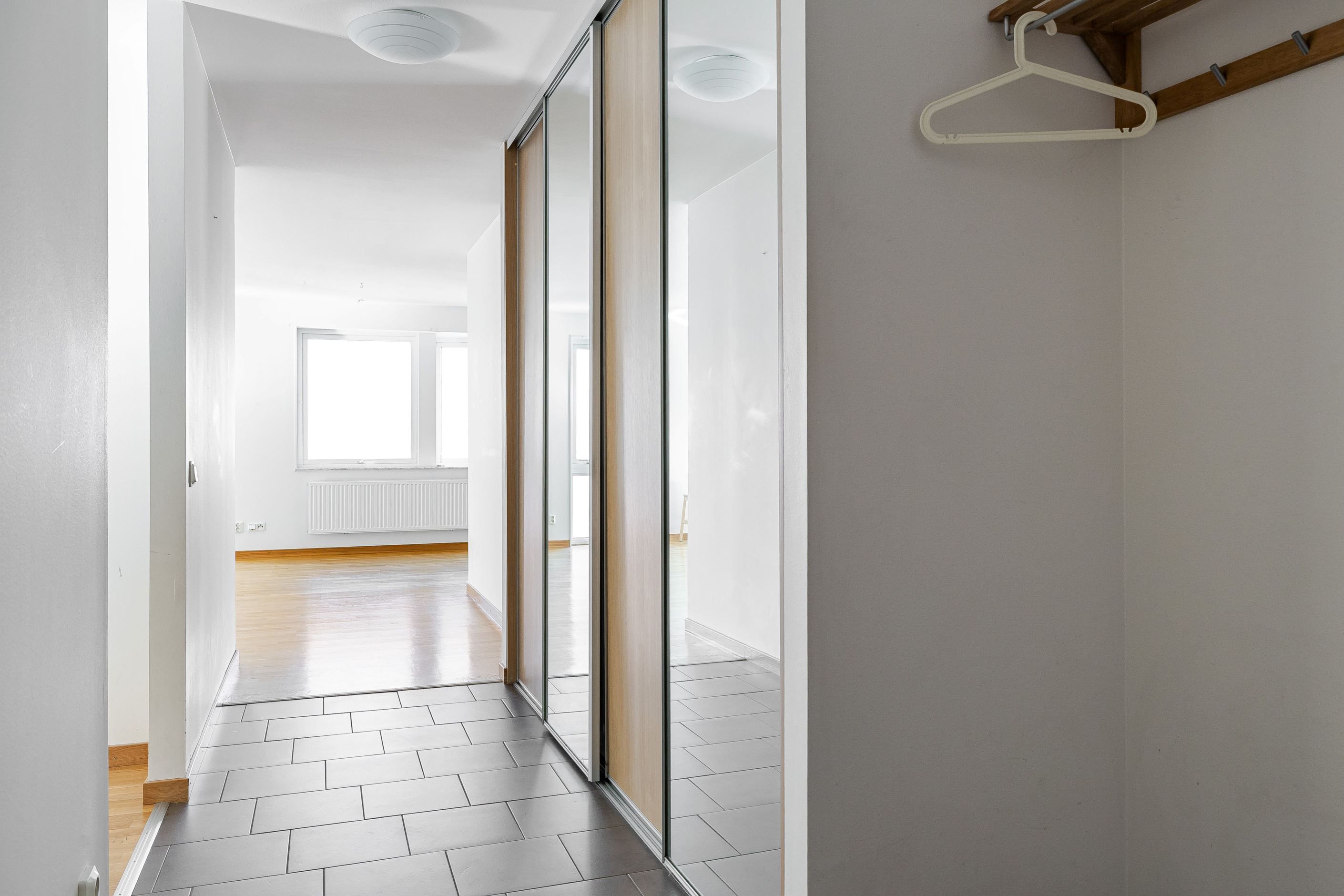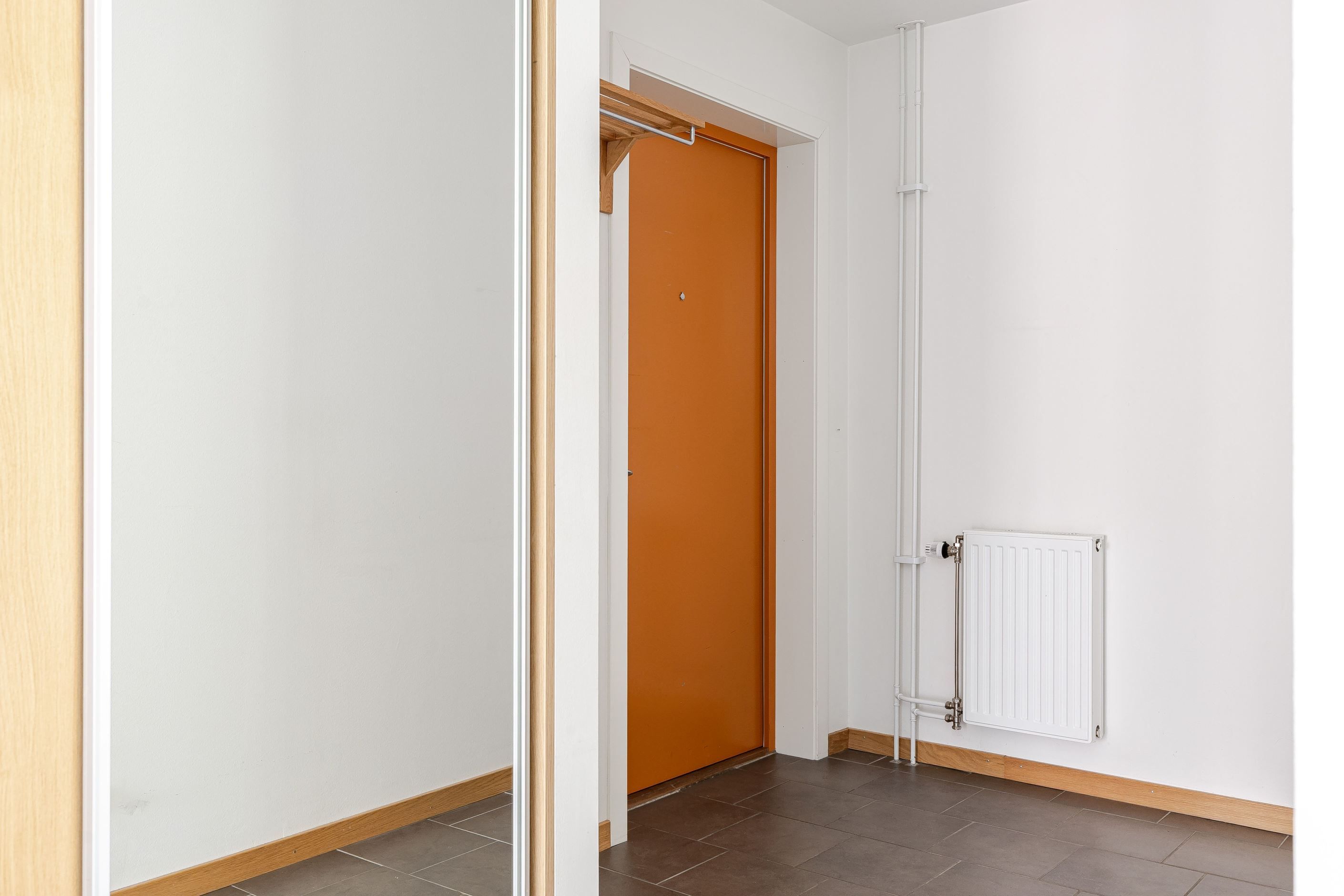 Hall med bra skjutdörrsgarderob med gott om plats. Ingång till inre hall som kan nyttjas som mindre bibliotek eller arbetshörna. Utanför entrédörren har ni lägenhetens förråd, ca 6kvm med värme!
