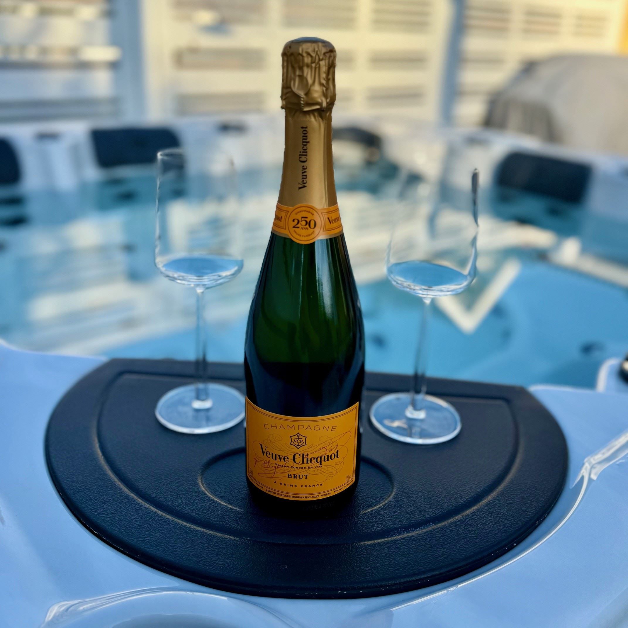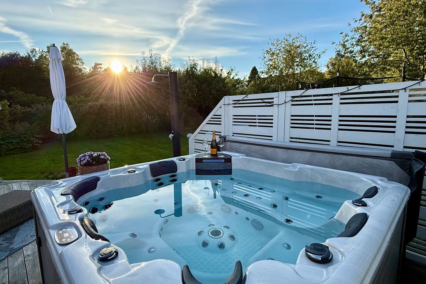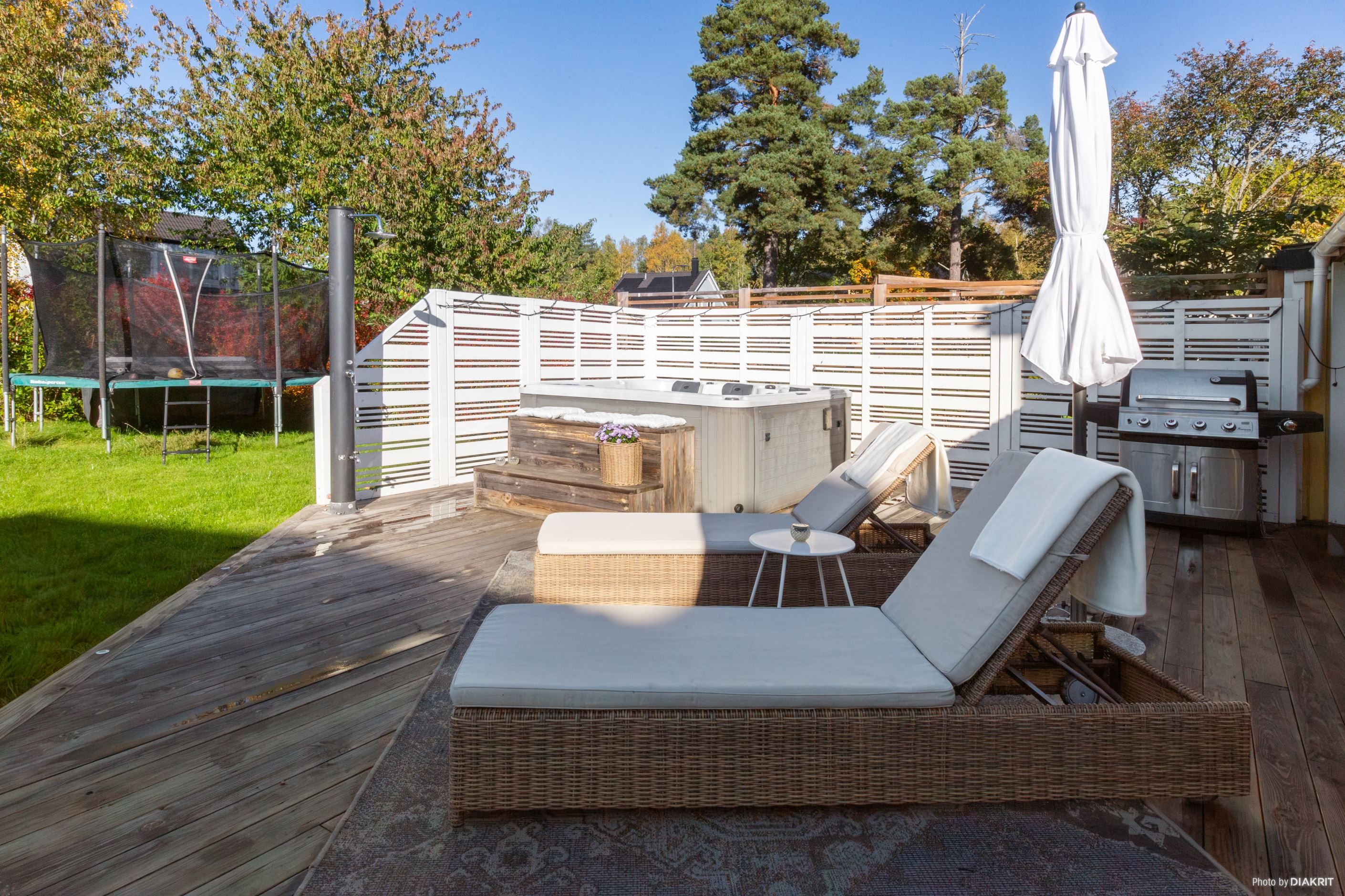 Stor och trädäcksförsedd altan med spabad, i västerläge