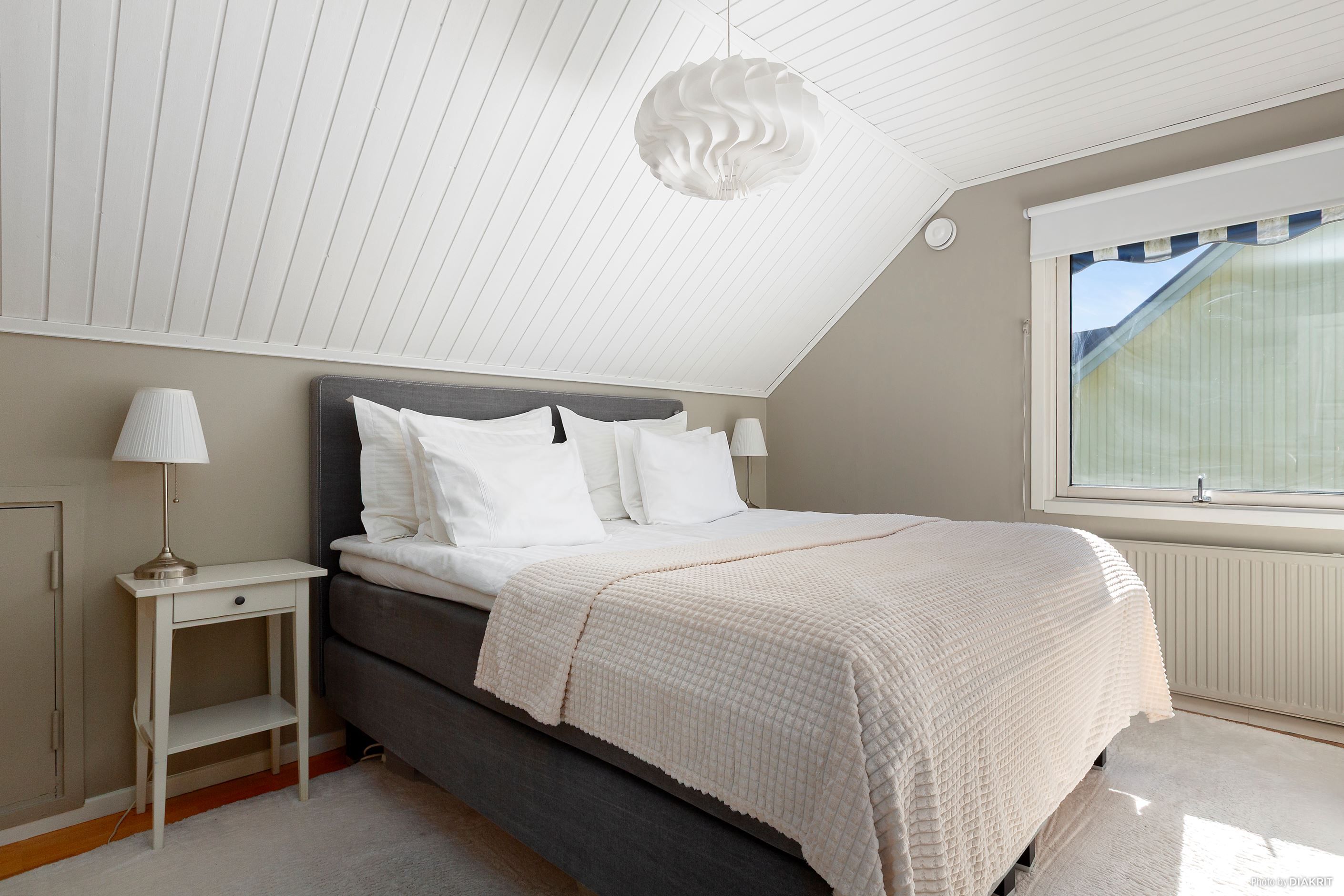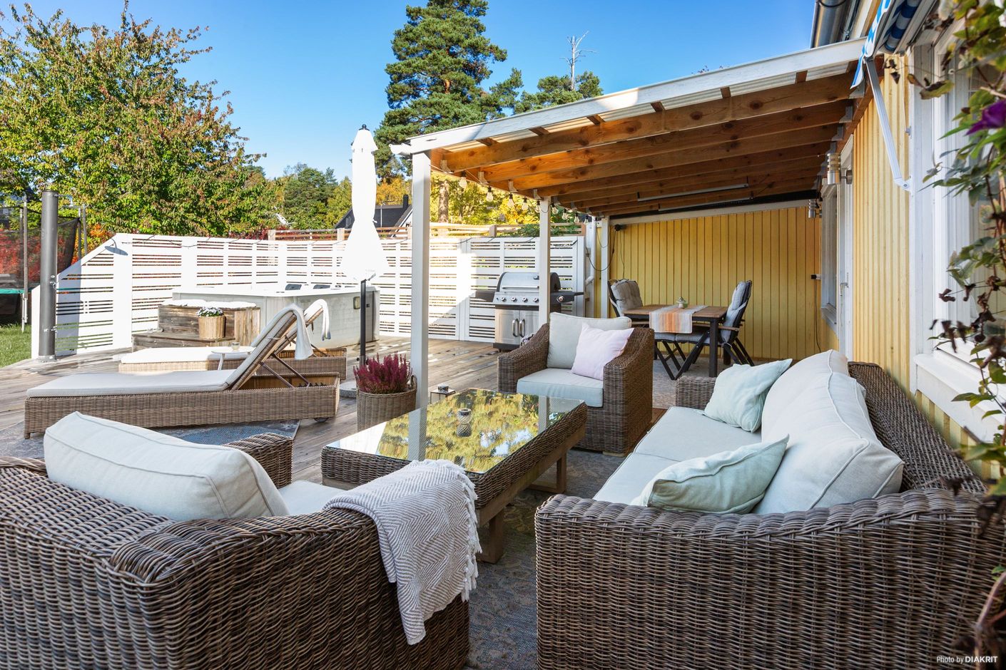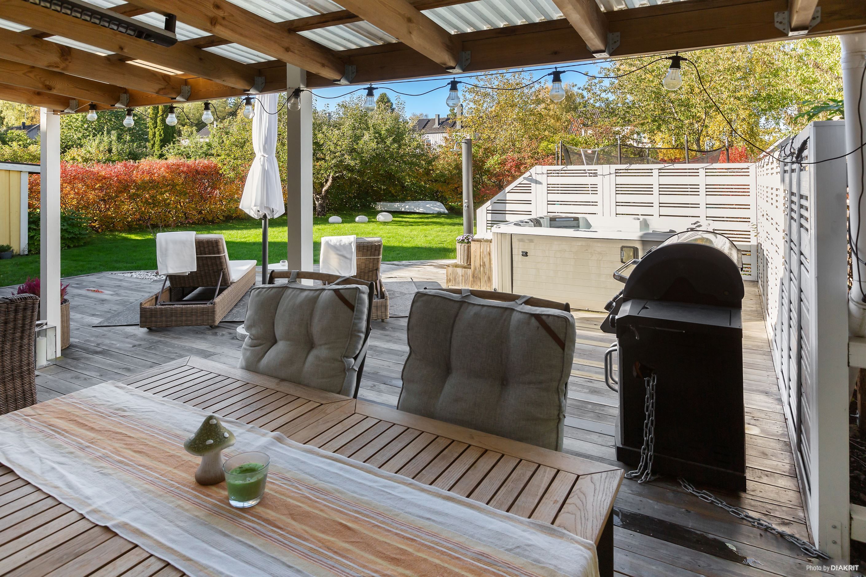 Stor matplats i öppen planlösning. Köksö samt trivsam braskamin. Huset är utbyggt och rymmer 5 sovrum och två helkaklade WC-/duschrum, varav ett med bastu. Om sommaren känns huset ännu större med den stora och träbelagda altanen i härligt västerläge och med spabad och utedusch. Gräsmatta med plats för studsmatta.