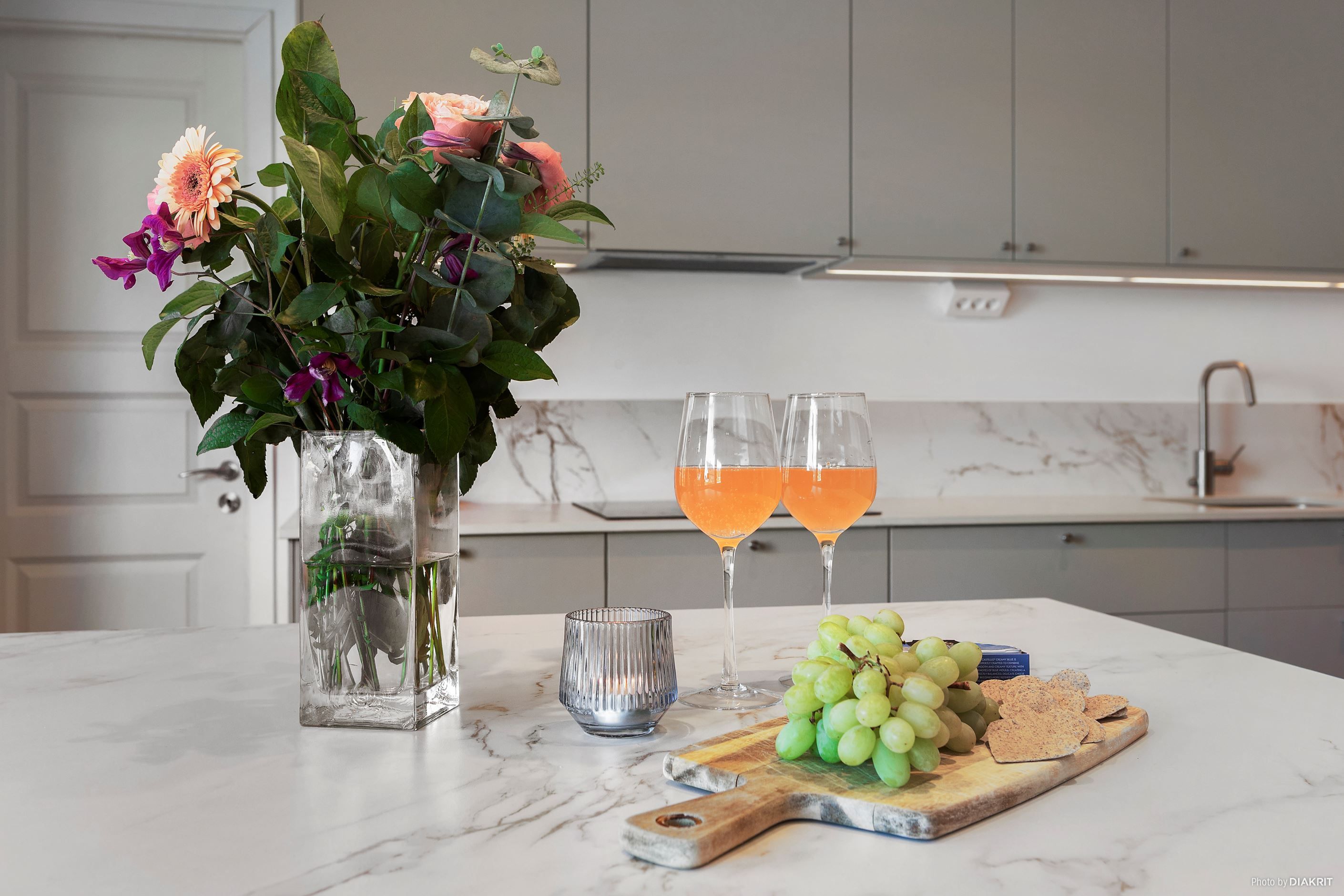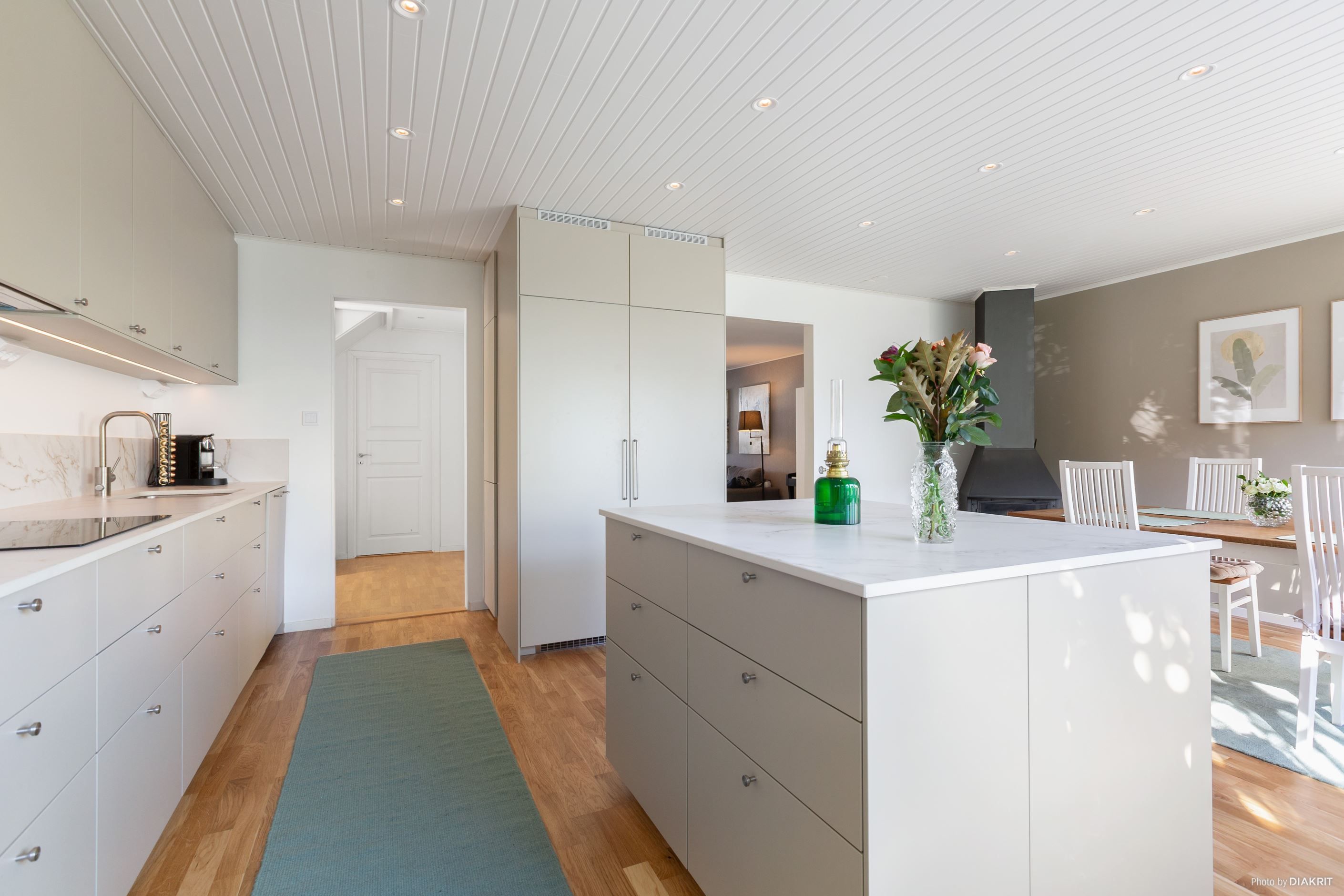 Renoverat och rymligt kök med matplats, med rejäla arbetsytor och köksö