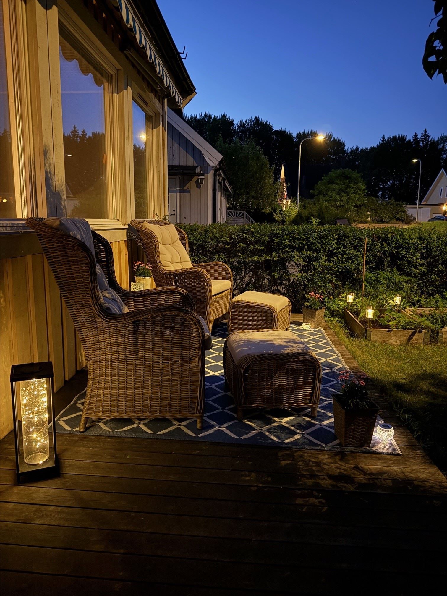 Stor och insynsskyddad altan/uteplats i väster, med plats för matgrupp och loungegrupp
