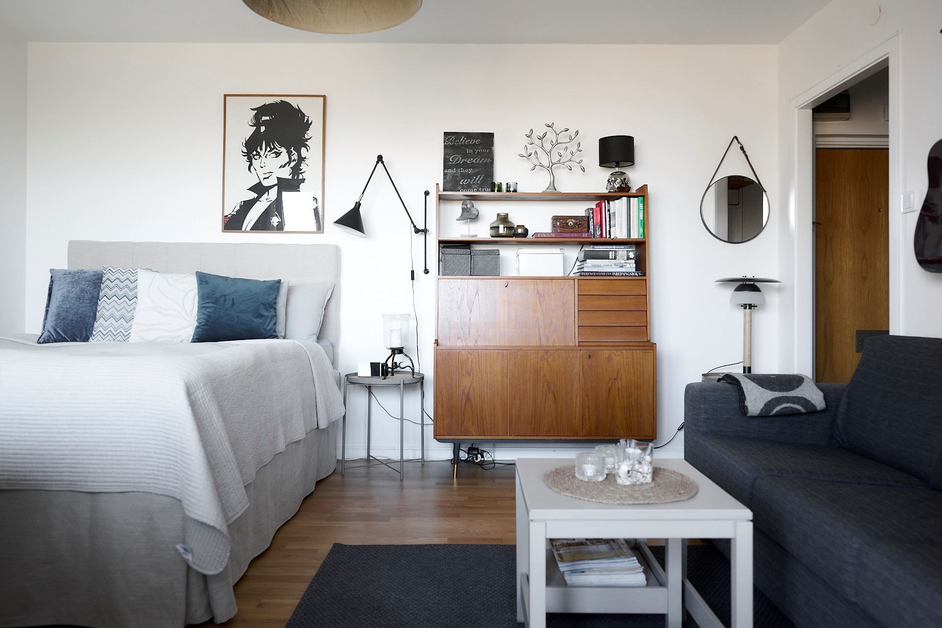 Allrum med plats för säng, matbord och soffdel samtidigt som de finns ett välutrustat kök. Stor inglasad balkong i västerläge.