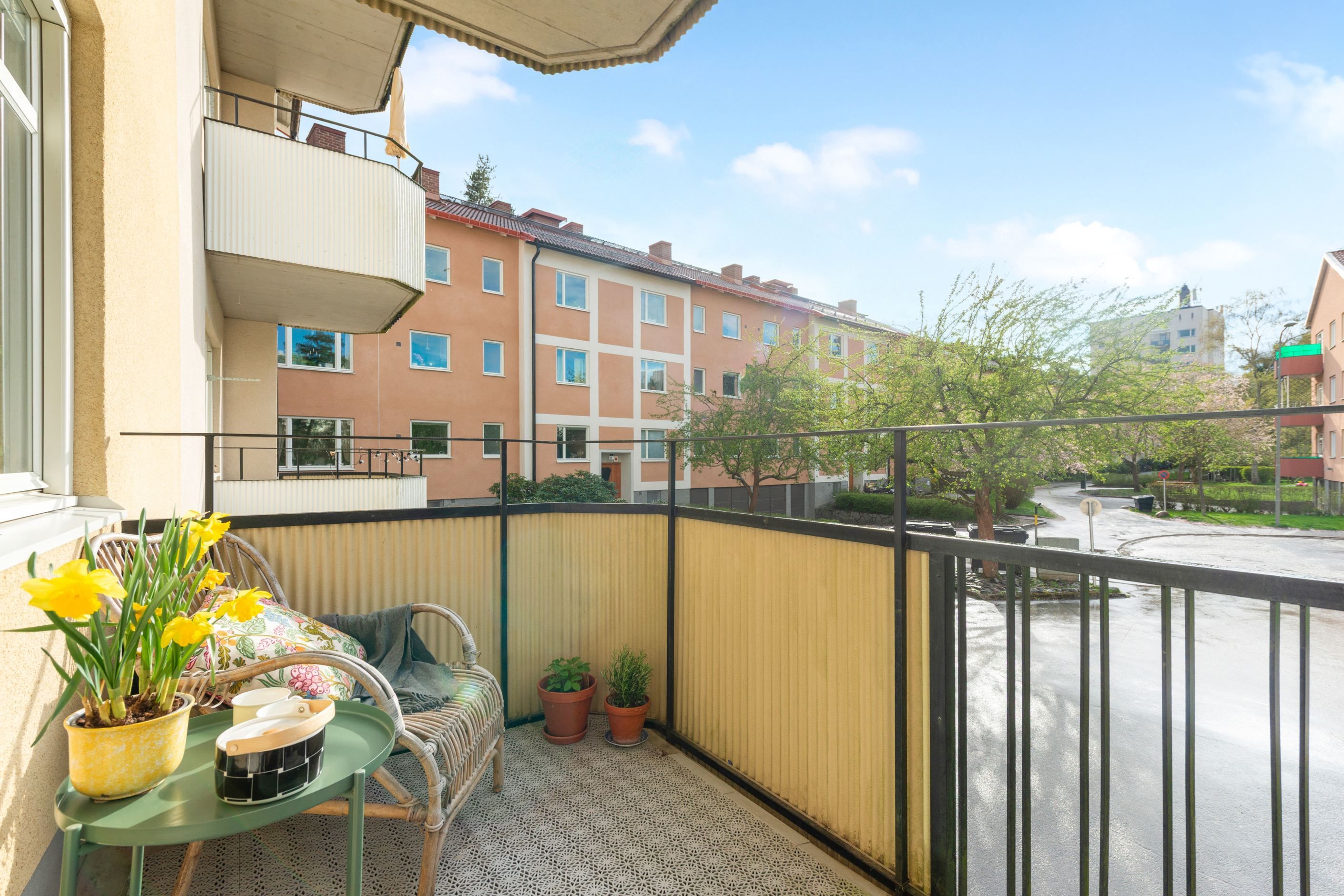 Inbäddad i grönskan endast fem-sju minuters promenad från Bagarmossens centrum ligger denna trivsamma 3:a om 74kvm - helt fritt från insyn intill Kolbäcksgränds familjära innergård med stora grönytor och lekplats intill.