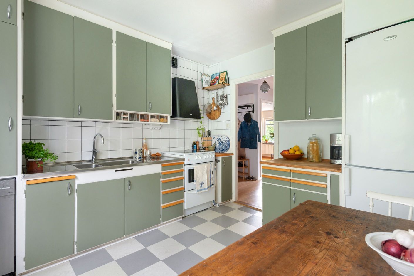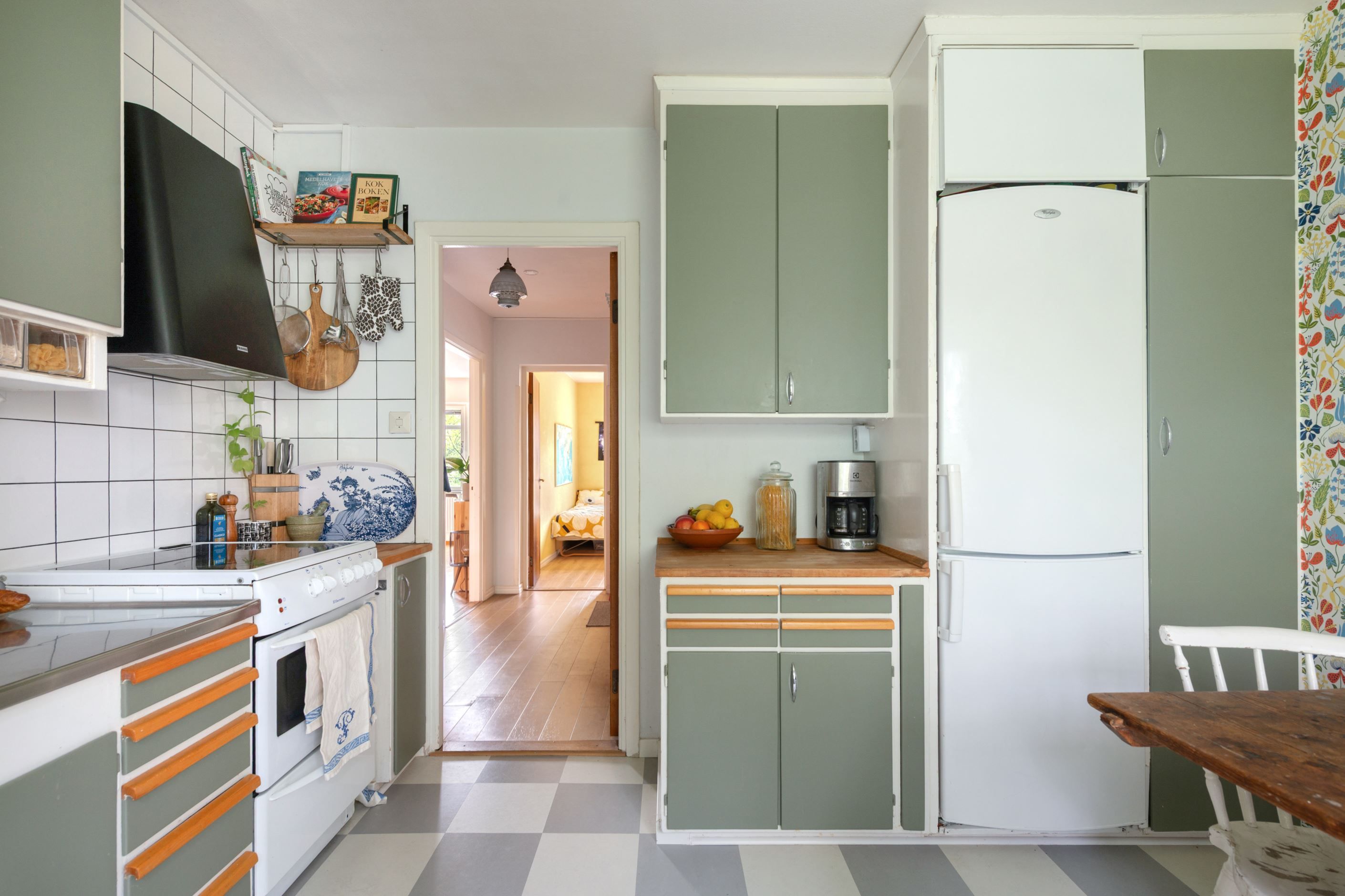 Originalköket med bl.a. bevarat kallskafferi och redahylla har varsamt moderniserats med nyare vitvaror inklusive diskmaskin och spisfläkt. Köksluckorna är givetvis i original och målade i en jordnära nyans. Utsikten från köket vetter mot grönskan och radhusen på Gimågatan, ett ytterst lugnt och grönskande läge där rådjur ofta tar sin dagsvila.