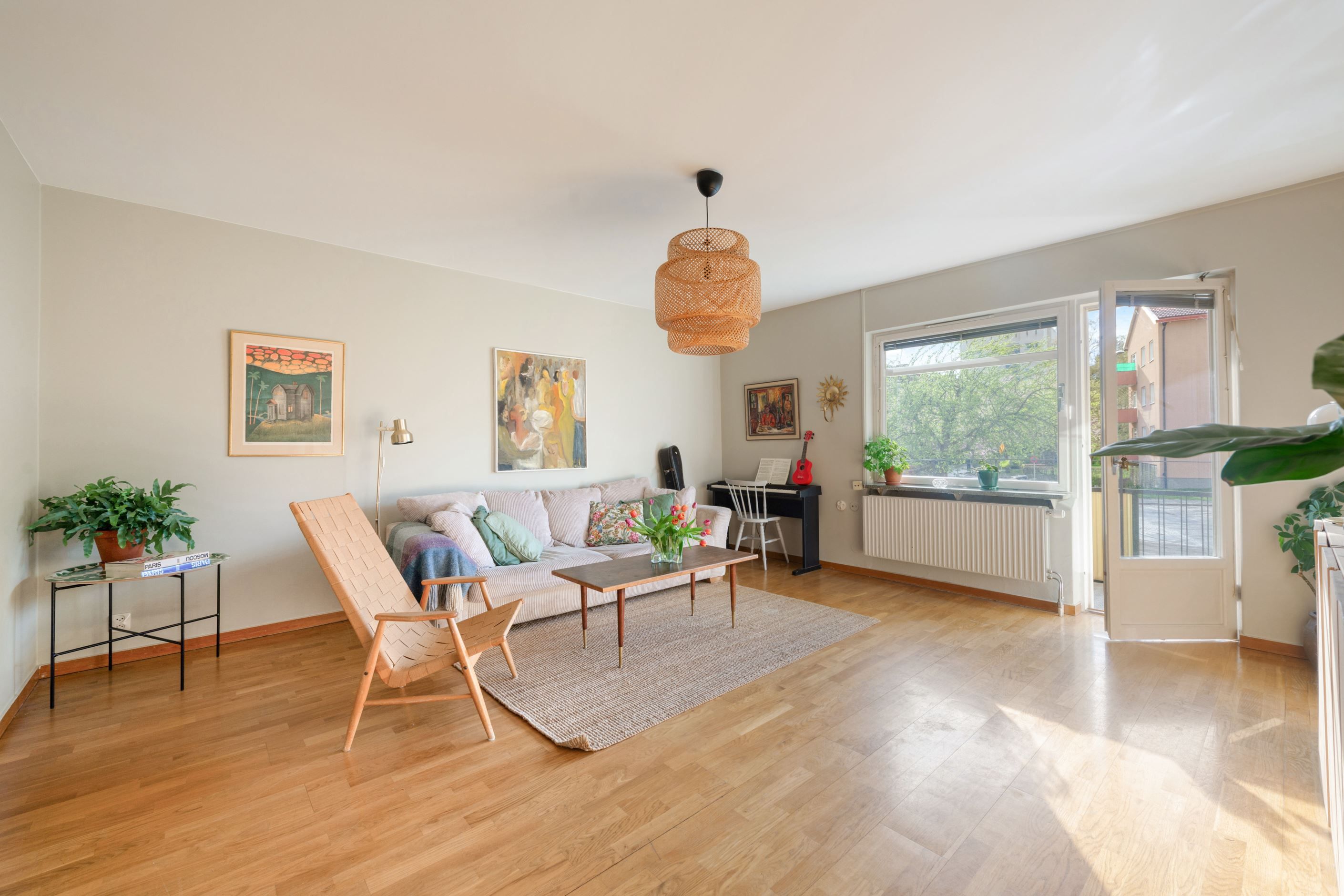 Det lättmöblerade vardagsrummet nås från både hall och ett av sovrummen. Här ryms både en större soffgrupp, TV-möbler, bokhyllor och t.ex. en skrivbordshörna för den som behöver. Den rymliga balkongen med sol från sen lunch till sen kväll nås härigenom - lugnt läge mot blomster och grönska.