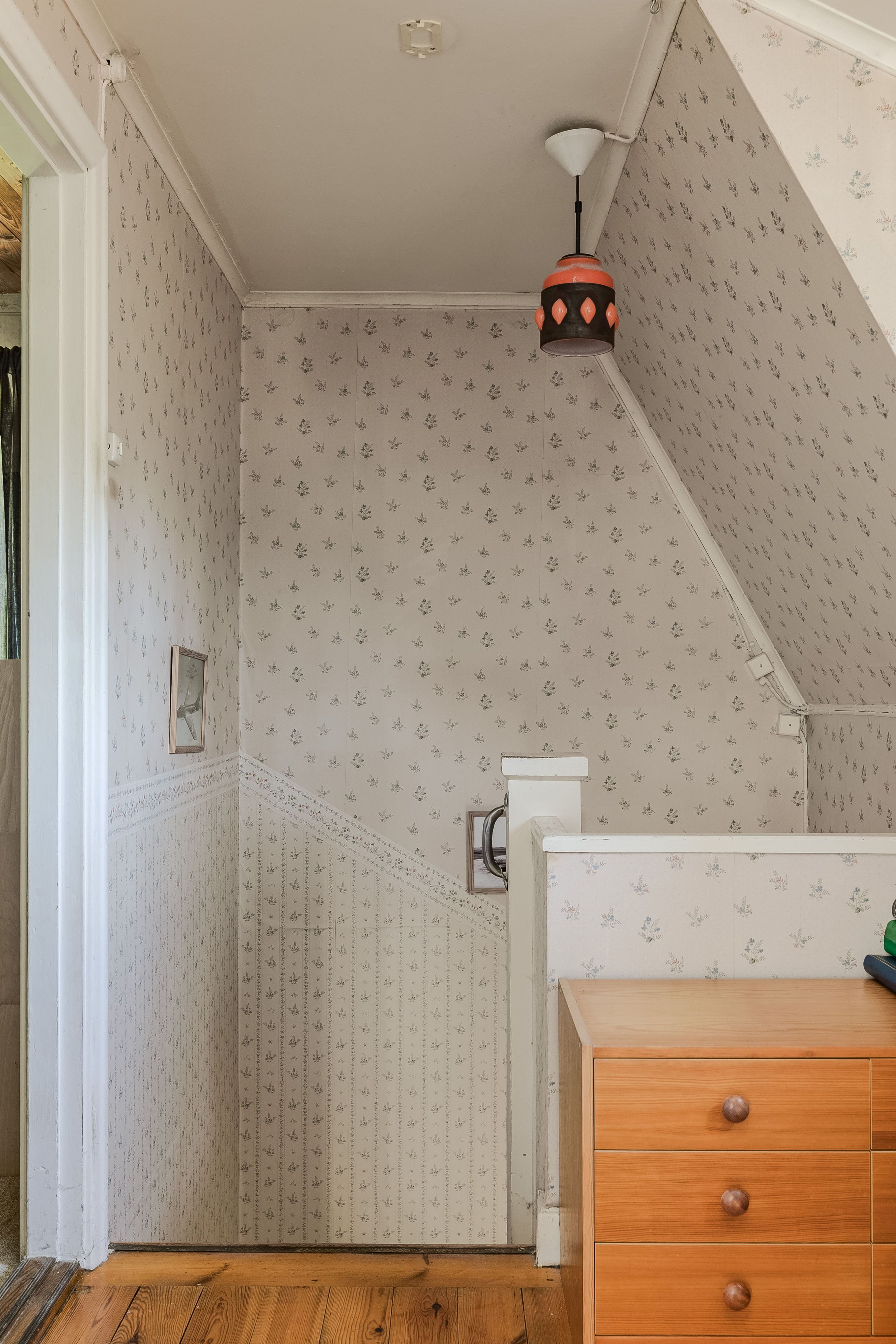 Huvudbyggnaden är en charmig röd trävilla från 1930-talet om 68 kvm, med två sovrum, ett allrum, entréhall och en mysig kakelugn som värmer skönt under kalla dagar. Från huset har du även tillgång till en balkong – en perfekt plats att njuta av morgonkaffet med utsikt över den omgivande naturen. Övre plan med två möjliga sovrum, äldre badrum.