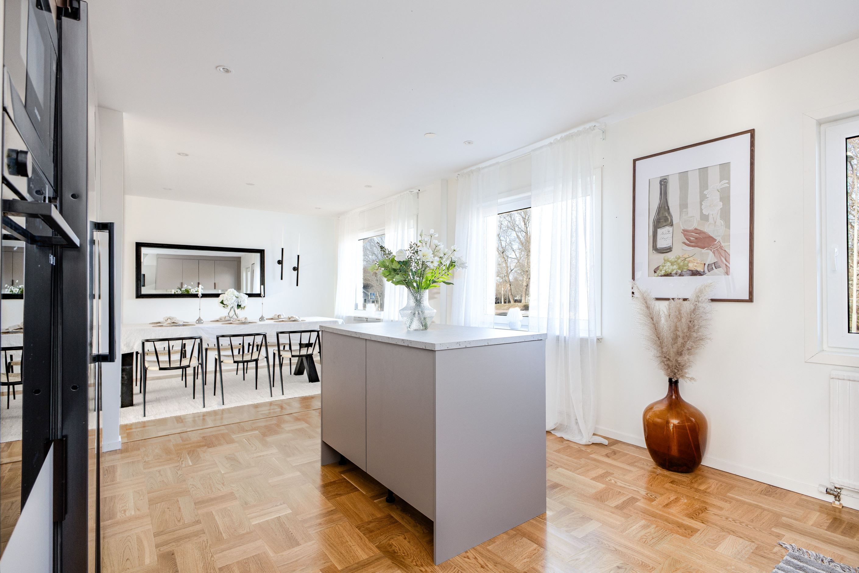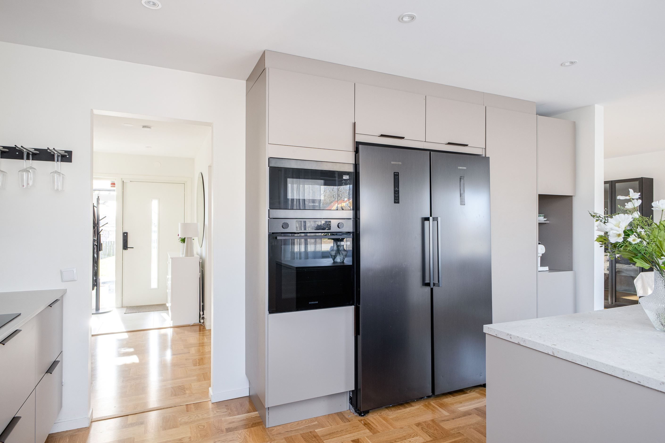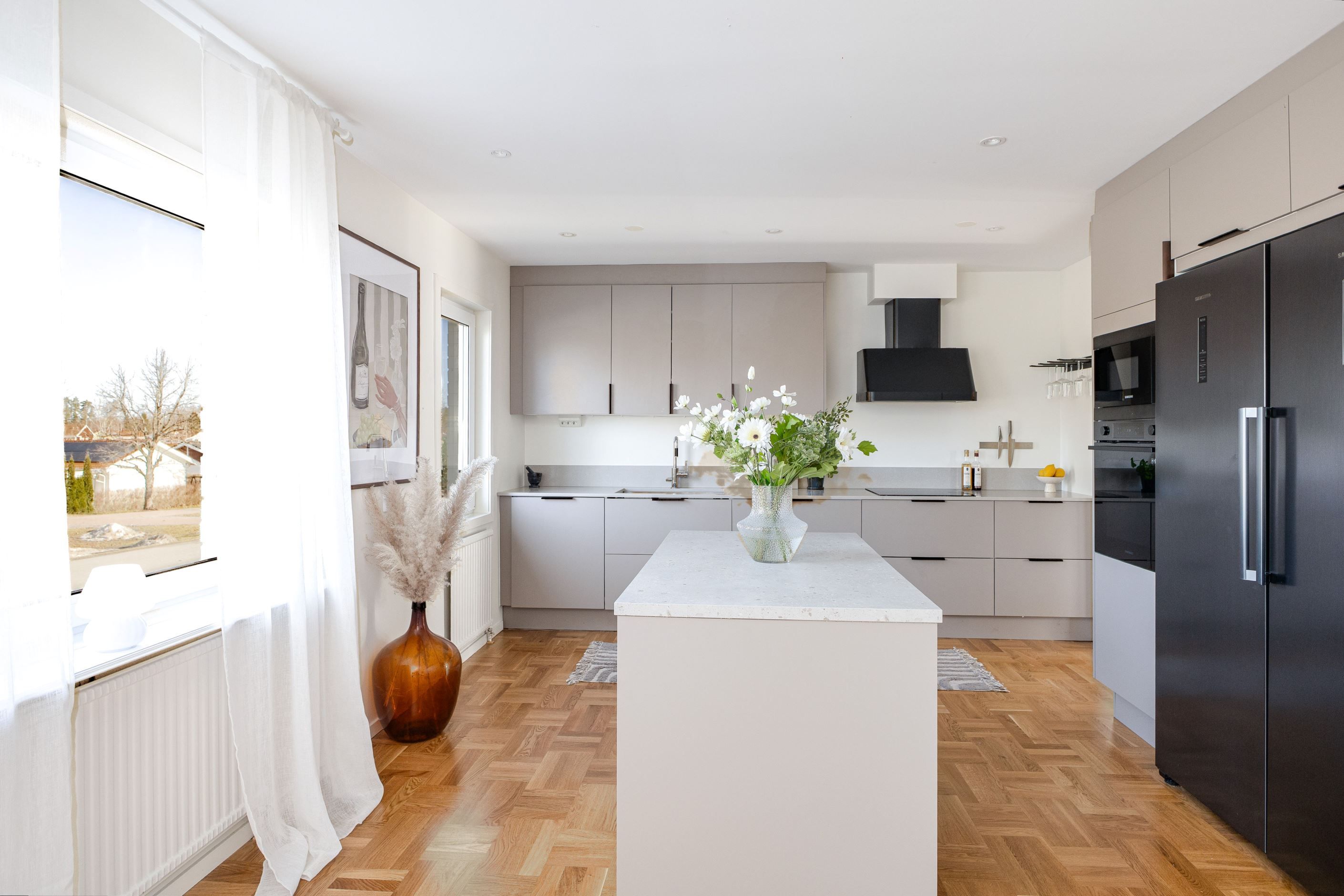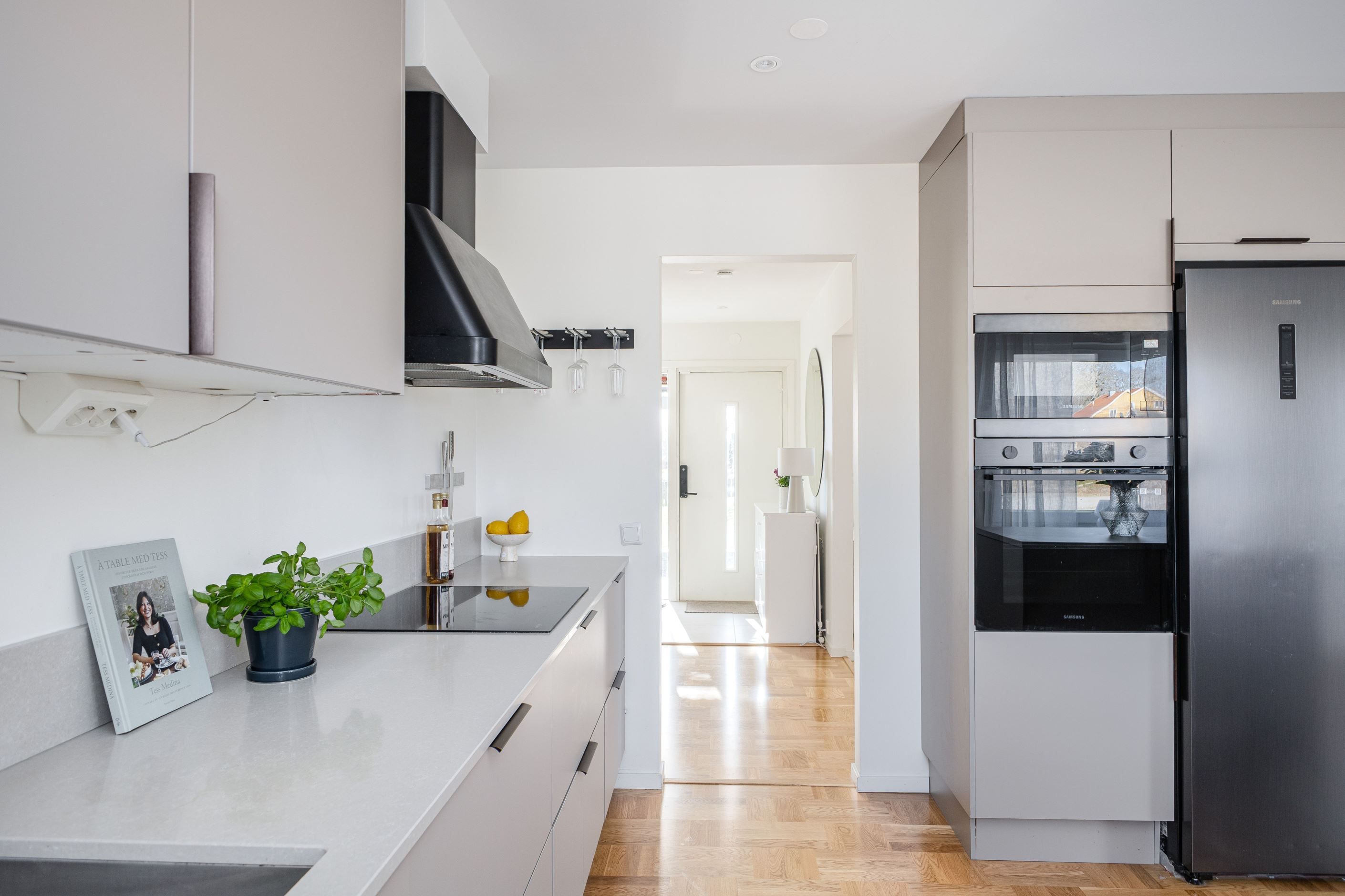 Det nyinstallerade HTH-köket, utrustat med högkvalitativa vitvaror från Samsung, blir hjärtat i hemmet. Här har köket dessutom kompletterats med en tillbyggd köksö som skapar generösa arbetsytor och en naturlig samlingspunkt, samt en stilfull kaffehörna i egen nisch – perfekt för morgonkaffet eller en lugn stund under dagen. Två nyrenoverade badrum, helt klädda i kakel och med golvvärme, ger en lyxig känsla och kompletteras av en renoverad gäst-WC. Samtliga ytskikt i huset är uppdaterade, och golven på entréplanet pryds av en elegant ekparkett i holländsk läggning som skapar en varm och inbjudande atmosfär.