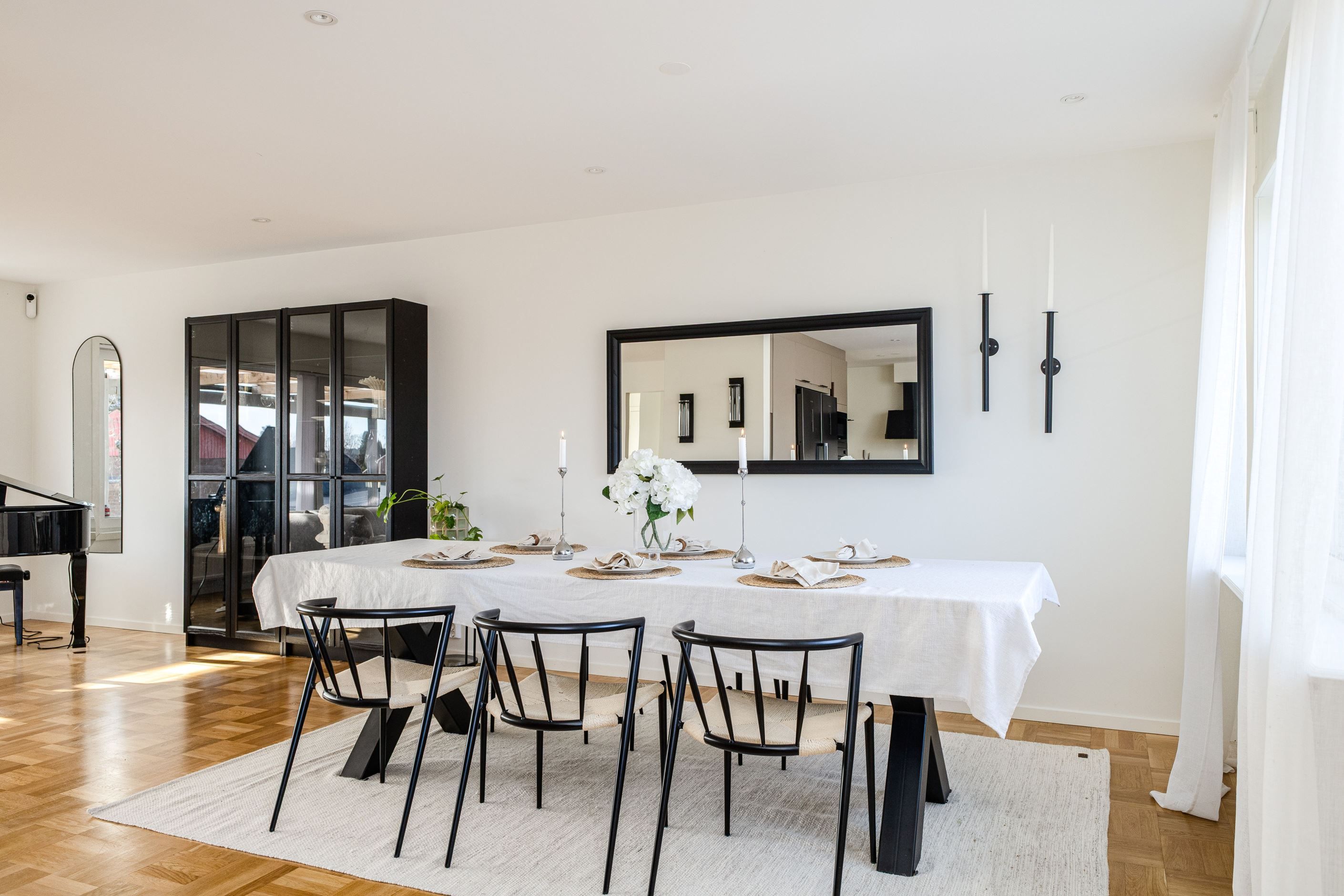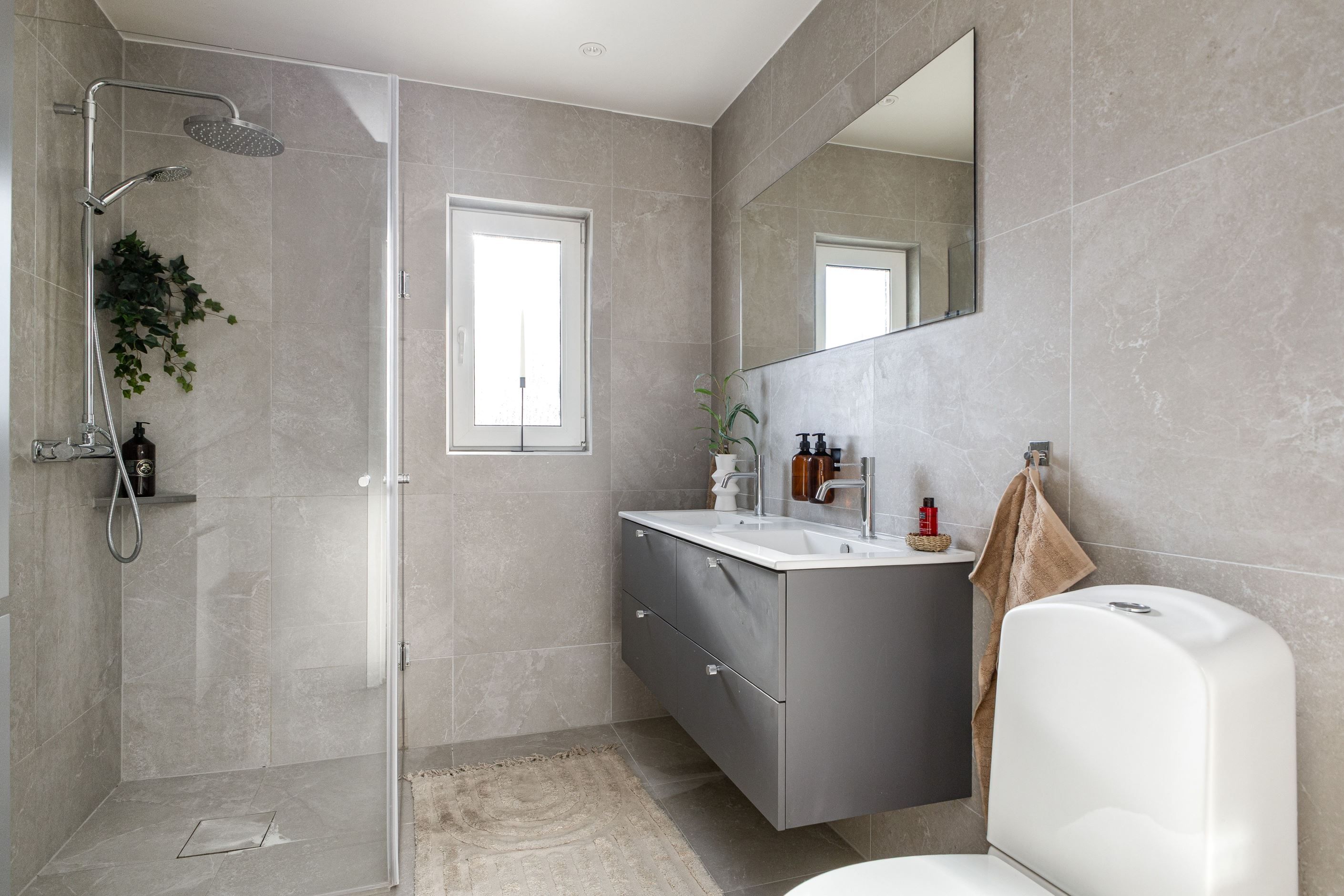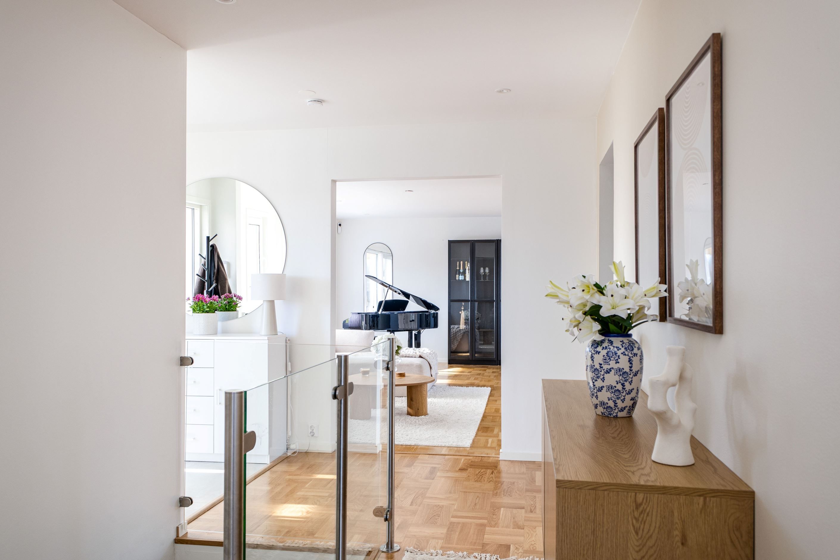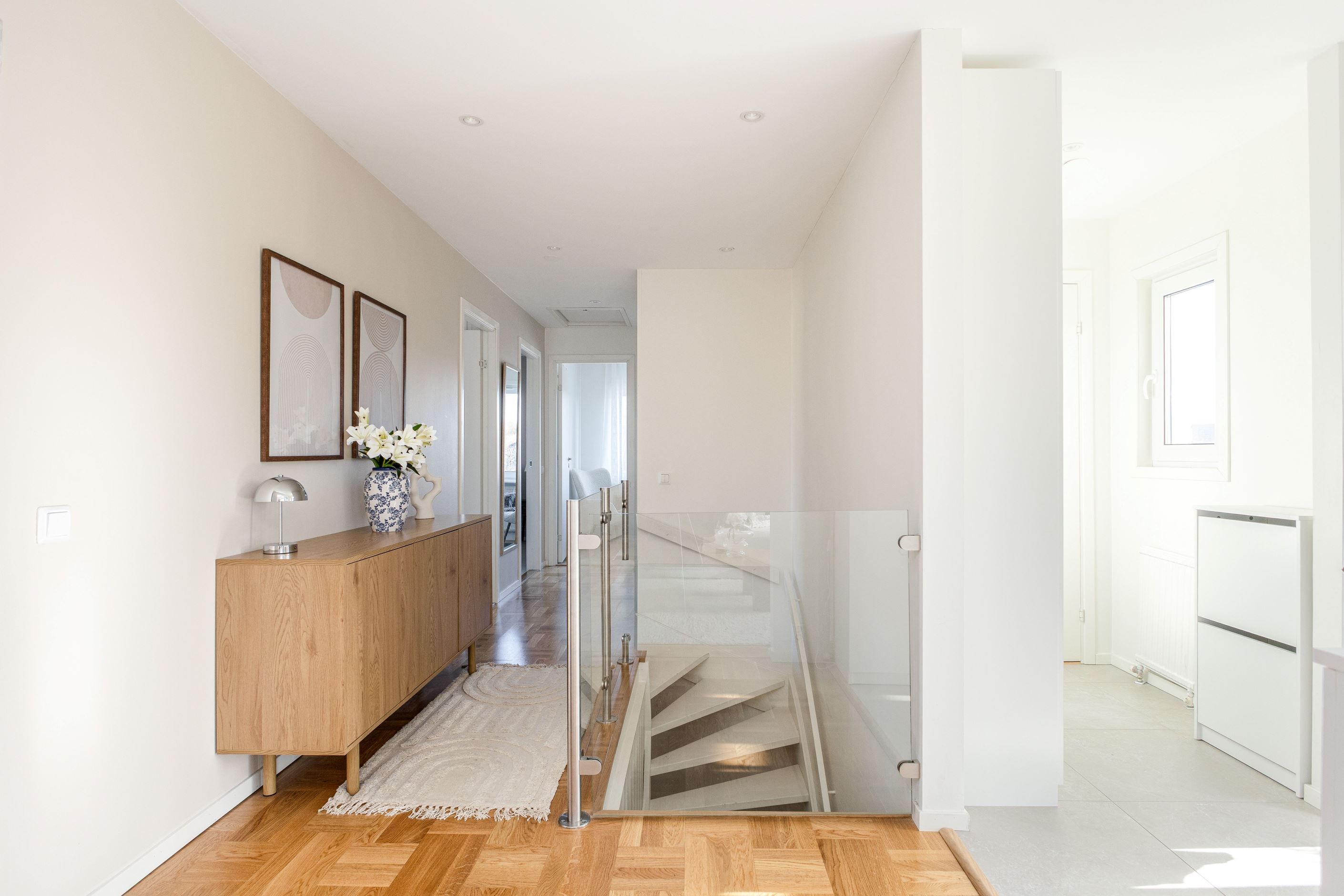 Det nyinstallerade HTH-köket, utrustat med högkvalitativa vitvaror från Samsung, blir hjärtat i hemmet. Här har köket dessutom kompletterats med en tillbyggd köksö som skapar generösa arbetsytor och en naturlig samlingspunkt, samt en stilfull kaffehörna i egen nisch – perfekt för morgonkaffet eller en lugn stund under dagen. Två nyrenoverade badrum, helt klädda i kakel och med golvvärme, ger en lyxig känsla och kompletteras av en renoverad gäst-WC. Samtliga ytskikt i huset är uppdaterade, och golven på entréplanet pryds av en elegant ekparkett i holländsk läggning som skapar en varm och inbjudande atmosfär.