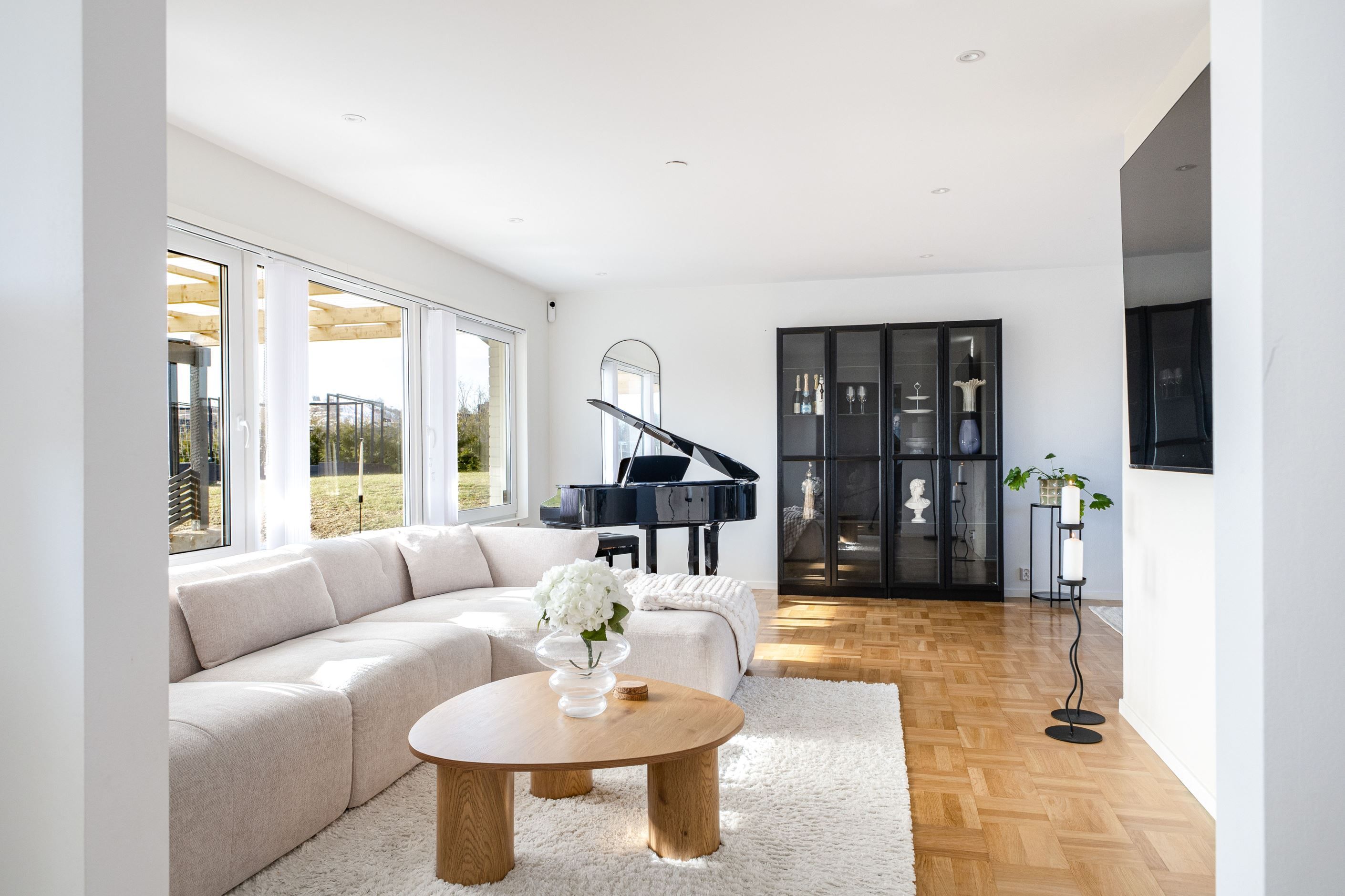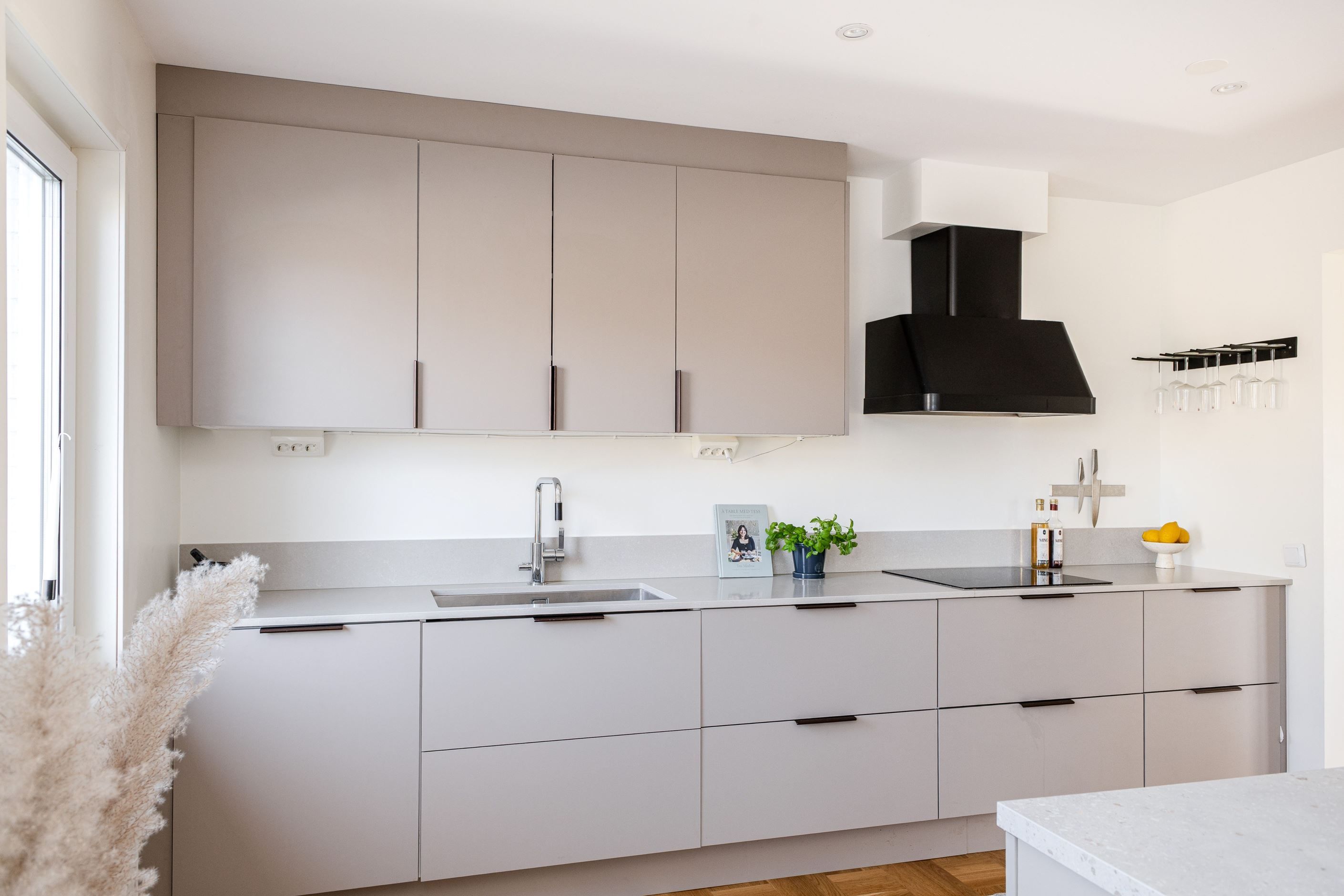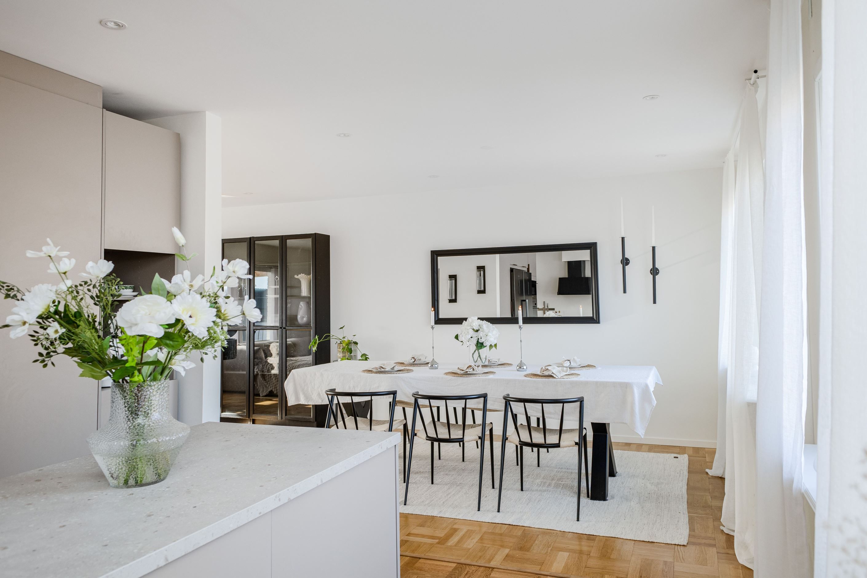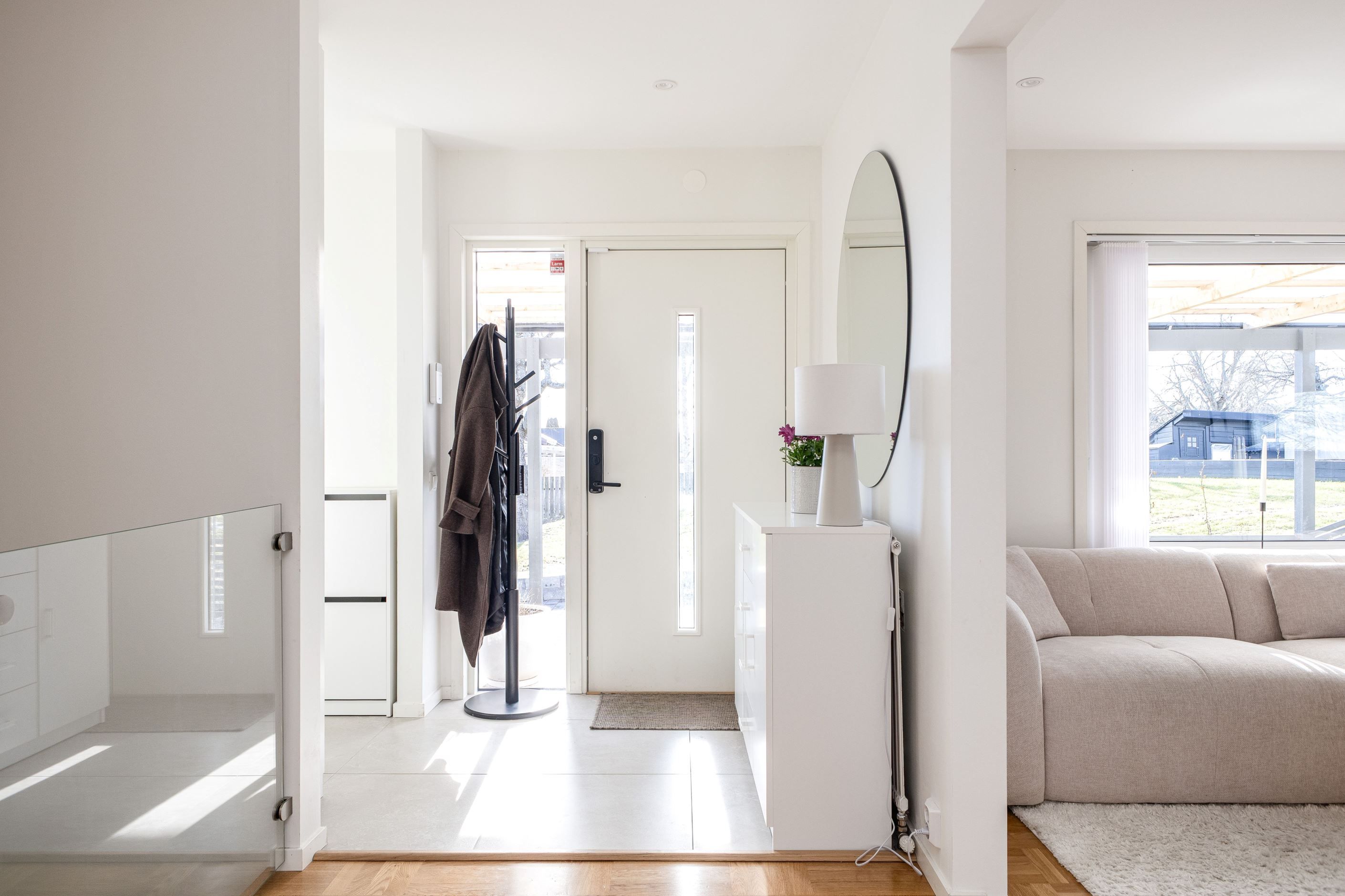Det nyinstallerade HTH-köket, utrustat med högkvalitativa vitvaror från Samsung, blir hjärtat i hemmet. Här har köket dessutom kompletterats med en tillbyggd köksö som skapar generösa arbetsytor och en naturlig samlingspunkt, samt en stilfull kaffehörna i egen nisch – perfekt för morgonkaffet eller en lugn stund under dagen. Två nyrenoverade badrum, helt klädda i kakel och med golvvärme, ger en lyxig känsla och kompletteras av en renoverad gäst-WC. Samtliga ytskikt i huset är uppdaterade, och golven på entréplanet pryds av en elegant ekparkett i holländsk läggning som skapar en varm och inbjudande atmosfär.