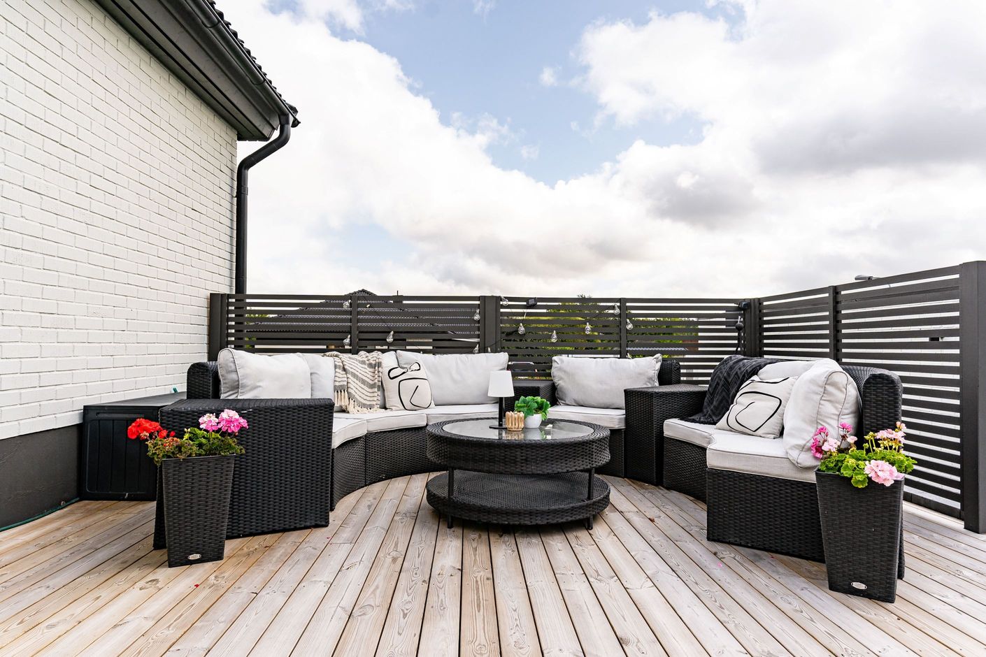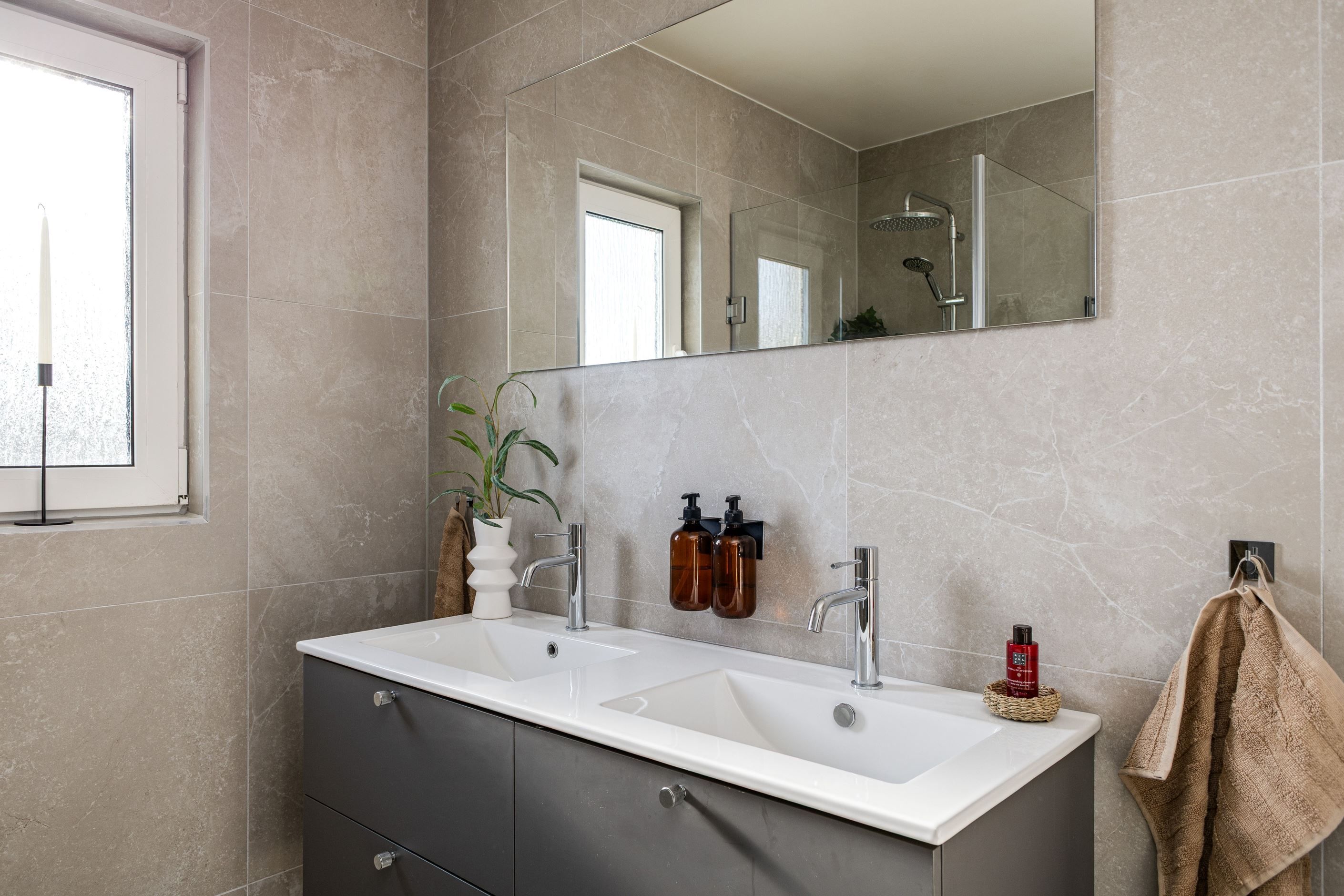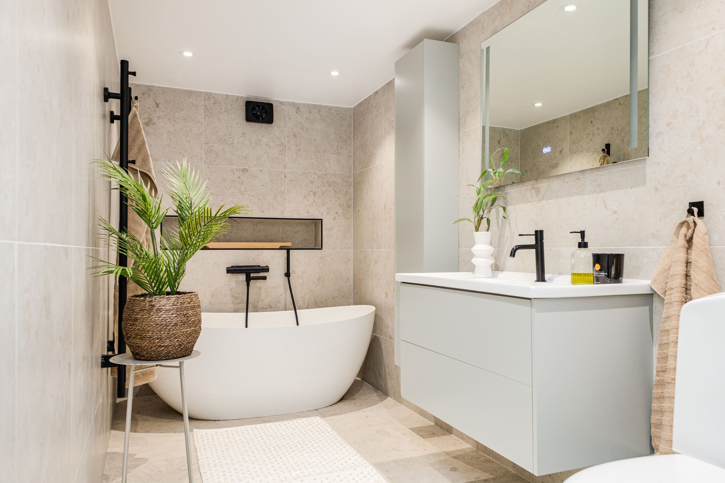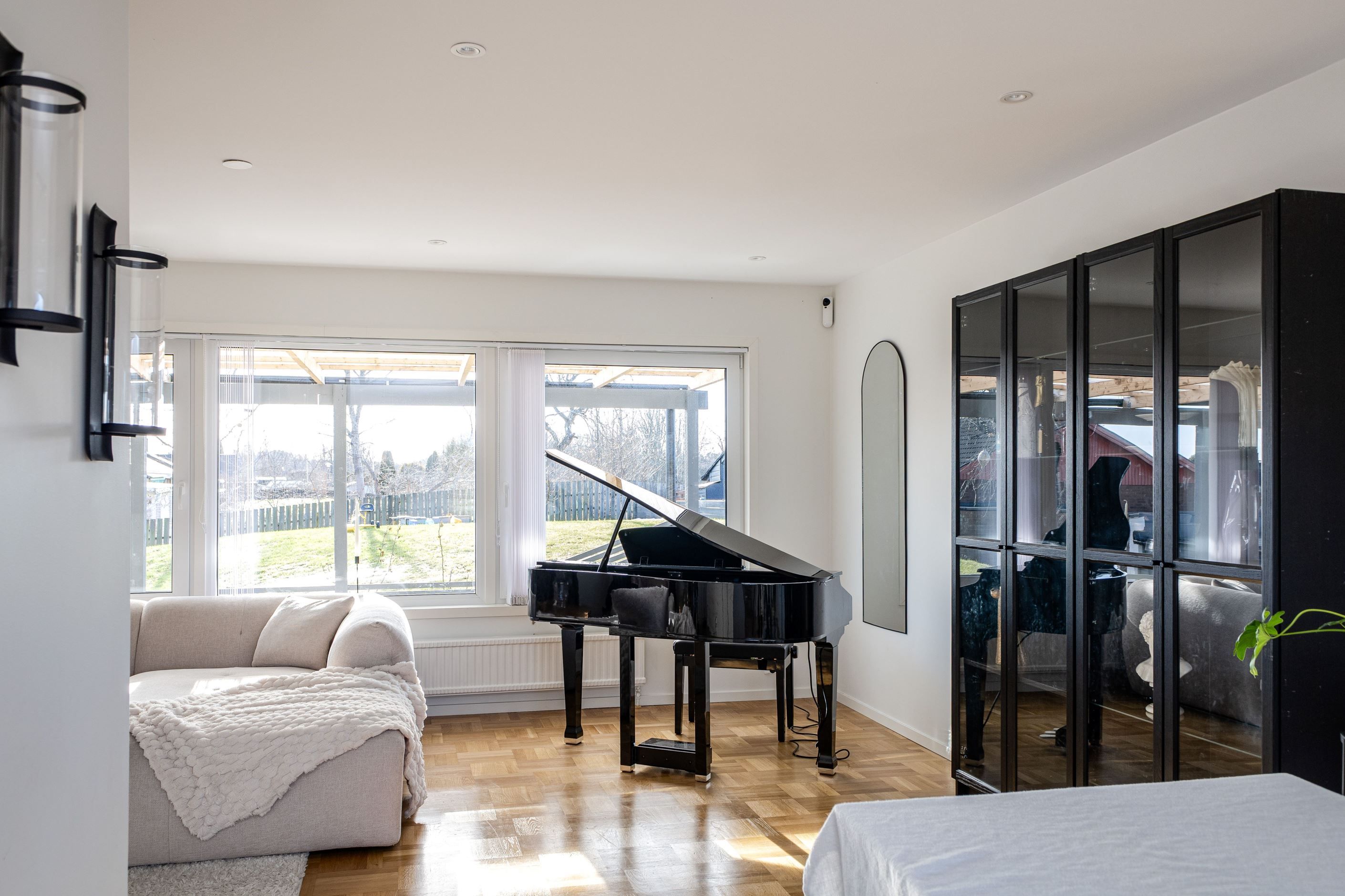 Det nyinstallerade HTH-köket, utrustat med högkvalitativa vitvaror från Samsung, blir hjärtat i hemmet. Här har köket dessutom kompletterats med en tillbyggd köksö som skapar generösa arbetsytor och en naturlig samlingspunkt, samt en stilfull kaffehörna i egen nisch – perfekt för morgonkaffet eller en lugn stund under dagen. Två nyrenoverade badrum, helt klädda i kakel och med golvvärme, ger en lyxig känsla och kompletteras av en renoverad gäst-WC. Samtliga ytskikt i huset är uppdaterade, och golven på entréplanet pryds av en elegant ekparkett i holländsk läggning som skapar en varm och inbjudande atmosfär.