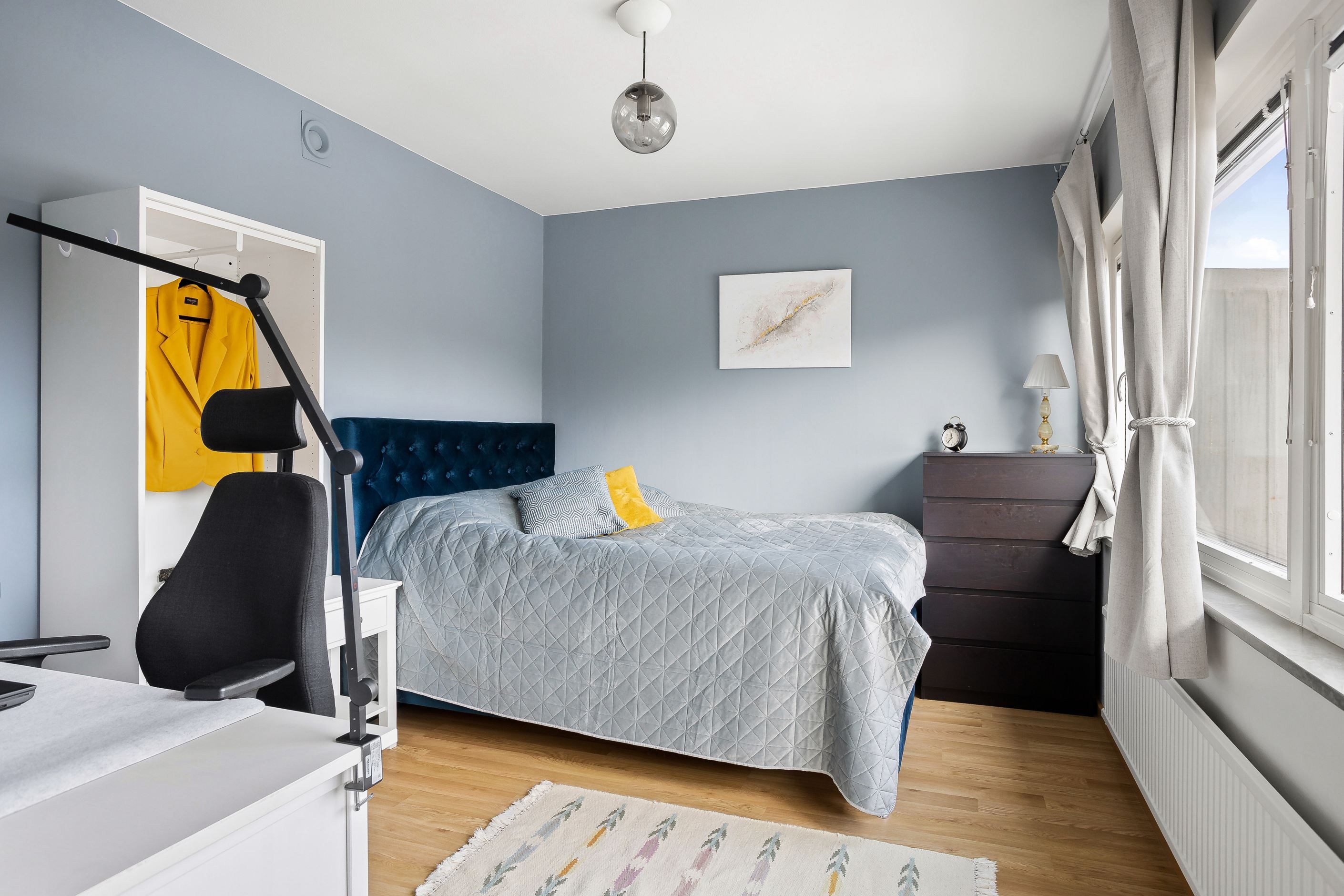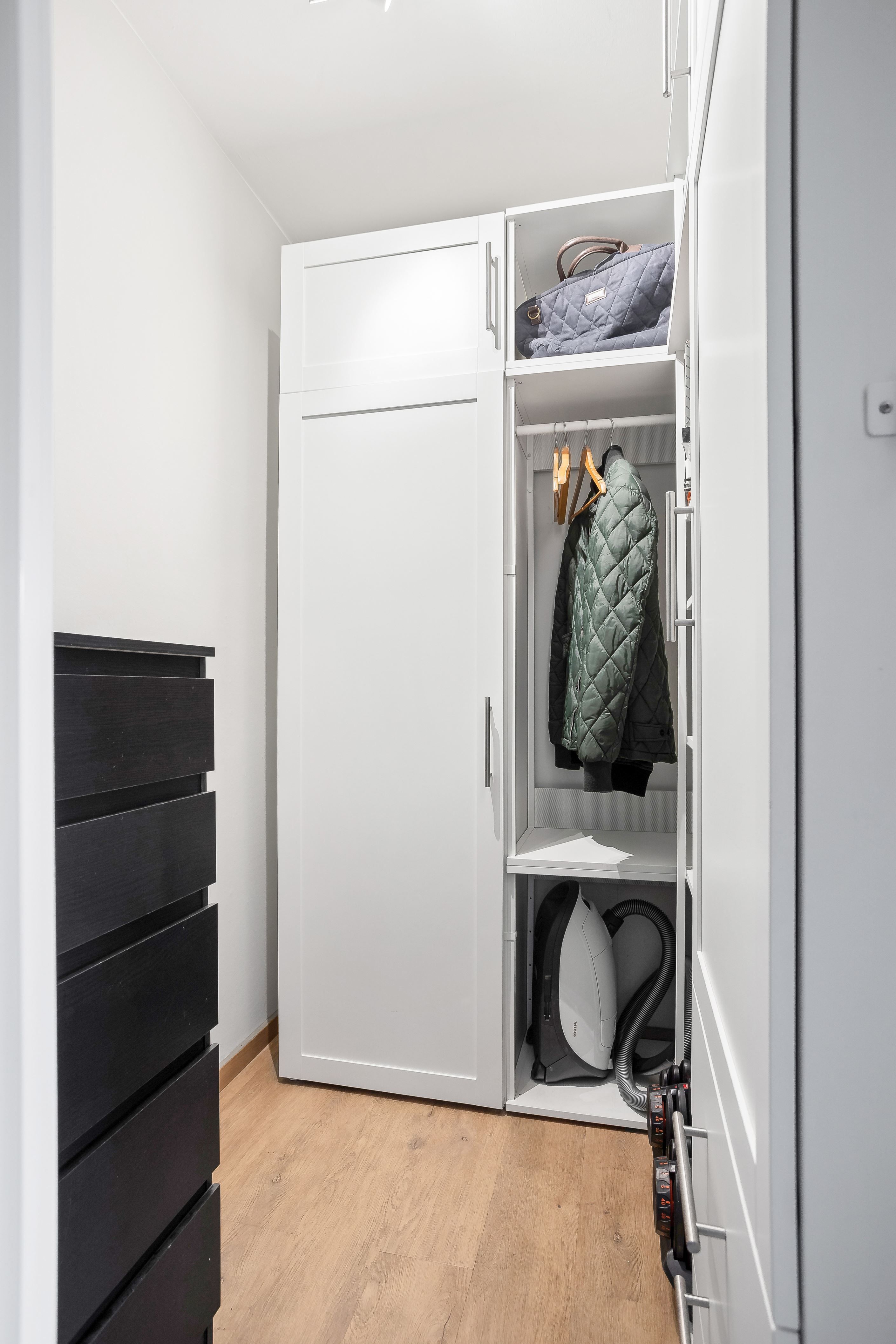 Sovrummet är rofyllt och rymmer dubbelsäng samt förvaring. Utöver detta finns en rymlig klädkammare som erbjuder generöst med förvaringsutrymme – en stor tillgång i en bostad om 45 kvm och något som ytterligare förstärker den smarta planlösningen.