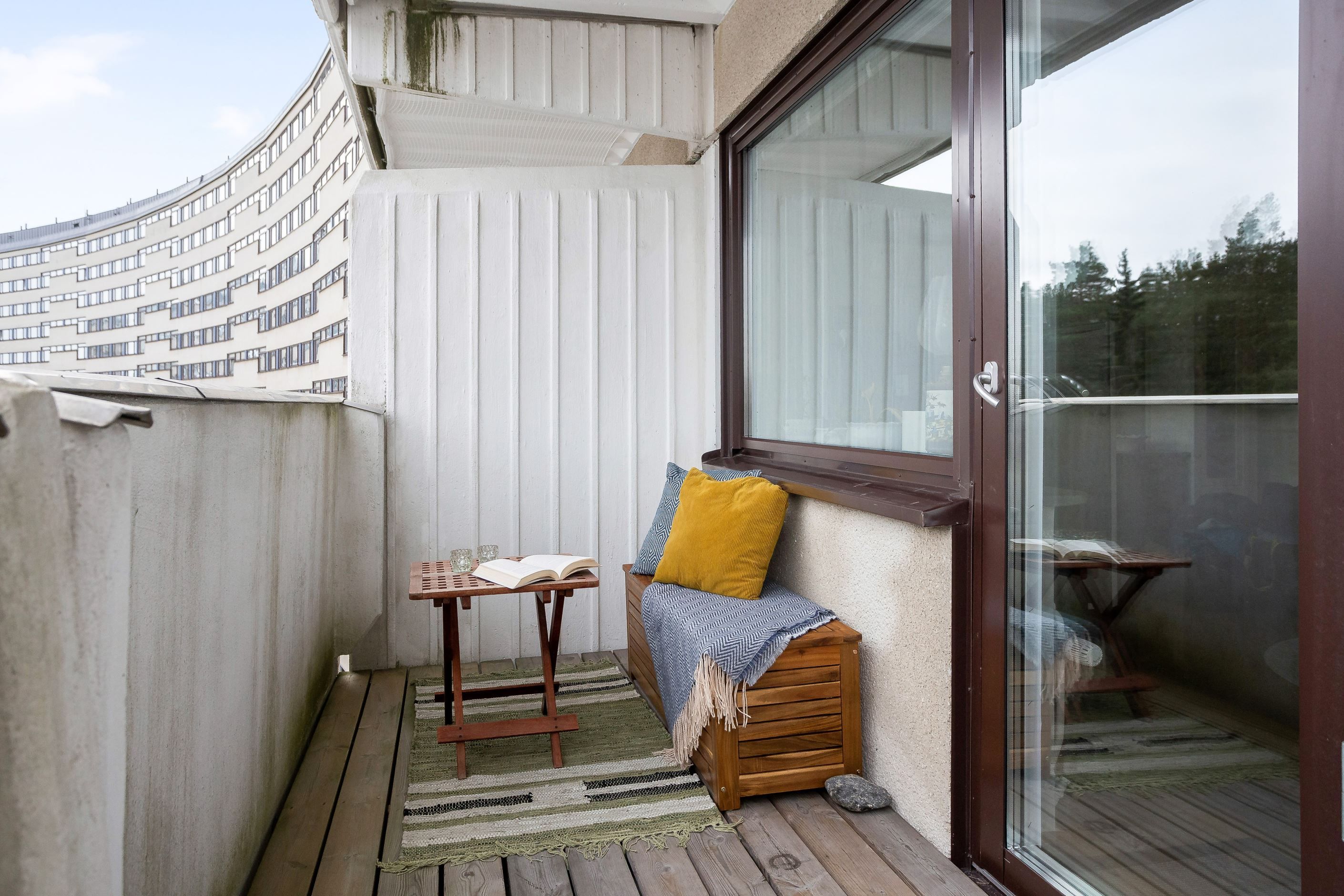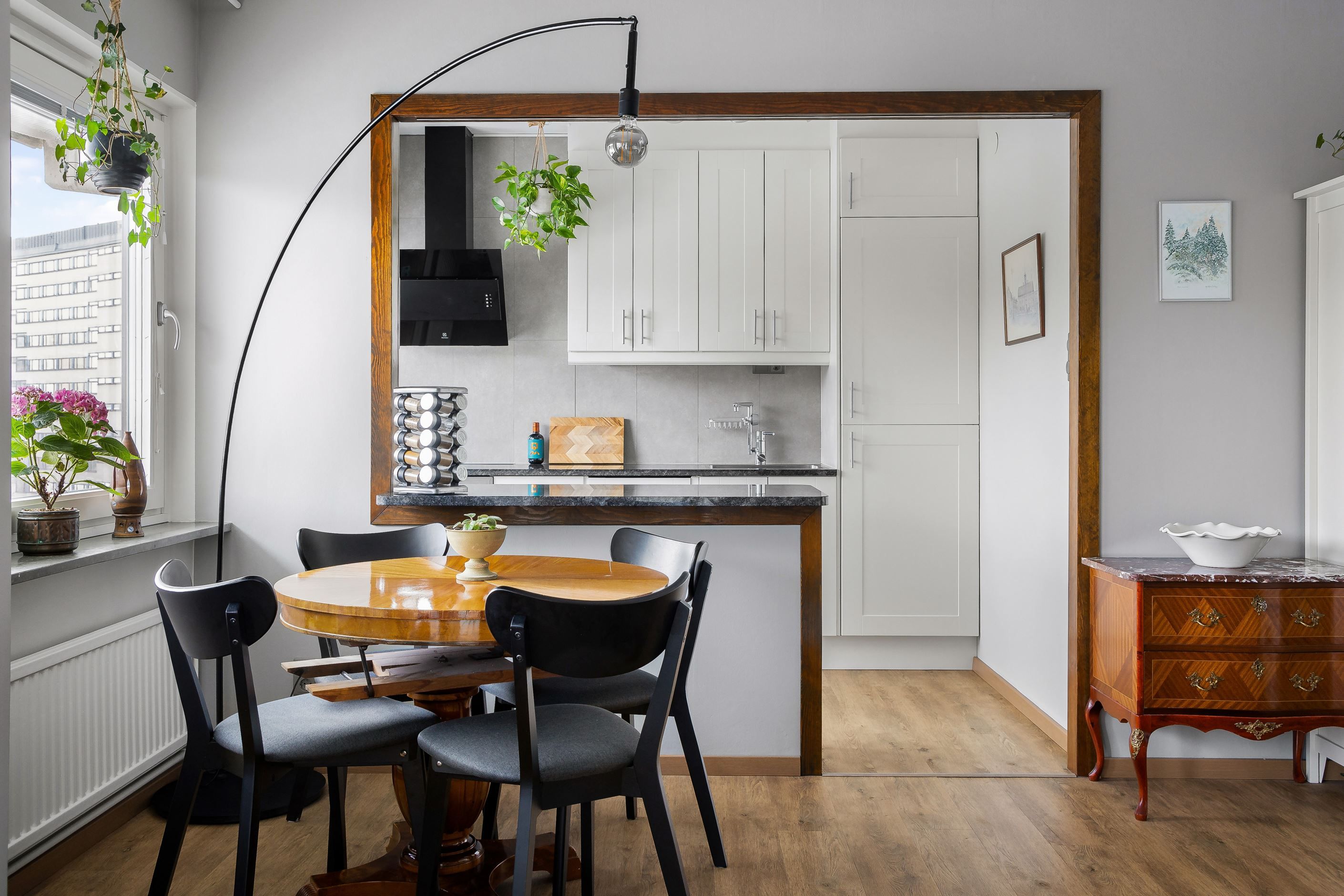 Bostaden erbjuder en genomtänkt planlösning med generösa ljusinsläpp och välutnyttjade kvadratmeter. Vardagsrummet är luftigt och lättmöblerat med plats för både soffgrupp och matplats. Härifrån nås den stora balkongen som vetter mot grönska och natur – en privat oas för morgonkaffet eller avkoppling i solen, helt utan störande insyn.