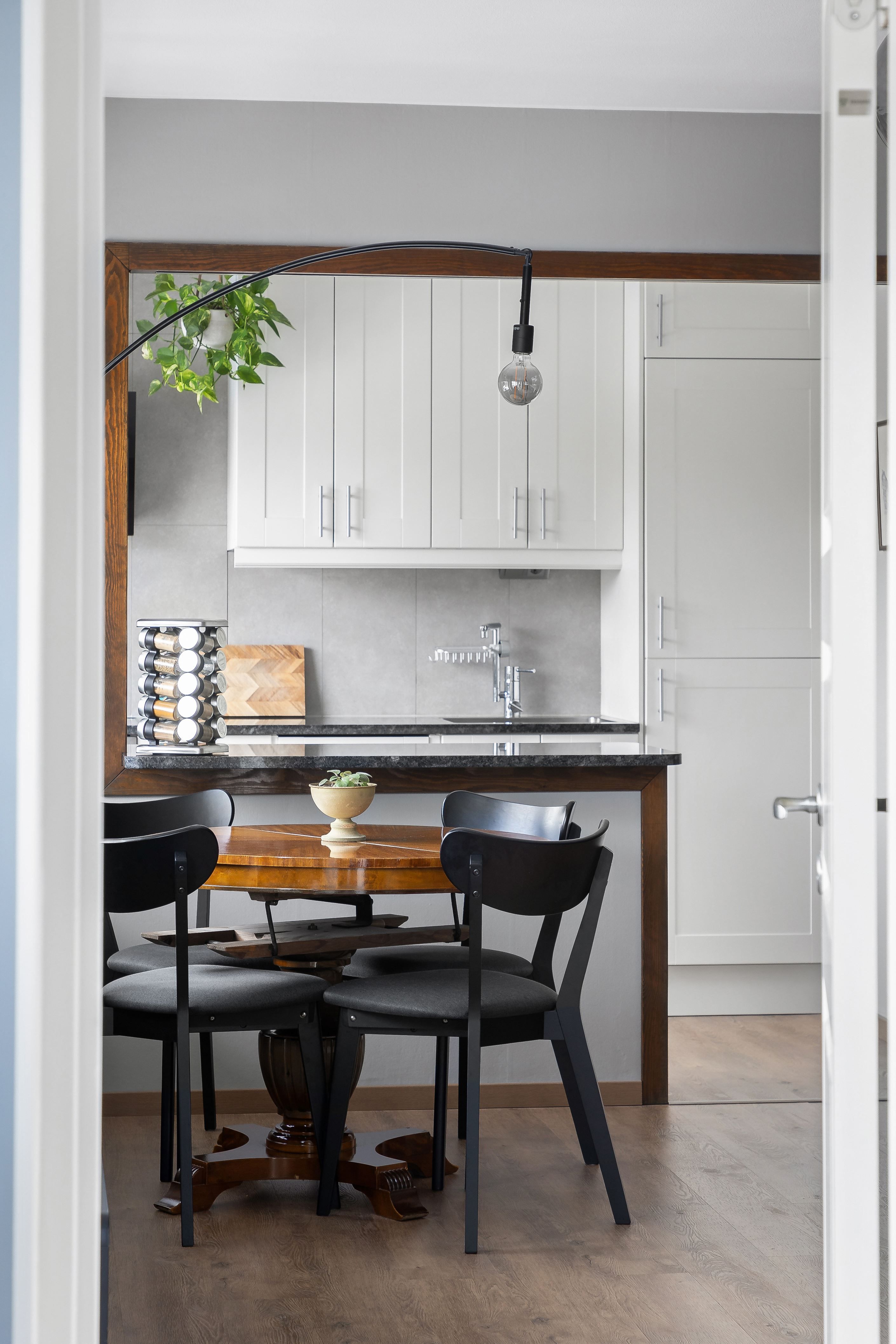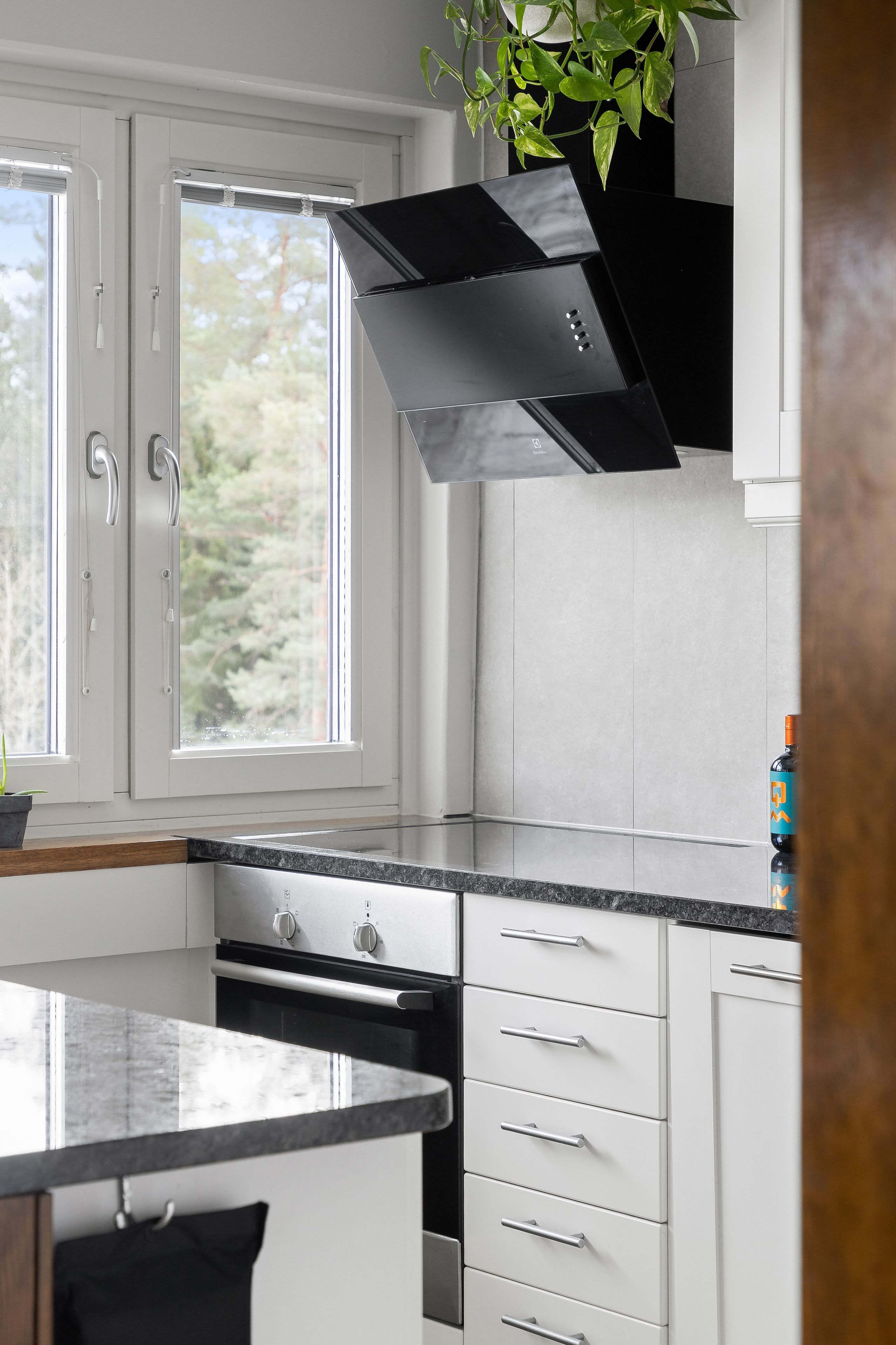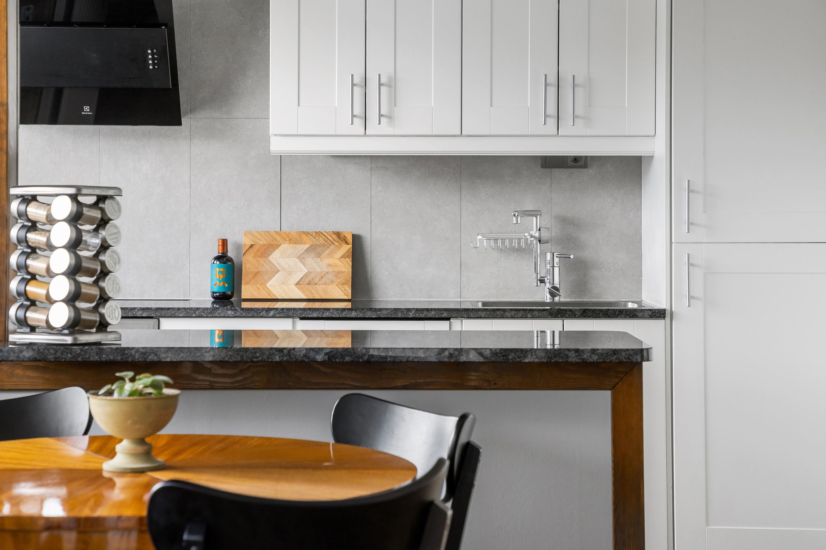Köket är påkostat och stilrent med exklusiva materialval. Den mörka stenskivan skapar en elegant kontrast och ger en lyxig känsla samtidigt som den erbjuder generösa arbetsytor. Köket är utrustat med kvalitetsvitvaror, bland annat en häll från Miele – ett självklart val för den matlagningsintresserade som uppskattar både design och prestanda.