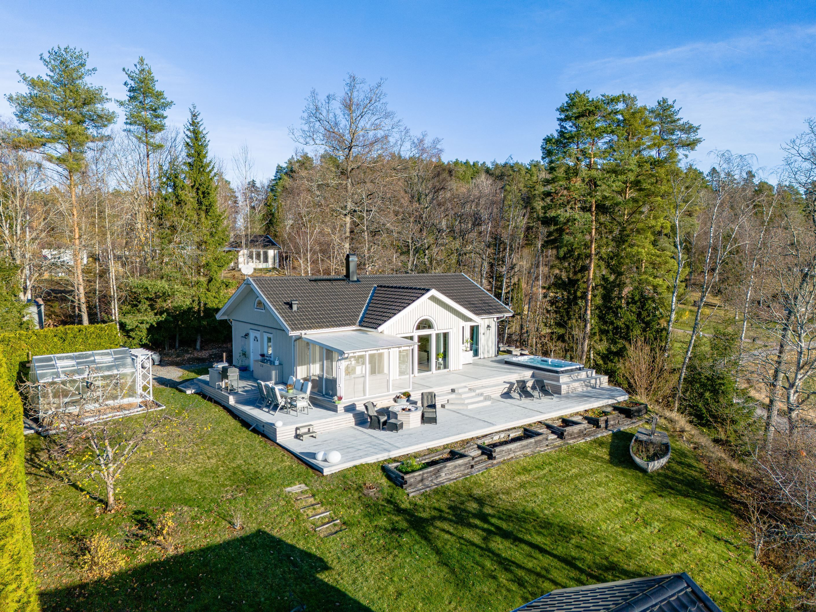 Med ett mycket trevligt läge utan någon granne gränsande till tomten ligger denna fina villa med lyxig känsla och utsikt över ängarna, placerad i rakt söderläge. Den stora altanen i etage utgör en härlig plats med både swim-SPA, grillplats och ett utekök, här finns plats för umgänge både ute och under tak. Förrådet är möjligt att iordningställa till gäststuga för den som vill och på tomten finns rikligt med bärbuskar och fruktträd, allt på gångavstånd till båt- och badplatsen vid Klemmingen.