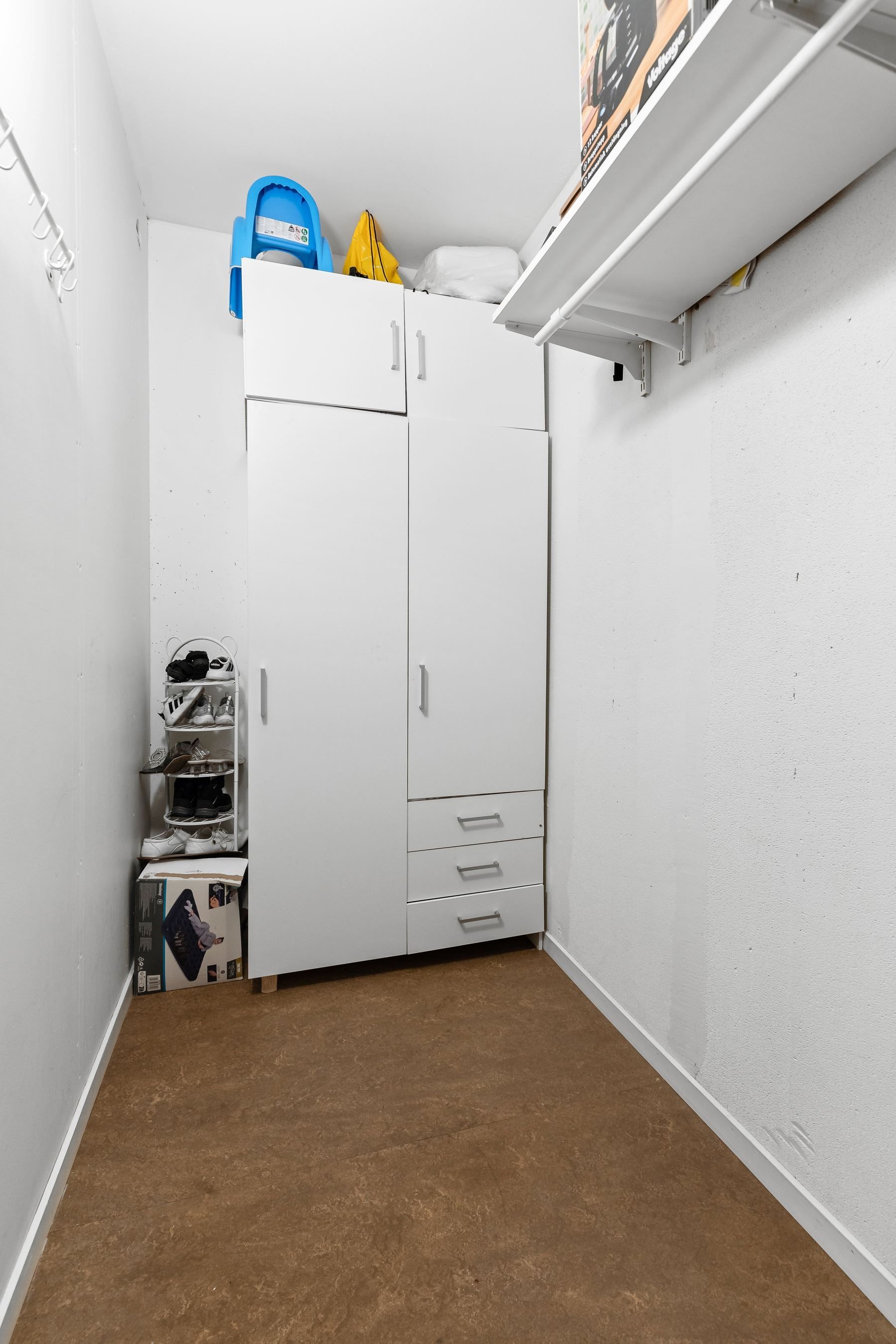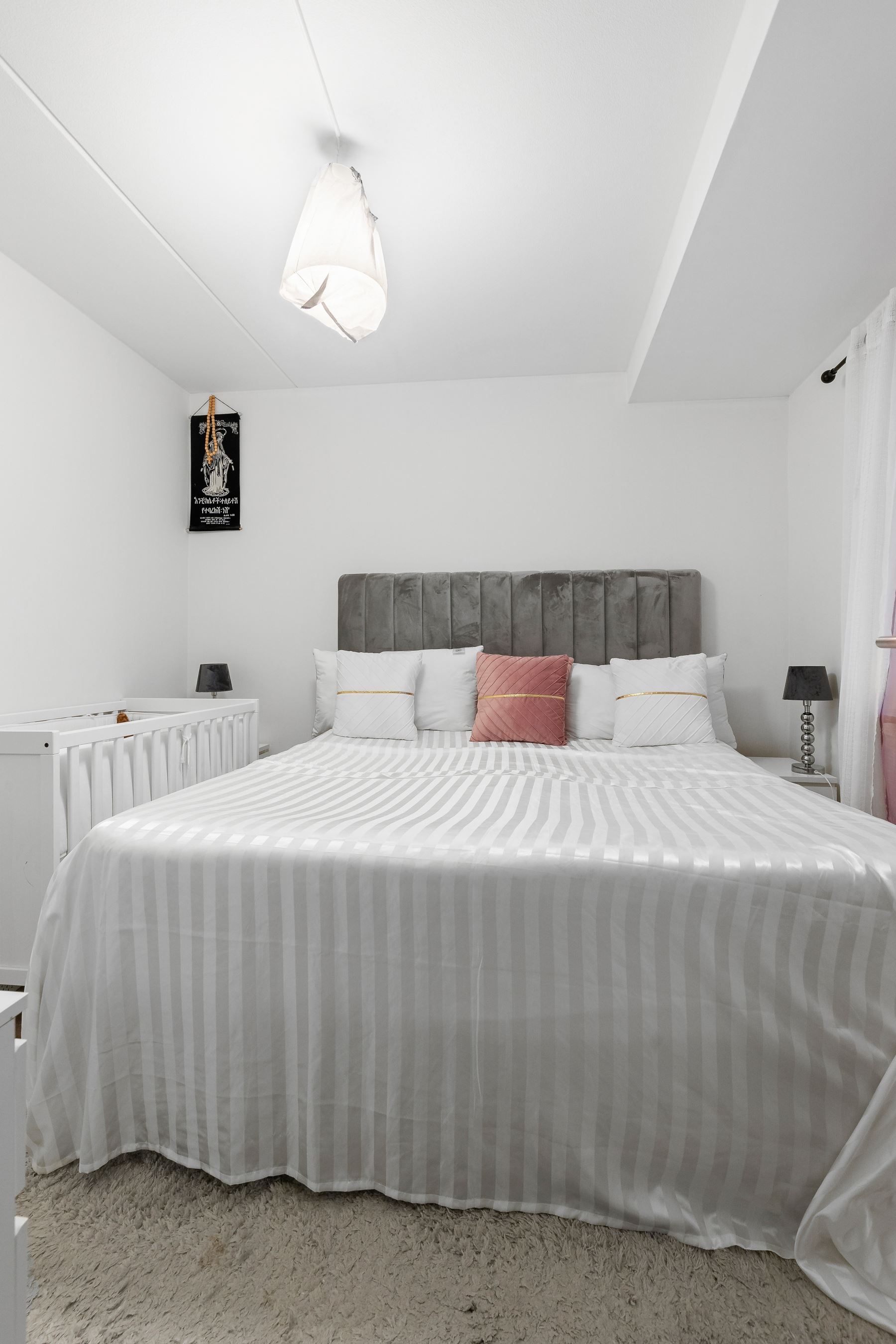 Köket är fullt utrustat med vita vitvaror och har gott om förvaring, perfekt för både matlagning och sällskap. Det rymliga sovrummet har plats för en större säng och har även plats för en stor garderob. Badrummet är stilrent och funktionellt med dusch, toalett och tvättställ.
